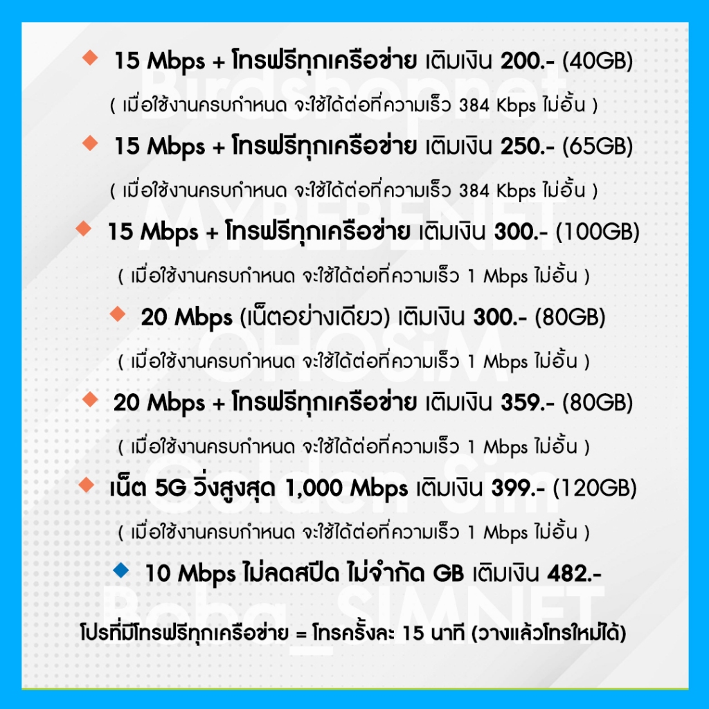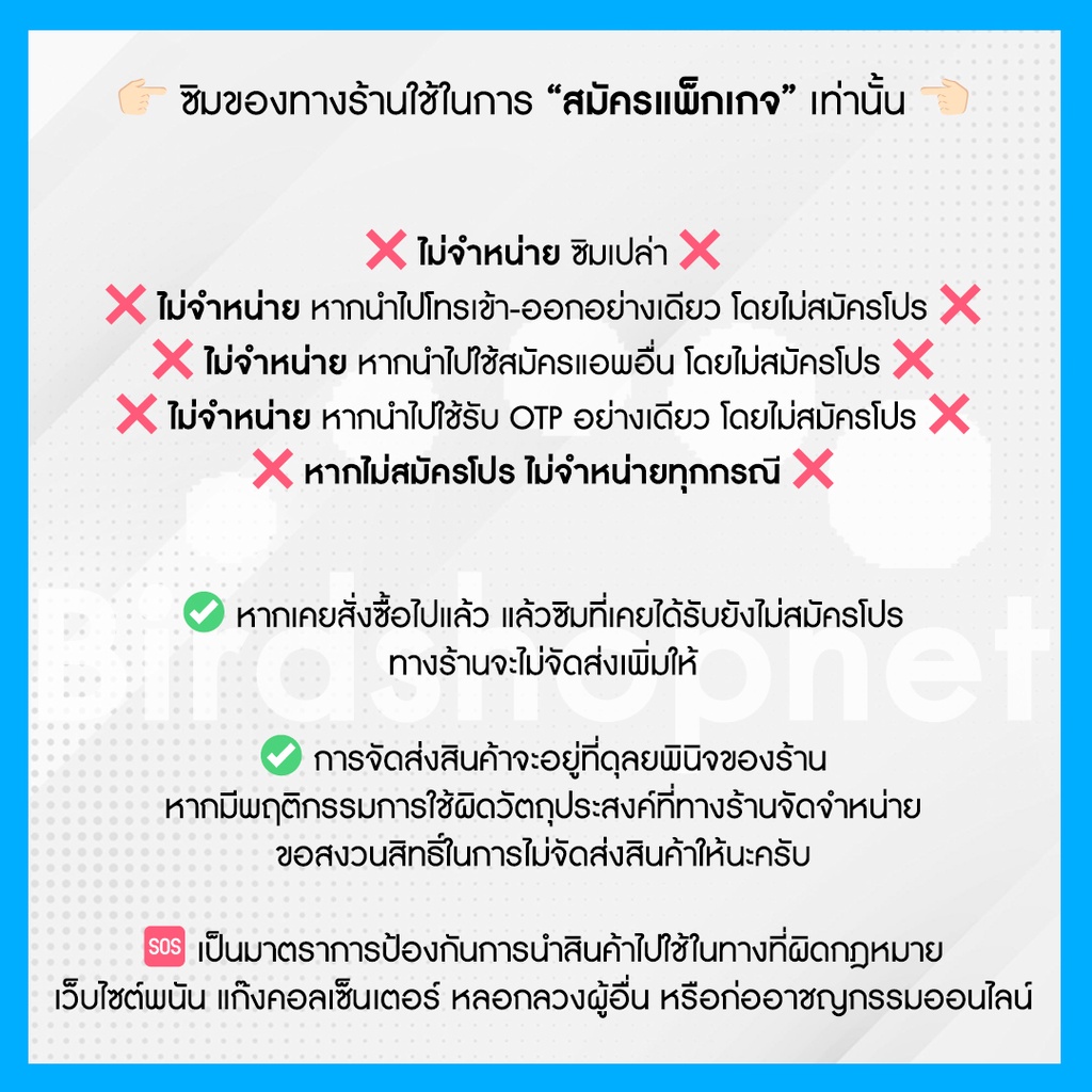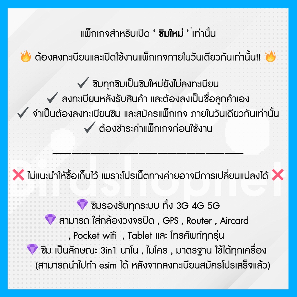 ... ตัดรอบจัดส่งสินค้า 11.00 ของทุกวัน (ส่งของทุกวัน ) ————————————————————————————— 👉🏻 กรุณาอ่านก่อนสั่ง ((สำคัญมาก)) 👈🏻 ‼️ สมัครโปร ภายใน 31 ต.ค. 2567 เท่านั้น ‼️ (หากได้รับสินค้าเกินวัน ทักแชททางร้านเพื่ออัพเดตโปร) 🚫 หากไม่เปิดใช้งาน ซิมจะหมดอายุ 31 ธ.ค. 2567 🚫 ☑️ใบคู่มือที่แนบไปพร้อมสินค้า จะบอกขั้นตอนการลงทะเบียนและสมัครโปร☑️ 🔥 ต้องลงทะเบียนและเปิดใช้งานแพคเกจภายในวันเดียวกันเท่านั้น!! 🔥 🔸 ซิมทุกซิมเป็นซิมใหม่ยังไม่ลงทะเบียน 🔸 ลงทะเบียนหลังรับสินค้าเท่านั้น 🔸 จำเป็นต้องลงทะเบียนซิม และสมัครแพ็กเกจ ภายในวันเดียวกันเท่านั้น 🔸 ชำระค่าแพ็กเกจก่อนใช้งาน 🔸 ไม่เกิน 1 ชม. ทางร้านจะเปิดซิมในระบบให้ ————————————————————————————— ✅ จำเป็นต้องลงทะเบียนและเปิดใช้งาน ภายในวันเดียวกันเท่านั้น!! ❌❌ ไม่แนะนำให้ซื้อเก็บไว้ เพราะโปรเน็ตทางค่ายอาจมีการเปลี่ยนแปลงได้ ❌❌ ————————————————————————————— • แพ็กเกจตามที่โฆษณา อาจมีการปรับเปลี่ยนตามที่บริษัทกำหนด • ⚠️ แนะนำสอบถามแพ็กเกจอัพเดตล่าสุด ณ วันลงทะเบียน ⚠️ 🌐 เน็ตเร็ว 15 Mbps (30+10 = 40GB) + โทรทุกค่าย 📞 โทรฟรีทุกเครือข่าย (ครั้งละ 15 นาที) 💰 200 บาท / 30 วัน (👆🏻เมื่อใช้งานครบกำหนด จะใช้ได้ต่อที่ความเร็ว 384 Kbps ไม่อั้นจนครบ 30 วัน ) เดือนที่ 2-6 แถมเน็ตเพิ่มอีก 20GB รวมได้เน็ต 60GB 🌐 เน็ตเร็ว 15 Mbps (55+10 = 65GB) + โทรทุกค่าย 📞 โทรฟรีทุกเครือข่าย (ครั้งละ 15 นาที) 💰 250 บาท / 30 วัน (👆🏻เมื่อใช้งานครบกำหนด จะใช้ได้ต่อที่ความเร็ว 384 Kbps ไม่อั้นจนครบ 30 วัน ) เดือนที่ 2-6 แถมเน็ตเพิ่มอีก 20GB รวมได้เน็ต 75GB 🌐 เน็ตเร็ว 15 Mbps (80+20 = 100GB) + โทรทุกค่าย 📞 โทรฟรีทุกเครือข่าย (ครั้งละ 15 นาที) 💰 300 บาท / 30 วัน (👆🏻เมื่อใช้งานครบกำหนด จะใช้ได้ต่อที่ความเร็ว 1 Mbps ไม่อั้นจนครบ 30 วัน ) เดือนที่ 2-6 แถมเน็ตเพิ่มอีก 20GB รวมได้เน็ต 120GB 🌐 เน็ตเร็ว 20 Mbps (เน็ตอย่างเดียว 60+20 = 80GB) 💰 300 บาท / 30 วัน (👆🏻เมื่อใช้งานครบกำหนด จะใช้ได้ต่อที่ความเร็ว 1 Mbps ไม่อั้นจนครบ 30 วัน ) เดือนที่ 2-6 แถมเน็ตเพิ่มอีก 20GB รวมได้เน็ต 100GB 🌐 เน็ตเร็ว 20 Mbps (60+20 = 80GB) + โทรทุกค่าย 📞 โทรฟรีทุกเครือข่าย (ครั้งละ 15 นาที) 💰 359 บาท / 30 วัน (👆🏻เมื่อใช้งานครบกำหนด จะใช้ได้ต่อที่ความเร็ว 1 Mbps ไม่อั้นจนครบ 30 วัน ) เดือนที่ 2-6 แถมเน็ตเพิ่มอีก 20GB รวมได้เน็ต 100GB 🌐 เน็ตเร็ว 30 Mbps (เน็ตอย่างเดียว 120GB) 💰 350 บาท / 30 วัน (👆🏻เมื่อใช้งานครบกำหนด จะใช้ได้ต่อที่ความเร็ว 1 Mbps ไม่อั้นจนครบ 30 วัน ) 🌐 เน็ตเต็มสปีด วิ่งสูงสุด 1,000 Mbps (เน็ตอย่างเดียว 100+20 = 120GB) 💰 399 บาท / 30 วัน (👆🏻เมื่อใช้งานครบกำหนด จะใช้ได้ต่อที่ความเร็ว 1 Mbps ไม่อั้นจนครบ 30 วัน ) เดือนที่ 2-6 แถมเน็ตเพิ่มอีก 20GB รวมได้เน็ต 140GB 🌐 เน็ต 10 Mbps ไม่ลดสปีด ไม่จำกัด GB 💰 482 บาท / 30 