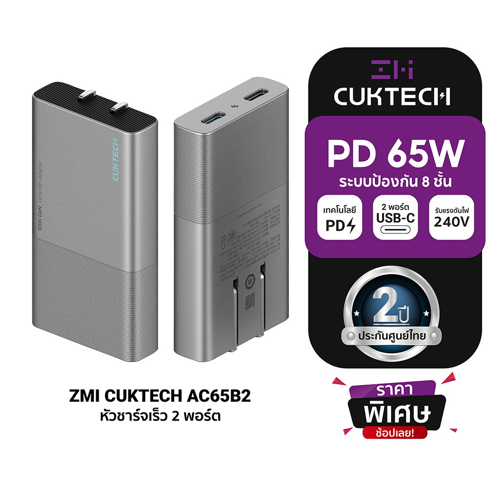 [ราคาพิเศษ] ZMI CukTech AC65B2 GaN3 65W หัวชาร์จ USB-C 2 พอร์ต สำหรับ Phone Pad Mac ระบบป้องกัน 8 ชั้น -2Y