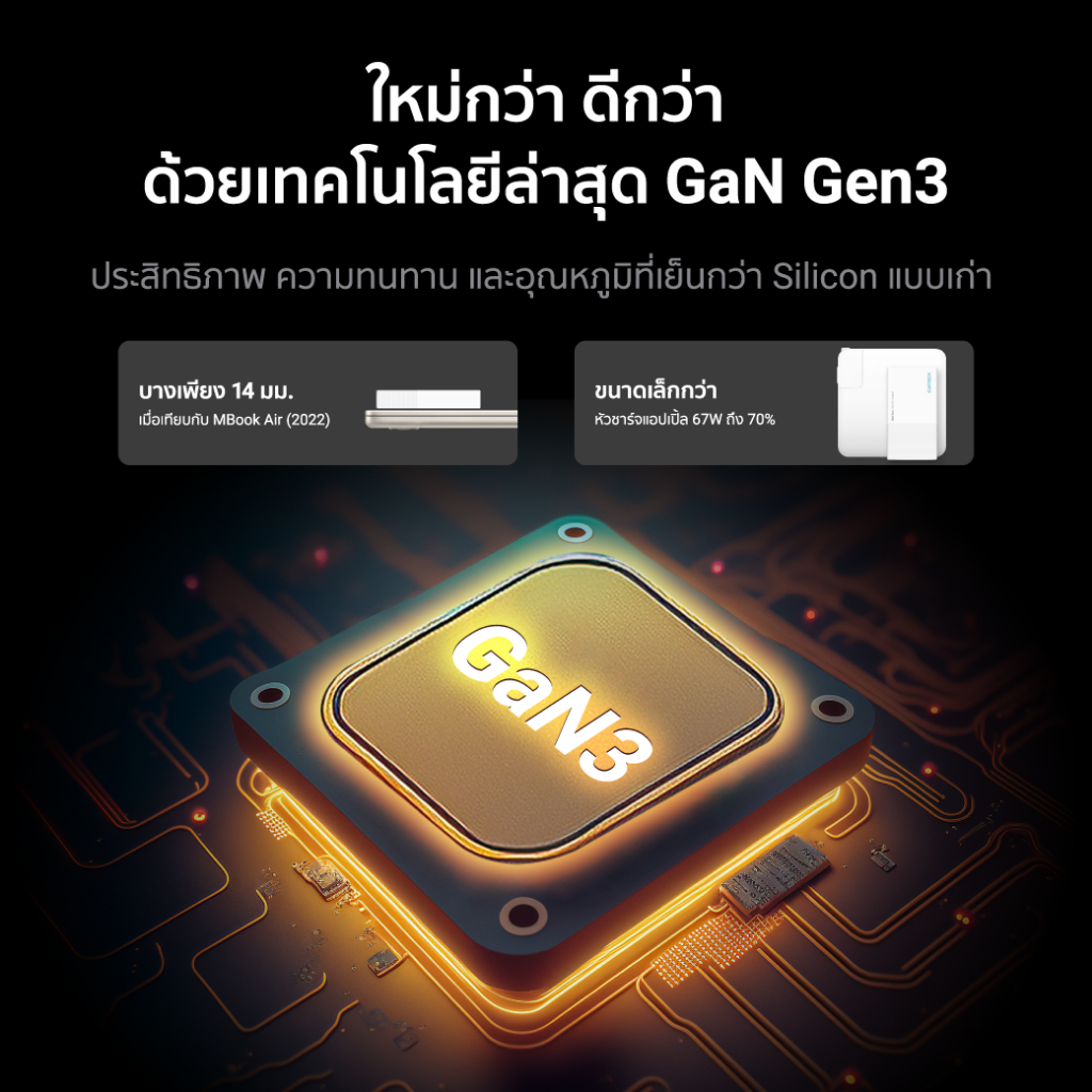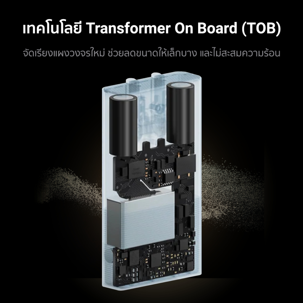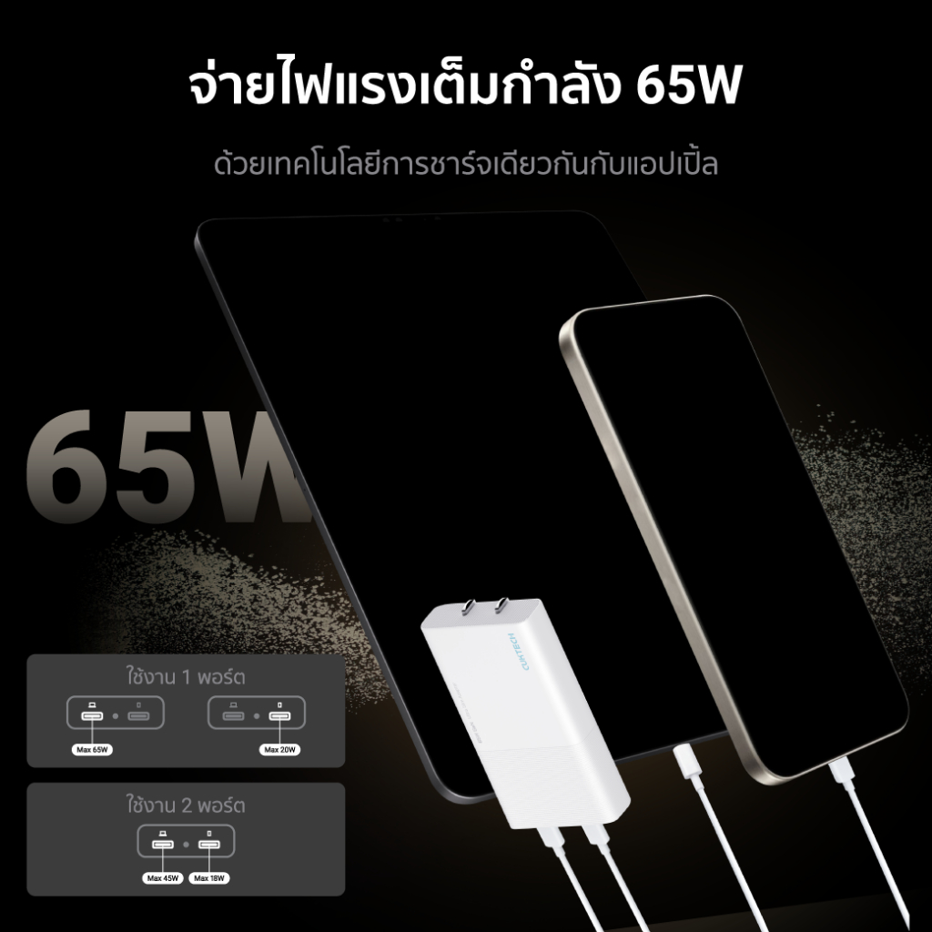 ... ารถสอบถามแอดมินในช่องทางแชทของร้านค้าได้เลยค่ะ ============================== ZMI CUKTECH มีการเปลี่ยนแปลงการรับประกันสินค้า จากปกติรับประกัน 1 ปี เปลี่ยนเป็น รับประกัน 24 เดือน (2 ปี) *การรับประกันสินค้า 24 เดือน (2 ปี) จะครอบคลุมในส่วนของลูกค้าที่สั่งซื้อสินค้าตั้งแต่วันที่ 17 ส.ค. 66 เป็นต้นไป [[ จุดเด่นสินค้า ]] - เล็กกว่า ประสิทธิภาพเหนือกว่าด้วยเทคโนโลยี GaN Gen 3 * เย็นกว่า ทนทานกว่าหัวชาร์จประเภท Silicon - เทคโนโลยีชาร์จ PD3.0 , QC3.0 , PPS 3A , Super Fast Charge (PD & PPS) * 2 พอร์ต USB-C (USB-C1 65W & USB-C2 20W) * ชาร์จ 2 พอร์ตพร้อมกัน (USB-C1 45W & USB-C2 18W) - ขนาดเล็ก พกพาง่าย มีความบางเพียง 1.43 เซนติเมตร * มีขนาดเล็กกว่าหัวชาร์จ Ap 67W ถึง 70% * CukTech 65W GaN (77.3 x 42 x 14.3 มม.) * Ap 67W (74.1 x 74.1 x 28.6 มม.) * พับขาได้ พกใส่กระเป๋าได้ง่าย ไม่สร้างรอยขีดข่วน - เทคโนโลยี TOB ในการจัดเรียงแผงวงจร ทำให้ เล็กบาง และไม่ร้อน [[ รายละเอียดตัวเลือกพร้อมสาย ]] พร้อมสายชาร์จ USB-C to USB-C - ความยาวสายชาร์จ 1.5 เมตร - รองรับกำลังไฟ 5A สูงสุด 100W - การถ่ายโอนข้อมูล 480Mbps (USB2.0) [[ อุปกรณ์ที่รองรับ ]] - ใช้สำหรับ Phone 16 / 16 Plus / 16 Pro / 16 Pro Max - ใช้สำหรับ Phone 15 / 15 Plus / 15 Pro / 15 Pro Max - ใช้สำหรับ Phone 14 / 14 Plus / 14 Pro / 14 Pro Max - ใช้สำหรับ Phone 13 / 13 Mini / 13 Pro / 13 Pro Max - ใช้สำหรับ Phone 12 / 12 Mini / 12 Pro / 12 Pro Max - ใช้สำหรับ Phone 11 / 11 Pro / 11 Pro Max - ใช้สำหรับ Phone X / Xs / Xs Max / Xr / 8 / 8 Plus - ใช้สำหรับ Phone 7 / 7 Plus / 6 / 6 Plus / 5 / 5s / 5c - ใช้สำหรับ Phone SE Gen 1, 2, 3 - ใช้สำหรับ Pad Pro / Pad Air / Pad Mini / Pad - ใช้สำหรับ Samsung S22 / S23 / S24 Series และอุปกรณ์อื่นๆ [[ คุณสมบัติ ]] - รองรับการชาร์จไว สำหรับ Phone , Pad , MBook * Phone 15 Pro Max เต็ม 0-100% ใน 1 ชม. 35 น. * Pad Pro 11 นิ้ว เต็ม 0-100% ใน 1 ชม. 48 น. * สามารถใช้งานกับ มือถือ, แท็บเล็ต, แล็ปท็อป, Switch และอื่นๆ - อัดแน่นด้วยคุณภาพ และมาพร้อมระบบป้องกันอุณหภูมิเกินขั้นสูง - ตัดไฟรวดเร็วในเวลาเพียง 0.1 วินาที - ความถี่ในการตรวจจับถึง 36,000 ครั้ง / ชั่วโมง - ปลอดภัย และมั่นใจได้มากกว่าด้วยระบบความปลอดภัยถึง 8 ชั้น - ระบบป้องกันแรงดันไฟเกิน - ระบบป้องกันกระแสไฟเข้าเกิน - ระบบป้องกันกระแสไฟออกเกิน - ระบบป้องกันไฟกระชาก - ระบบป้องกันไฟฟ้าลัดวงจร - ระบบป้องกันอุณหภูมิเกิน - ระบบป้องกันแม่เหล็กไฟฟ้า - ระบบต้านทานไฟฟ้าสถิต [[ ข้อมูลสินค้า ]] แบรนด์ : CukTech รุ่น : CukTech GaN 65W Model : AC65B2 Input1 : 100-130V ~ 50/60Hz 1.8A Output1 (C1) : 5V𝌂3A , 9V𝌂3A , 12V𝌂3A , 15V𝌂3A 20V𝌂2.25A , (5V~20V)𝌂2A Output1 (C2) : 5V𝌂3A , 9V𝌂2.2A , 11V𝌂1.8A , 12V𝌂1.67A Output1 (C1 + C2) : 18W+18W 40W+5W 45W Max Input2 : 200-240V ~ 50/60Hz 1.5A Output2 (C1) : 5V𝌂3A , 9V𝌂3A , 12V𝌂3A , 15V𝌂3A 20V𝌂3.25A , (5V~20V)𝌂3A Output2 (C2) : 5V𝌂3A , 9V𝌂2.2A , 11V𝌂1.8A , 12V𝌂1.67A Output2 (C1 + C2) : 45W+18W 63W Max ขนาดสินค้า : 77.3 x 42 x 14.3 มิลลิเมตร น้ำหนัก : 86.5 กรัม [[ อุปกรณ์ภายในกล่อง ]] 1x CukTech GaN 65W 1x คู่มือการใช้งาน ---------------------------------------- -️ เงื่อนไขการรับประกัน -️ ตัวผลิตภัณฑ์สินค้ารับประกัน 2 ปี ภายใต้เงื่อนไขที่กำหนด โดยเป็นความเสียหายที่เกิดจากการผลิตและไม่รวมถึงความเสียหายที่เกิดจากการใช้งานที่ผิดประเภท โดยมีเงื่อนไขดังนี้ - รั