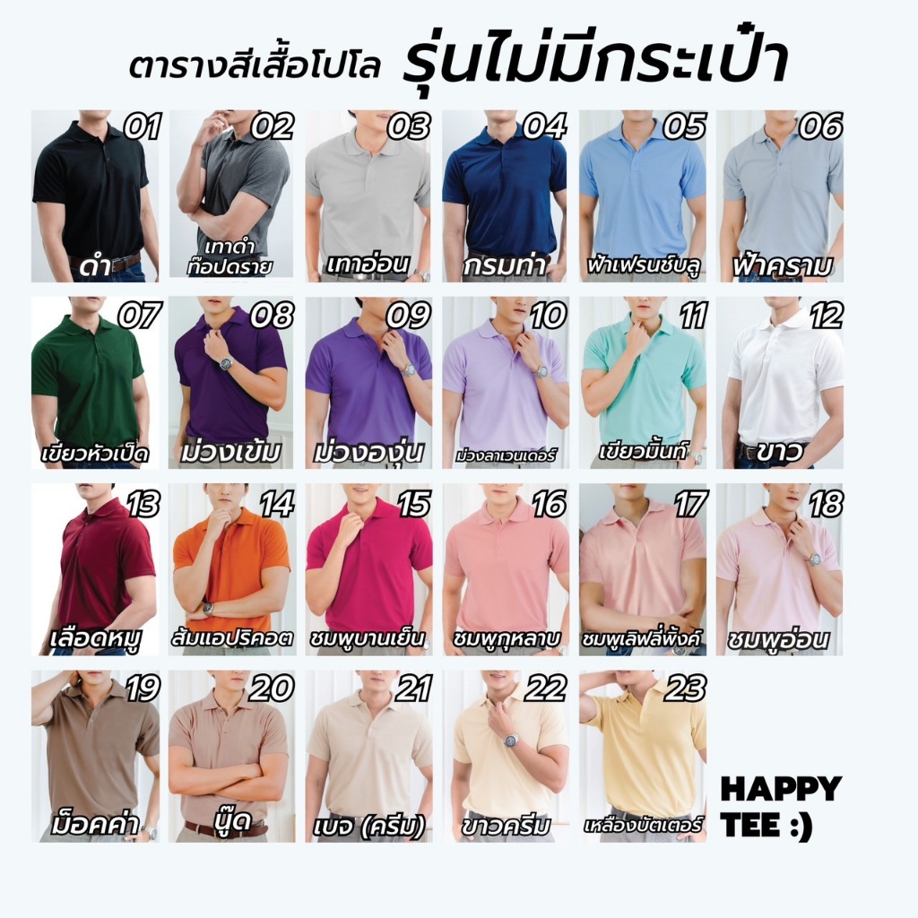 HAPPY TEE ท้าให้ลอง!! เสื้อโปโล ทรงสวย "ไม่มีกระเป๋า" สีสวย ตรงปก ผ้านุ่มไม่ต้องรีด มีถึงรอบอก 61"