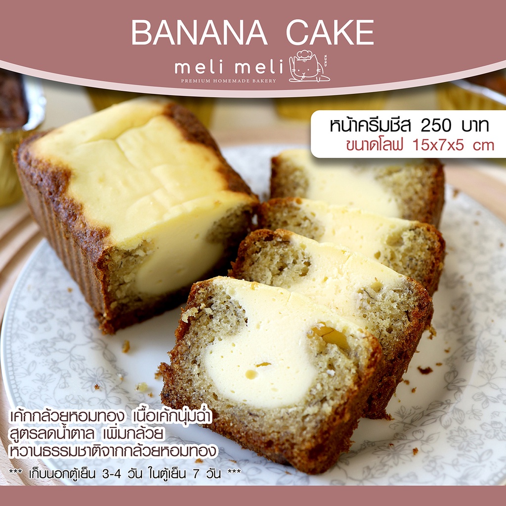 ... ปด้วยกล้วยสด ได้รสกล้วยเต็มๆคำ 🍌 หน้ากล้วย อัลมอนด์ (200฿ หนัก 300 กรัม) เค้กเนื้อนุ่ม ใช้น้ำตาลออแกนิก ลดน้ำตาลจากเค้กทั่วไปเกือบครึ่ง!!! ท้อปด้วยกล้วยสด ได้รสกล้วยเต็มๆคำ และอัลมอนด์กรุบกรอบ 🍌 หน้ากล้วย ช็อกชิพ 70% (200฿ หนัก 300 กรัม) เค้กเนื้อนุ่ม ใช้น้ำตาลออแกนิก ลดน้ำตาลจากเค้กทั่วไปเกือบครึ่ง!!! ท้อปด้วยกล้วยสดฉ่ำๆ ตัดรสด้วยดาร์กช็อคแท้เข้มๆ ❗️ช็อกชิพอาจเกิด Sugar Bloom ลักษณะเป็นจุดๆ ไม่ใช่รา ทานได้ปกติ เกิดจากอุณหภูมิเปลี่ยนแปลง ทำให้น้ำตาลในช็อกตกผลึกออกมาเป็นจุด ** เวฟ 30 วิ sugar bloom จะลาย ช็อกเงาเยิ้มเหมือนเดิมค่ะ 🍌 เค้กกล้วยหอมครีมชีส (250฿ หนัก 350 กรัม) เค้กสูตรหวานน้อย ใช้น้ำตาลออแกนิก ลดน้ำตาลจากเค้กทั่วไปเกือบครึ่ง!! ทานแบบสบายใจ อิอิ แต่เพิ่มความละมุนด้วยครีมชีสนัวๆจุกๆ มันเข้ากันสุดๆไปเลยค่า 🍌 เค้กกล้วยหอม หน้านูเทลล่า (250฿ หนัก 350 กรัม) เค้กสูตรหวานน้อย ใช้น้ำตาลออแกนิก ลดน้ำตาลจากเค้กทั่วไปเกือบครึ่ง!! ท้อปด้วยนูเทลล่าแน่นๆ ความอร่อยของนูเทล่า มันยกระดับความฟินสุดๆเลยค่า ========================= ⚠️อยู่นอกตู้เย็นได้ 3-4 วัน ได้รับแล้วควรแช่เย็นทันที เก็ในตู้เย็นได้ 7 วัน >> ทานแบบแช่เย็น เนื้อจะแน่น >> ทานที่อุณหภูมิห้อง หรือเวฟ30วิ เค้กจะนุ่มเบาขึ้น
