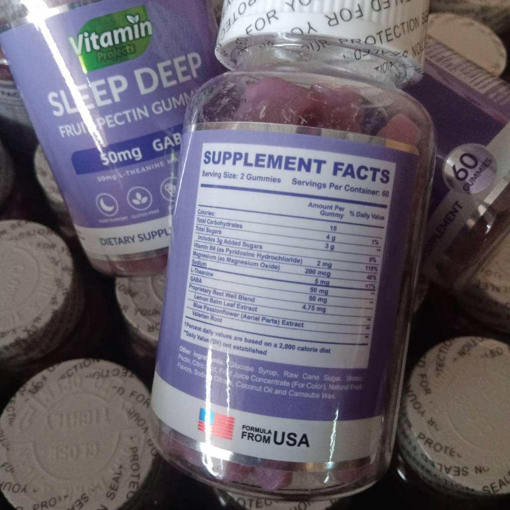 Vitamin Projects GABA sleep Gummies กัมมี่ช่วยให้นอนหลับ หลับลึก ผ่อนคลาย [สีน้ำเงินม่วง] [60 กัมมี่] [1 กระปุก] ในรูปเป็นสินค้าล็อตเก่าค่ะ วิตามินเสริมการนอนหลับชนิดกัมมี่ ที่จะช่วยให้รู้สึกผ่อนคลาย และทำให้นอนหลับอย่างเต็มอิ่ม มี GABA 50 mg. และ L-theanine 50 mg. ช่วยเพิ่มประสิทธิในการน
