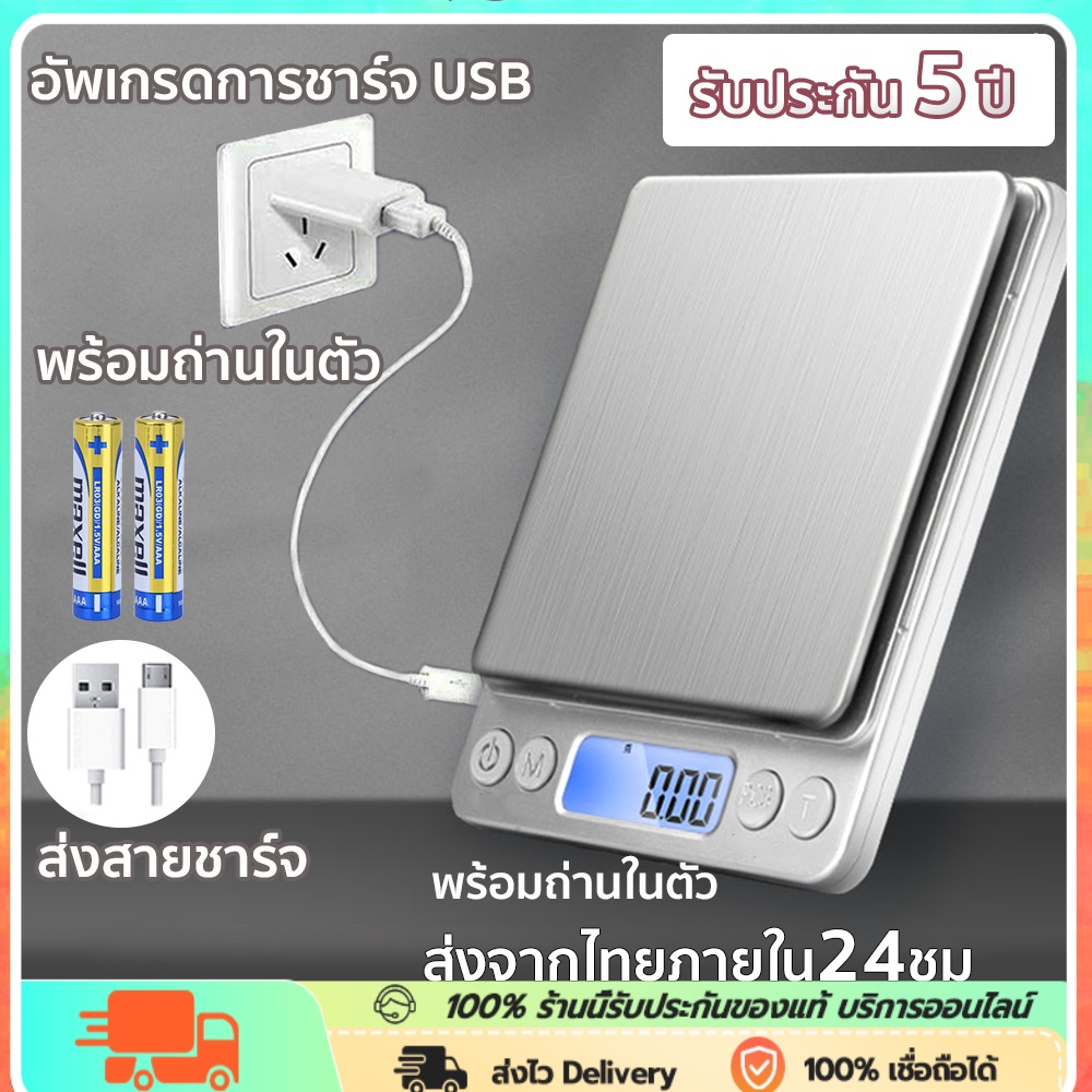 ... ักดิจิตัลสำหรับการชั่งน้ำหนัก milks, ผง, ผัก, ผลไม้, ไข่, เครื่องประดับ, ชา, วัสดุยา, ฯลฯ. หน้าจอ LCD ขนาด 1.7 นิ้วพร้อมแสงไฟสีฟ้า มาพร้อมถาดใส ขนาดเล็ก ขนาดใหญ่ เครื่องชั่งอาหารดิจิตอล ชาร์จได้ ไม่ต้องใส่ถ่าน **แถมฟรีสาย Micro USB** ร้านจำหน่าย 2 รุ่น 0.01-500 กรัม (0.5 kg) ชั่งได้ละเอียดกว่า มีทศนิยม 2 ตำแหน่ง 0.1-3000 กรัม (3 kg) ชั่งได้เยอะกว่า มีทศนิยม 1 ตำแหน่ง +++ ถอดฝาครอบถาดออกก่อนใช้งาน +++ - ถาดชั่งน้ำหนักทำมาจากสแตนเลส- ตัดน้ำหนักภาชนะได้ - ชั่งได้ 9 หน่วยวัด : g / ml /tl/ct/dwt/ozt/oz/gn/lb - คำนวณจำนวนของได้โดยไม่ต้องนับเอง!! - หน้าจอแสดงผล LCD จอสว่าง ทำให้เห็นตัวเลขชัดเจน- แบตอึด ใช้ได้นาน ชาร์จ 1 ครั้ง แบตเตอรี่อยู่ได้เป็นเดือน - ชั่งน้ำหนักได้แม่นยำ ตั้งแต่ 0.1 กรัม ถึง 3 กิโลกรัม - เครื่องเล็กกระทัดรัด พกพาสะดวก - ขนาดเครื่อง 10 x 13 x 1.5 ซม