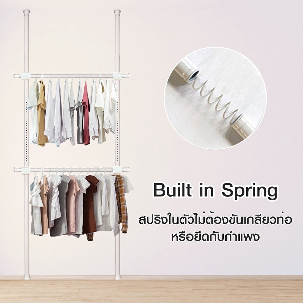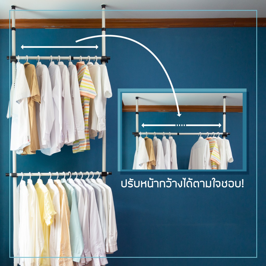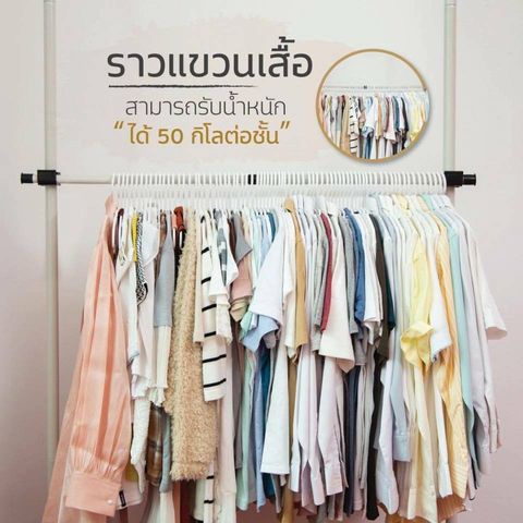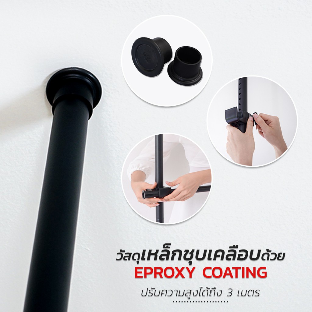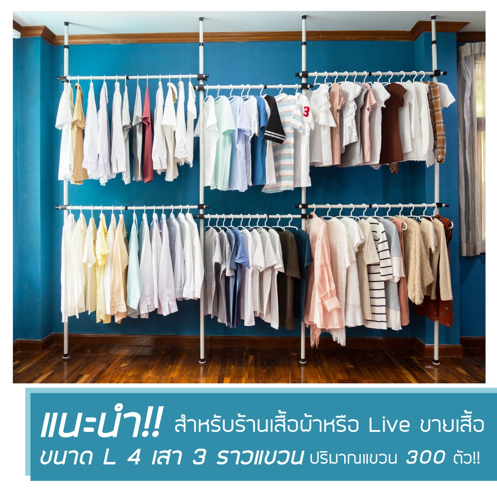 ... ง: 2.1-3.3 เมตร (ชุดใหญ่) (เพื่อความแข็งแรง แนะนำขยายไม่เกิน 1 m./ราว) ความสูง : ใช้ได้กับเพดานสูง 2.0 – 3.1 เมตร จำนวนราวแขวน: ชุดใหญ่: 6 ราวแขวน สี : ขาวล้วน ,ขาวข้อต่อดำ ,ดำ ,ลายไม้ รับน้ำหนักได้มากสุด: 50 กิโลกรัมต่อราวแขวน (เสื้อยืดประมาณ 100 ตัว) ============== ใช้ได้กับพื้นผิว: พื้นไม้/ปูน/อิฐ/ฝ้าฉาบเรียบ/กระเบื้อง/หินอ่อน และอื่นๆ บรรจุภัณฑ์: Carton Box การรับประกัน: รับประกันสินค้า 90 วันนับจากวันได้รับสินค้า