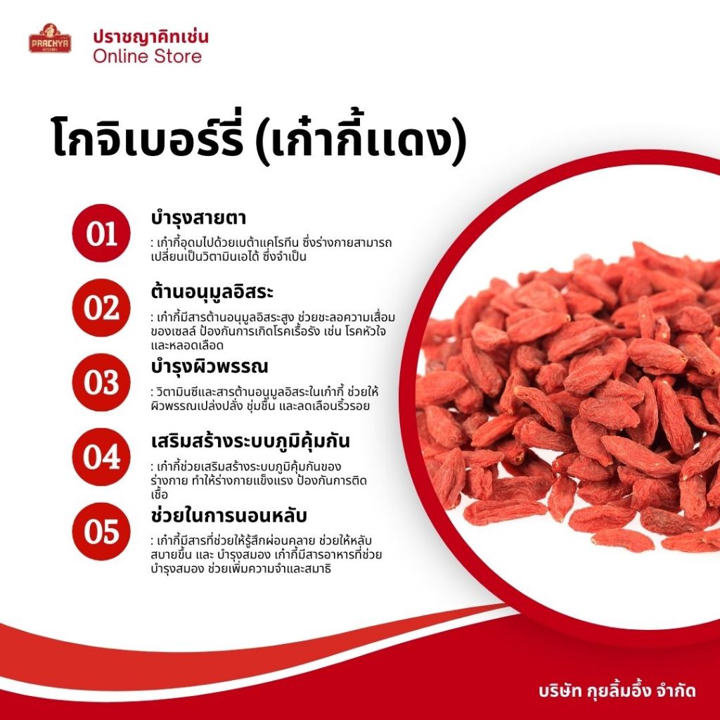 ปราชญาคิทเช่น ( Prachya Kitchen)👍 ขายดีที่สุด อบแห้งพร้อมทาน เม็ดแดงเม็ดใหญ่ สีแดงส้มที่มีสารต้านอนุมูลอิสระและวิตามินซีสูง เม็ดเก๋ากี้สามารถ ชงดื่ม นำมาปรุงอาหาร หรือ ทานเล่น สรรพคุณ • ช่วยบำรุงสายตา • แก้อาการอ่อนเพลีย • ช่วยให้หัวใจแข็งแรง ช่วยสร้างเม็ดเลือด • บำรุงผิว ชะลอความชรา