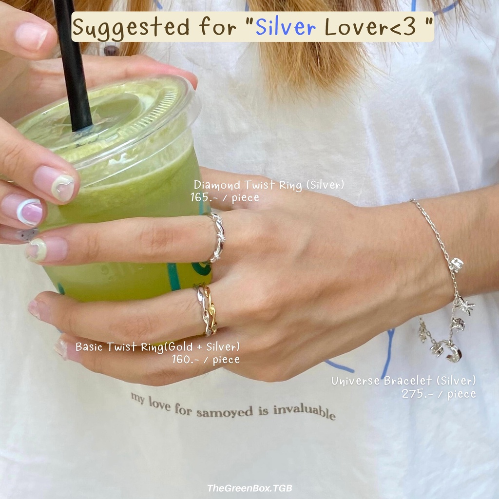 1.) แหวน Diamond Twist Ring * ราคา: 165.- / วง 2.) แหวน Basic Twist Ring * ราคา: 160.- / วง *Size: Free Size สามารถปรับได้ตามขนาดที่ต้องการด้วยการบีบ * material: Brass + Silver เเพ้ง่ายใส่ได้ สามารถดดนนํ้าได้บ้าง * ข้อควรระวัง หลีกเลี่ยงแอลกอฮอล์ และ ความชื้น