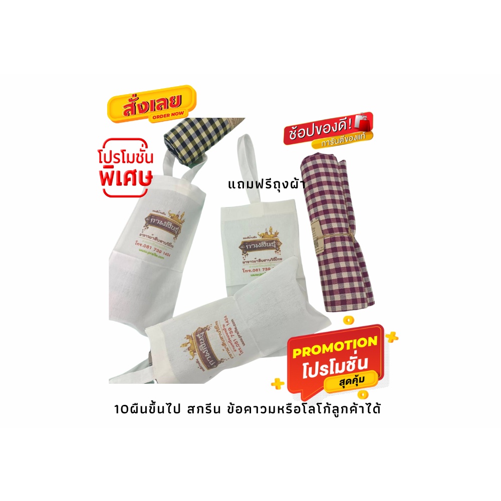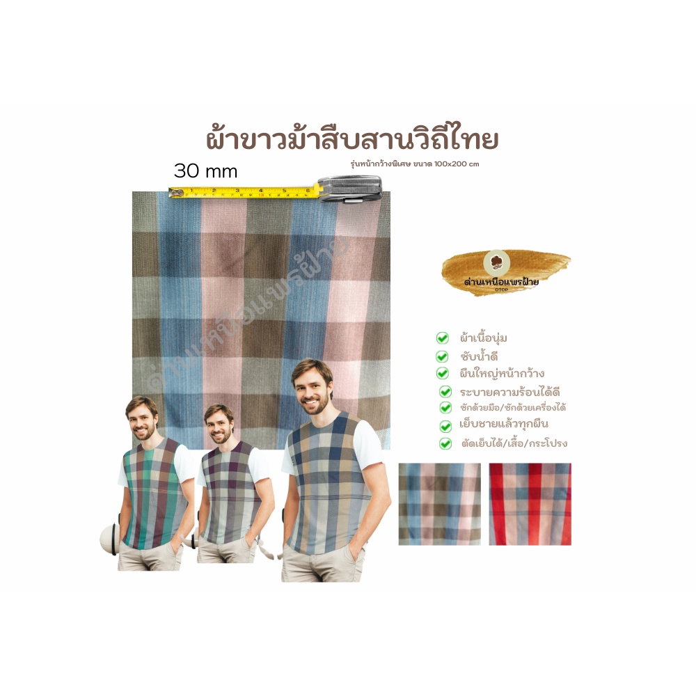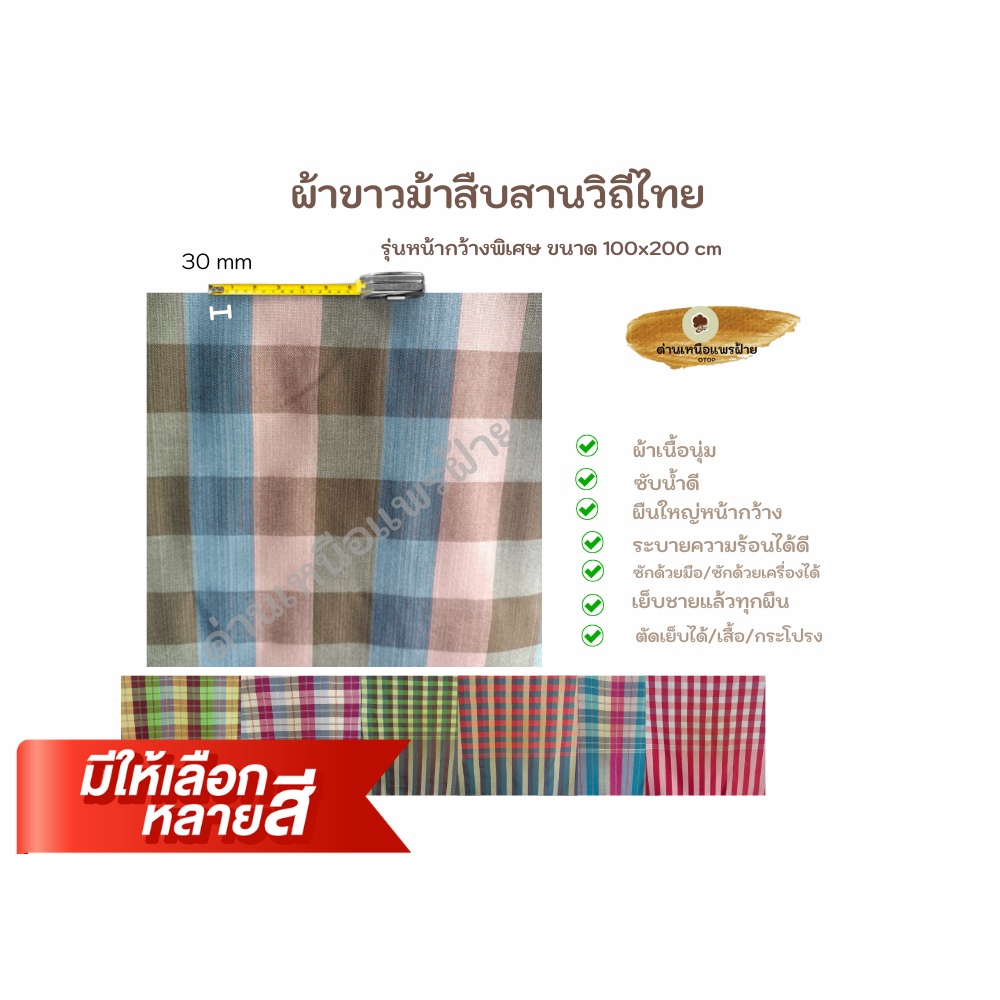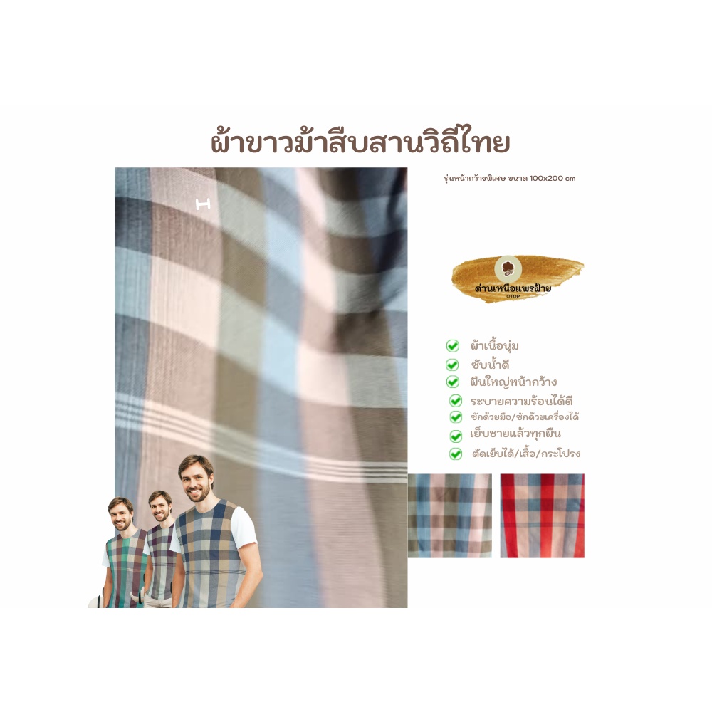 ... กระบวนการผลิต;ทำด้วยมือ วิธีใช้ ผ้าเอนกประสงค์ เป็นของฝาก ของที่ระลึก ใช้เป็นผ้าเช็ดตัว นุ่งอาบน้ำ ผ้าขาวม้า เป็นผ้าสารพัดประโยชน์ที่คนไทยใช้มาแต่โบราณ ส่วนใหญ่ผู้ใช้จะเป็นเพศชาย สามารถใช้นุ่งอาบน้ำ เช็ดตัว คลุมหัวกันแดด วิธีการบำรุงรักษา ซักในน้ำสะอาด ไม่ใช้สารฟอกขาว ตากในที่รมลมโกรก ซักด้วยมือหรือเครื่องซักผ้าได้ -ความโดดเด่นของผ้าขาวม้ารุ่นนี้คือเนื้อผ้าค่ะ เนื้อผ้าเป็นผ้าฝ้าย 100% *เนื้อดีมาก หนานุ่มกว่ารุ่นอื่นๆ *ซับน้ำได้ดีมาก *เนื้อนิ่มกว่าผ้าอื่นๆเพราะเป็นผ้าฝ้าย รับประกันว่าไม่ใช่ผ้าเนื้อแข็ง ---------------------------------------------- วิธีใช้ -ใช้เป็นของสมนาคุณ หรือของฝากก็เหมาะมากๆ -ใช้ปูโต็ะ หรือใช้ตัดเป็นเสื้อผ้าก็ได้ และอื่นๆอีก -ใช้นุ่งอาบน้ำ -ใช้พันคอ ผูกเอวต้อนรับ -ใช้ประดับทำซุ้มจัดแสดง หรือจัดงานต่างๆ -ใช้เป็นของชำร่วย งานแต่ง งานศพ ก็เหมาะ ผ้าขาวม้า เป็นผ้าสารพัดประโยชน์ที่คนไทยใช้มาแต่โบราณ ส่วนใหญ่ผู้ใช้จะเป็นเพศชาย สามารถใช้นุ่งอาบน้ำ เช็ดตัว คลุมหัวกันแดด