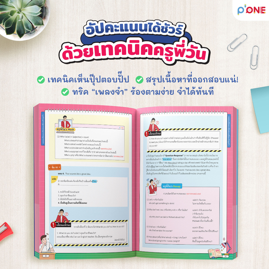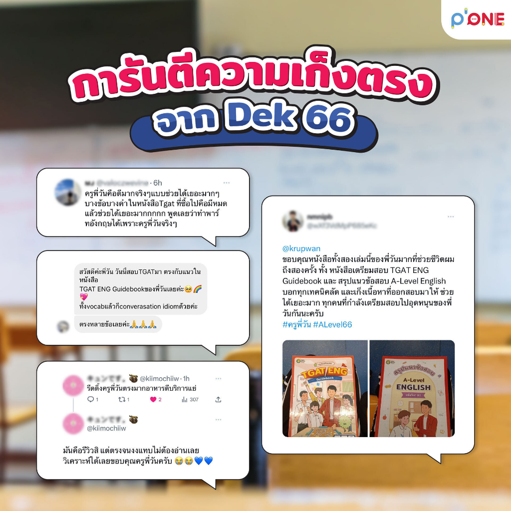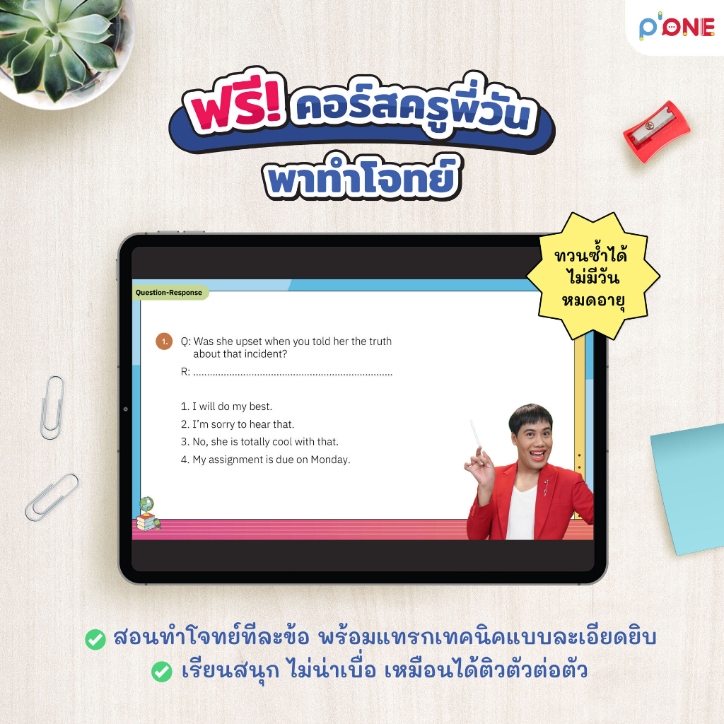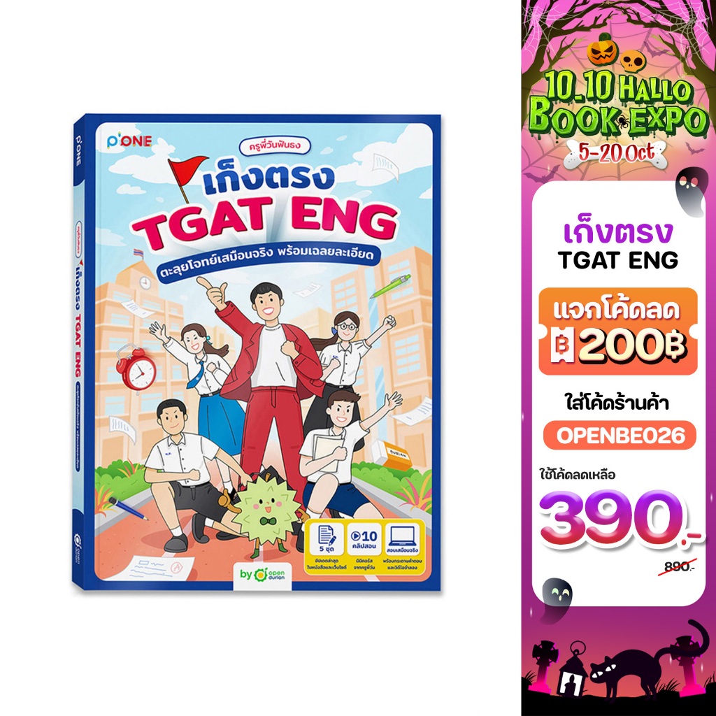 ... ่แล้ว อย่างน้อยก็จะมีความคล้ายกับโจทย์ปีเก่า ๆ ซึ่งพี่วันเคยเก็งตรงทั้ง TGAT ENG และ A-Level ปี 66 เลย! พี่วันก็เลยอยากจะสานฝันให้น้อง ๆ ม.6 รุ่นต่อ ๆ ไปให้สอบติดคณะและมหาลัยในฝันกันทุกคนเลยค่ะ! “ม.6 ควรมีไว้สักเล่ม แล้ว TGAT ENG จะไม่ใช่เรื่องยากอีกต่อไป” . ในเล่มมีอะไรน่าสนใจบ้าง? ✅ วิเคราะห์เจาะลึก TGAT ENG ทุกแง่ทุกมุม ✅ แนะแนวคณะไหนบ้างที่ใช้คะแนน TGAT ENG เยอะ ✅ ชำแหละ Blueprint TGAT ENG ให้เห็นแบบหมดไส้หมดพุง ✅ Grammar Checklist คัดมาให้เฉพาะเรื่องที่ต้องเน้นจริง ๆ ✅ Planner สำเร็จรูป วางแผนอ่านได้อย่างมีประสิทธิภาพ ✅ เก็งโจทย์ TGAT ENG ทั้งเล่ม! อิงจากสถิติเรื่องที่ออกสอบจริงกว่า 300 ข้อ ✅ เฉลยละเอียดทุกข้อ ✅ ข้อสอบ TGAT ENG เสมือนจริงให้ฝึกทำ 5 ชุด ✅ วิดีโอจำลองบรรยากาศในห้องสอบจริง สร้างความคุ้นเคย ✅ คลิปสอนครูพี่วันพาทำโจทย์ทีละข้อ พร้อมแทรกเทคนิค 10 คลิป ✅ สแกน QR Code ฟังเพลงจำเทคนิคพี่วัน 11 คลิป ✅ กระดาษคำตอบเสมือนจริง 3 แผ่นท้ายเล่ม ฉีกออกมาฝึกฝนคำตอบได้ ✅ ที่คั่นหนังสือสีสันสวยงาม พร้อมประโยคปลุกไฟจากพี่วัน . 📌 Features ที่จำเป็นในการเตรียมสอบ TGAT ENG - ครูพี่วัน’s Guide คำแนะนำจากครูพี่วันก่อนทำข้อสอบแต่ละพาร์ต - ครูพี่วัน’s Hack เทคนิคลัด เทคนิคสังเกต ช่วยประหยัดเวลา - ครูพี่วัน’s Recap อ่านจบเรื่อง มีสรุปจากพี่วันให้อีกรอบ - กรอบ “เตือนแล้วนะ” ย้ำข้อควรระวัง ลดจุดพลาดให้เหลือ 0 . 🗓 8 STEPS เข้าคณะและมหาลัยในฝัน ด้วยหนังสือ ครูพี่วันฟันธง เก็งตรง TGAT ENG STEP 1 อ่านวิเคราะห์เจาะลึก TGAT ENG STEP 2 อ่าน Blueprint โครงสร้างข้อสอบ STEP 3 ตั้งเป้าด้วย Master Plan & Evaluation STEP 4 ลงมือตะลุยโจทย์ แนวข้อสอบเสมือนจริงชุดที่ 1 STEP 5 ลงมือตะลุยโจทย์ แนวข้อสอบเสมือนจริงชุดที่ 2 STEP 6 ลงมือตะลุยโจทย์ แนวข้อสอบเสมือนจริงชุดที่ 3 STEP 7 ลงมือตะลุยโจทย์ แนวข้อสอบเสมือนจริงชุดที่ 4 STEP 8 ลงมือตะลุยโจทย์ แนวข้อสอบเสมือนจริงชุดที่ 5
