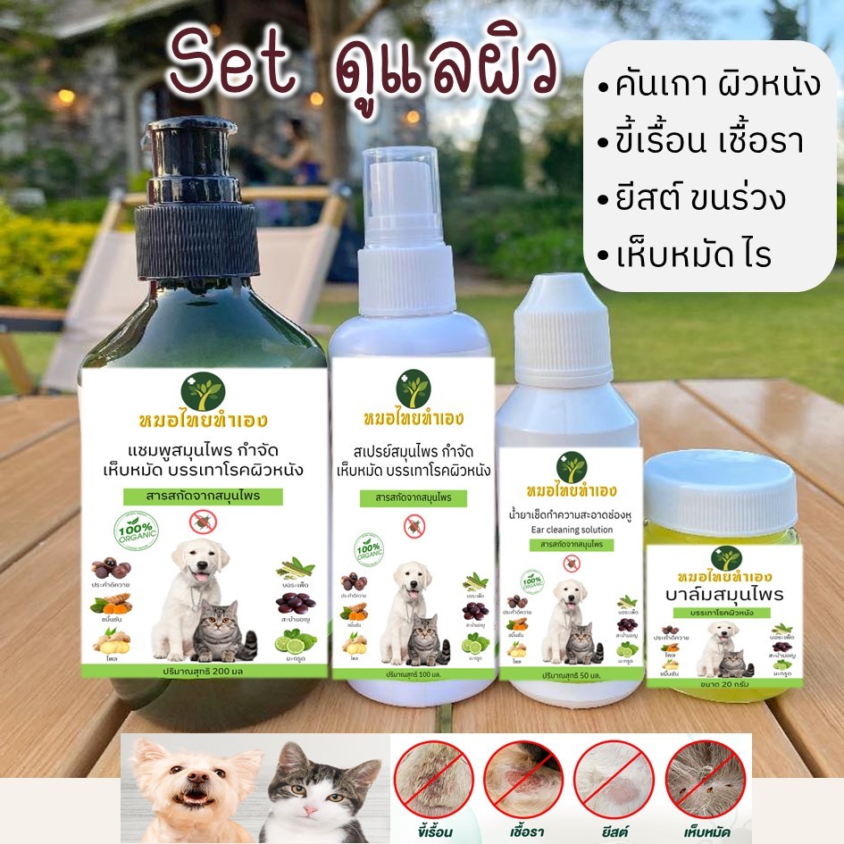 ขายดี No.1 (หมอไทยทำเอง) ดูแลและป้องกันผิวหนังสัตว์เลี้ยง เชื้อรา คัน เกา ผื่นเเดง ขี้เรื้อน ยัสต์ ไรในหู เห็บหมัด สำหรับ สุนัข แมว กระต่าย และอื่น ๆ * น้องเลียได้ ปลอดภัย ไม่เป็นอันตราย 1. สินค้า Set-เซ็ตเล็ก ประกอบด้วย - เเชมพู 200 ml - สเปรย์ 100 ml - น้ำยาเช็ดทำความสะอาดช่องหู 5