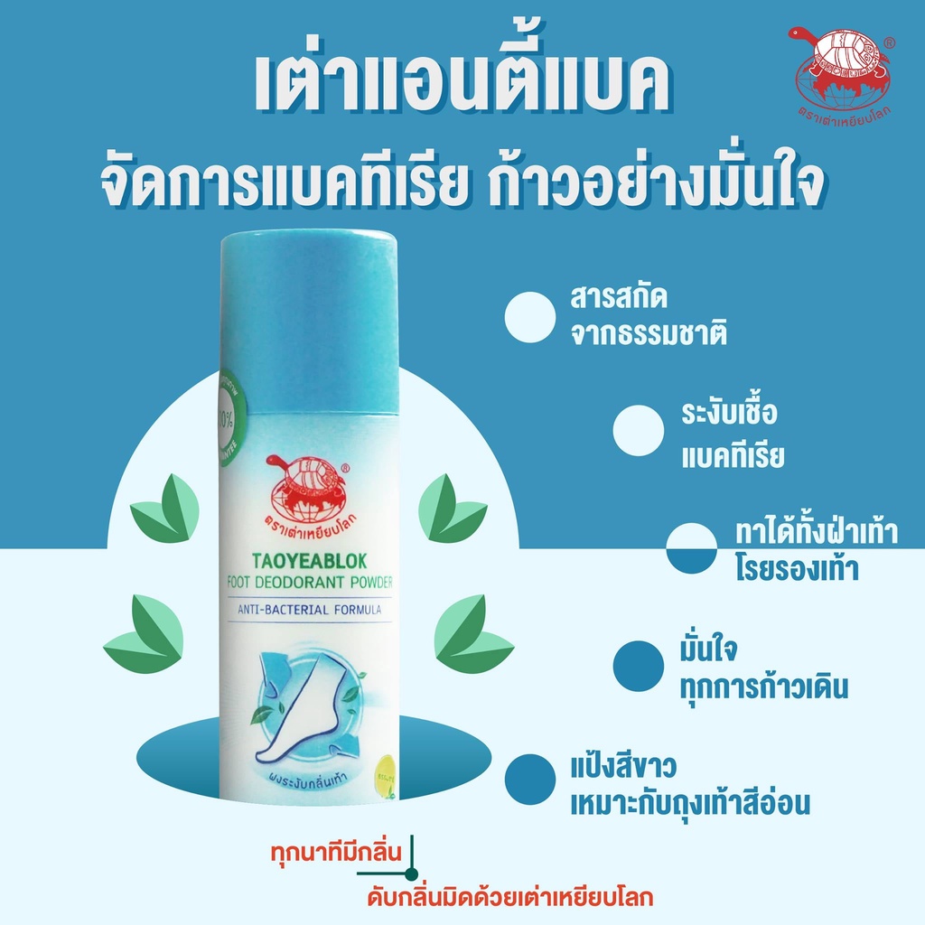 JT Taoyeablok Foot Deodorant Powder x 1 ชิ้น เต่าเหยียบโลก แป้งทาระงับกลิ่นเท้า ผงระงับกลิ่นเท้า x 1 ชิ้น คุณสมบัติ : เต่าเหยียบโลก แป้งระงับกลิ่นเท้า สูตร แอนตี้แบคทีเรีย (ฝาสีฟ้า) - เนื้อแป้งสีขาวเหมาะกับทาถุงเท้าหรือรองเท้าสีขาวหรือสีสว่าง - ใช้ได้ทันทีไม่ต้องผสมน้ำ - ผสานคุณค่าจากสมุน