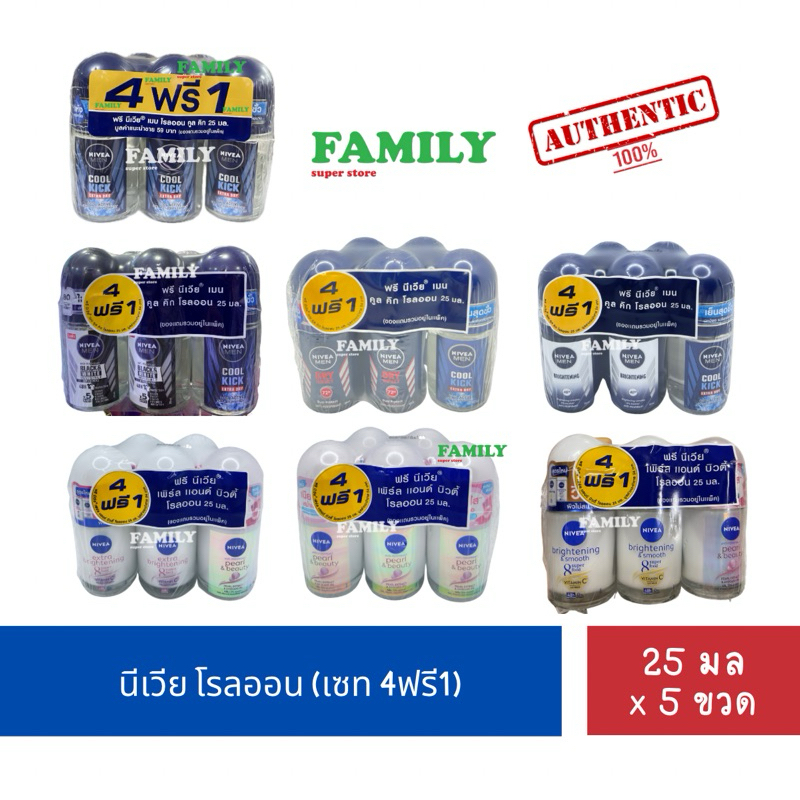(4+1) NIVEA นีเวีย โรลออนระงับกลิ่นกาย เซท 4ฟรี1 (ผช&ผญ) ขนาด 25 มล. x 5 ขวด [004]