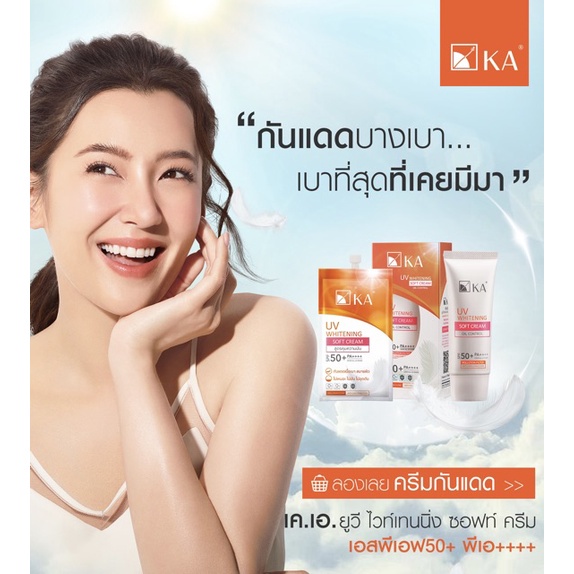 KA UV WHITENING SOFT CREAM SPF 50+ PA+ ครีมกันแดด สูตรคุมความมัน กันแดดบางเบา.... เบาสุดที่เคยมีมาสบายผิว • สูตรคุมความมัน • ไม่เหนอะ ไม่มัน ไม่อุดตันครีมกันแดดเนื้อซอฟท์ครีมสำหรับผิวหน้า สัมผัสเบา ไม่มัน สบายผิว แม้แดดแรง-แรงมากก็พร้อมปกป้องทุกอณูผิวจากแสงแดด • ปกป้องผิวจากสัญญาณแห่งวัยด้วย P