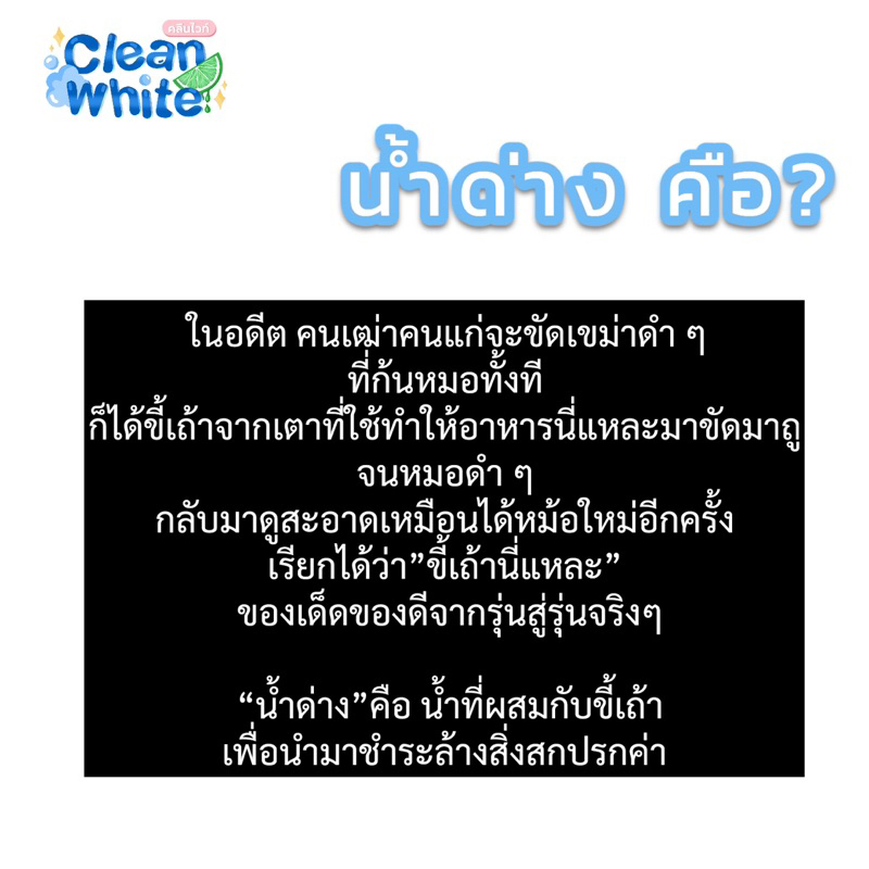คำอธิบายและการใช้ Clean white (คลีนไวท์) หัวเชื้อน้ำยาซักผ้า สูตรพิเศษ ผสมน้ำด่าง จากขี้เถ้า (เป็นสูตรคนเฒ่าคนแก่ สมัยก่อนใช้ ขี้เถ้ามาใช้ทำความสะอาด เสื้อผ้าหรือล้สงจานในยุคก่อนนั้นจ้า) คลีนไวท์ จึงได้นำคิดค้นสูตร มาเพื่อลดจากใช้สารเคมีบางชนิด เพื่อสุขภาพของลูกค้าและสิ่งแวดล้อมจ้า หัวเชื
