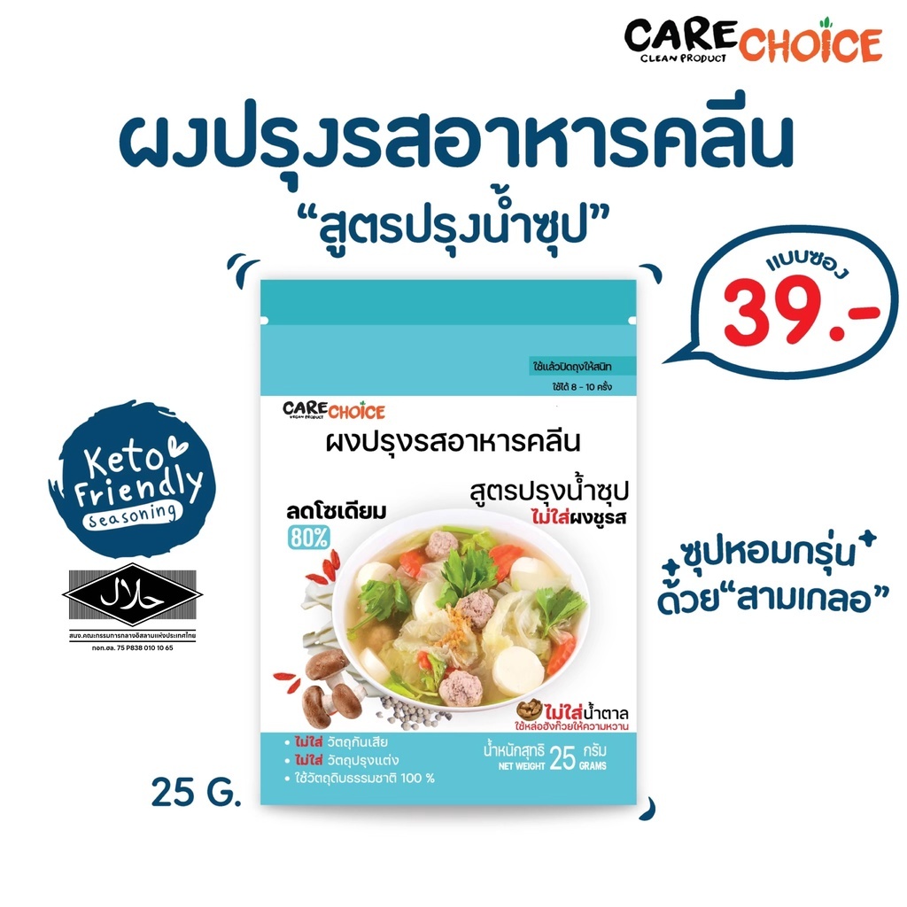 CareChoice แคร์ช้อยส์ ผงปรุงรสคลีน สูตรปรุงน้ำซุป (Care027) ผงปรุงรสคีโต คลีน ผงปรุงรส แบบซอง 25g ผงปรุงรสจากผัก ผงปรุงรสเพื่อสุขภาพ ไม่มีผงชูรส อร่อยครบรส ไม่ต้องปรุงเพิ่ม Clean Seasoning Powder