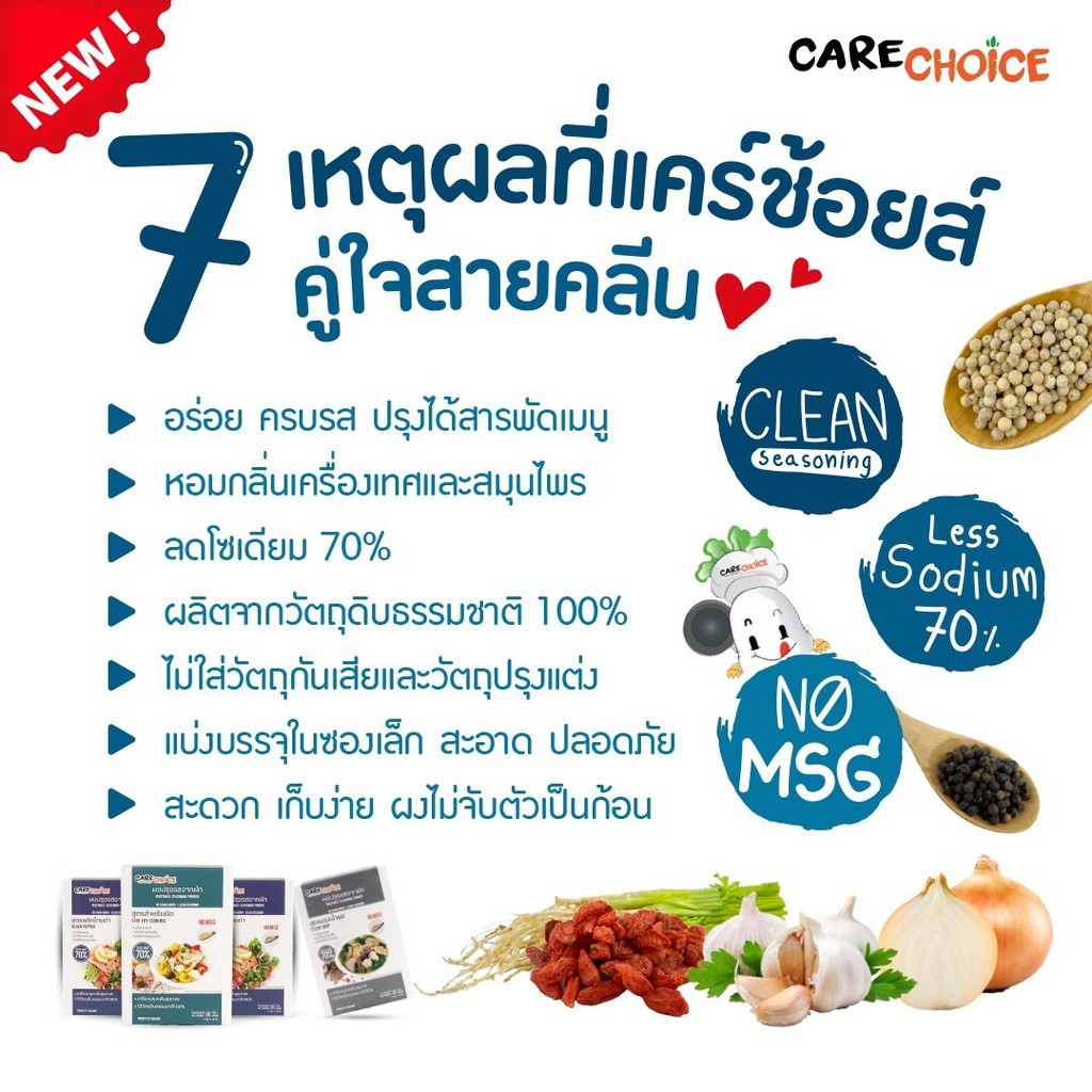 ***หลังจากได้รับสินค้าแล้ว หากลูกค้าพบว่าสินค้าเสียหาย สินค้าไม่ครบ ส่งสินค้าผิด ขอความกรุณาให้ลูกค้าติดต่อร้านค้าก่อนการรีวิว ร้านค้ายินดีรับผิดชอบเต็มที่เพื่อความความพึงพอใจของลูกค้า*** แคร์ช้อยส์ ผงปรุงรสอาหารคลีน (Clean) สูตรปรุงน้ำซุป ขนาด 25 กรัม ลดโซเดียม 80% เหมาะสำหรับ - สายสุขภาพ