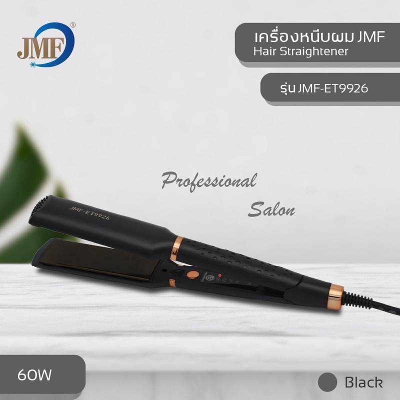 JMF เครื่องหนีบผม หน้ากว้าง รุ่น JMF-ET9926 ของแท้ 💯 คุณสมบัติ - ปรับระดับความร้อนได้ 4 ระดับ ✅✨ - ร้อนเร็วภายใน 30 วินาที ✅✨ - ด้ามจับมีขนาดพอเหมาะง่ายต่อการใช้งาน ✅✨ - แผ่นหนีบเซรามิค Tourmaline Ionic ป้องกันผมไม่ให้เสีย ✅✨ - สายยาว 1.80 เมตร ✅✨ - กำลังไฟ 60W ✅✨ - ช่างทำผมและร้านซาลอนนิยม