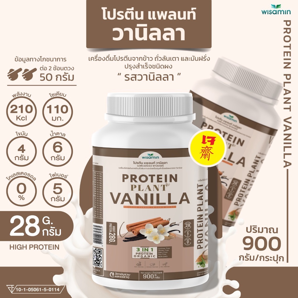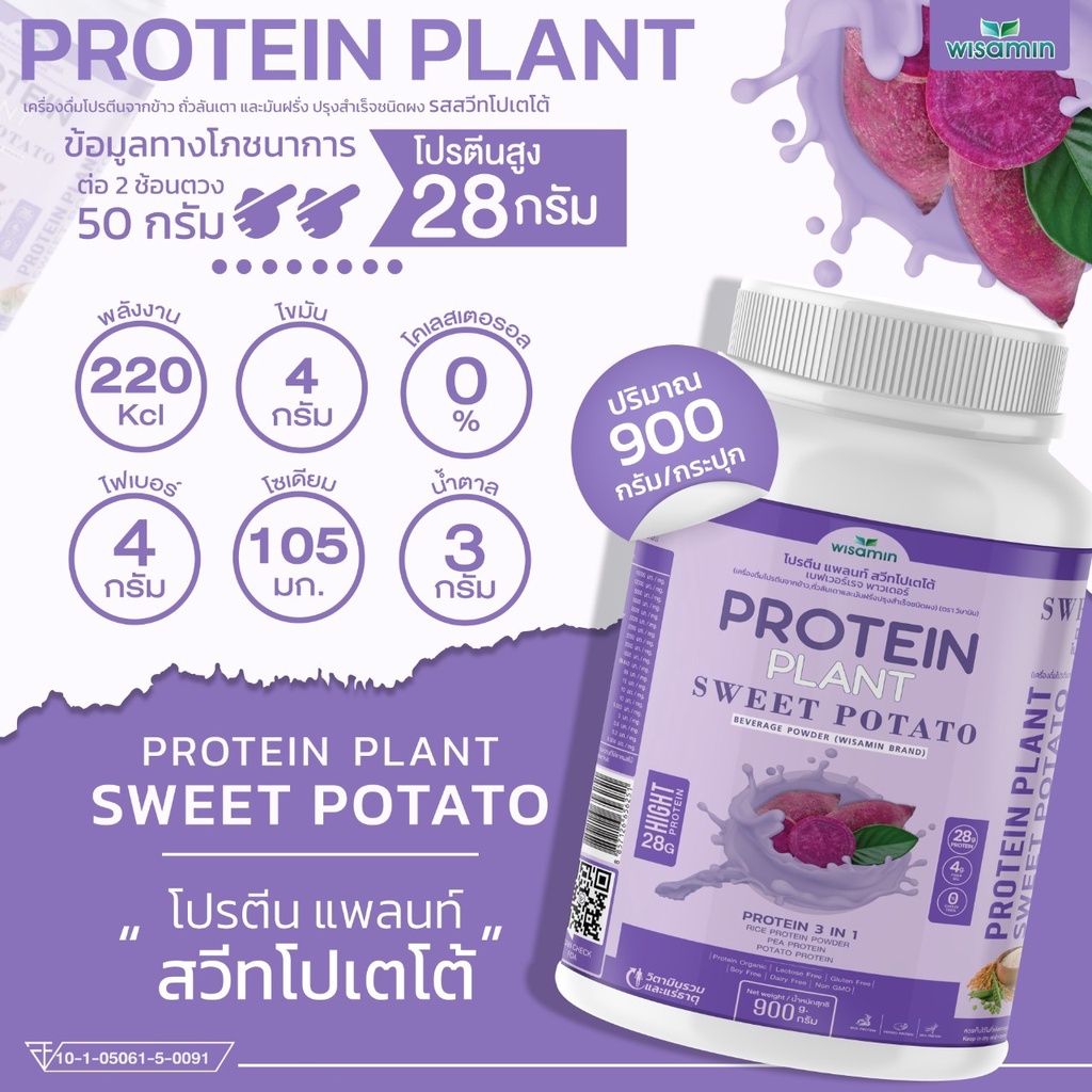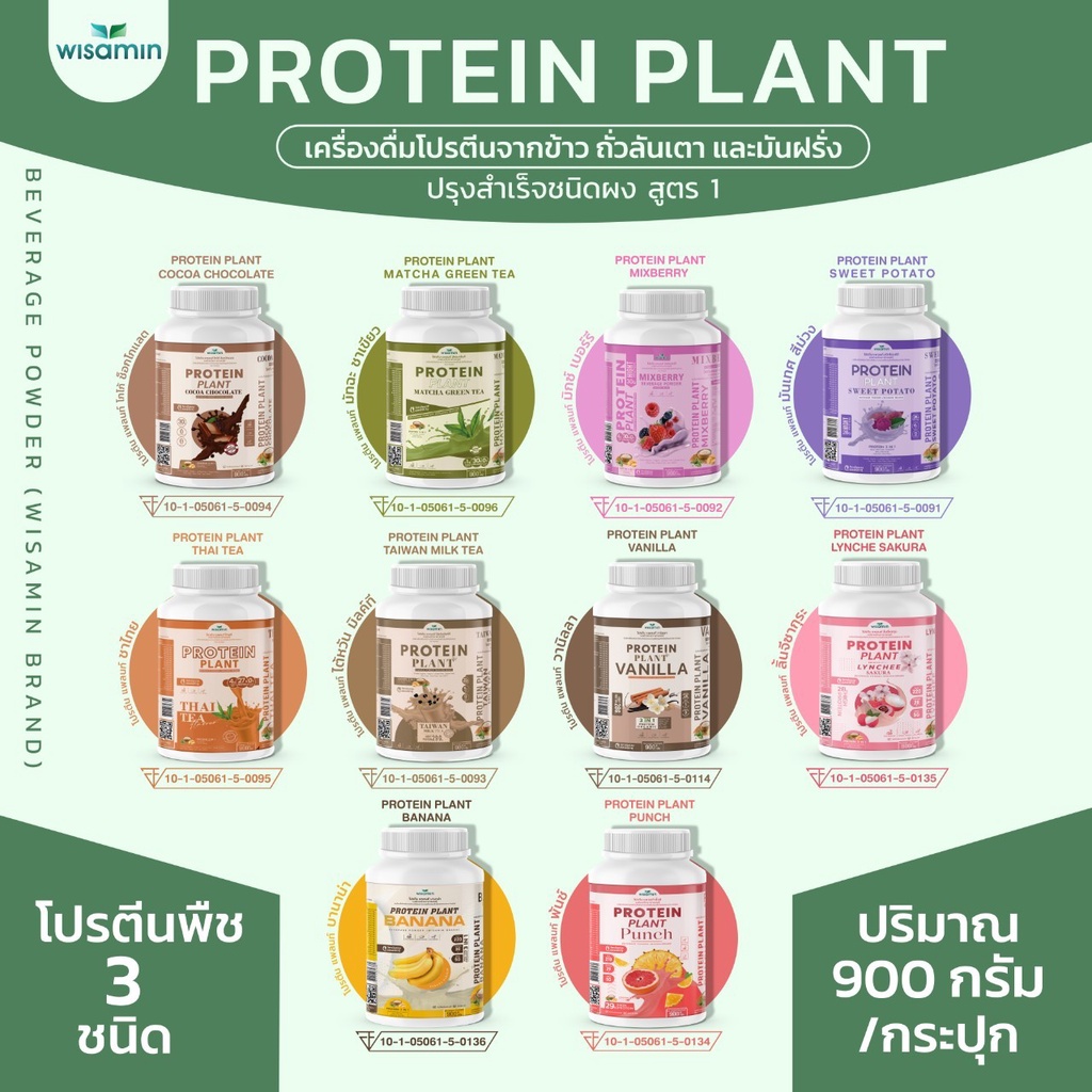 ... น - ให้พลังงานก่อนและหลังออกกำลังกาย ------------------------------------------------------------------ ✅ ปริมาณ : 900 กรัม/กระปุก - ทานได้ 18 มื้อ , ครั้ง - ปริมาณ 1 หน่วยบริโภคที่แนะนำ : 2 ช้อนตวง (50 กรัม) ------------------------------------------------------------------ ✅ คุณสมบัติเด่นของ (PROTEIN PLANT) สูตร 1 - Orgarnic (โปรตีนจากธรรมชาติ ออแกร์นิค) - Gluten Free (ปลอดกลูเตน) - Soy Free (ไม่ผสมถั่วเหลือง) - Dairy Free ( **ยกเว้น รสชานมไต้หวัน , ชาไทย , มันม่วง , รสกล้วย) - Non GMO ------------------------------------------------------------------ 🔺โปรตีนแพลนท์ จากพืช 3 ชนิด (PROTEIN 3 IN 1) 🔺มี 10 สูตร 10 รสชาติ ------------------------------------------------------------------ 1. รสโกโก้ ช็อกโกแลต (PROTEIN PLANT COCOA CHOCOLATE) ✅ ข้อมูลทางโภชนาการ ต่อ 2 ช้อนตวง 50 กรัม - โปรตีนสูง 30 กรัม - พลังงาน 210 kcl - ไขมัน 3.5 กรัม - โซเดียม 90 mg - โคเลสเตอรอล 0% - น้ำตาล 0% ✅ เลข อย. : 10-1-05061-5-0094 ------------------------------------------------------------------ 2. รสมัทฉะ ชาเขียว (PROTEIN PLANT MATCHA GREEN TEA) ✅ ข้อมูลทางโภชนาการ ต่อ 2 ช้อนตวง 50 กรัม - โปรตีนสูง 30 กรัม - พลังงาน 210 kcl - ไขมัน 4 กรัม - โซเดียม 95 mg - คเลสเตอรอล 0% - น้ำตาลน้อยกว่า 1 กรัม ✅ เลข อย. : 10-1-05061-5-0096 ------------------------------------------------------------------ 3. รสมิกซ์ เบอร์รี่ 10 ชนิด (PROTEIN PLANT MIXBERRY ) ✅ ข้อมูลทางโภชนาการ ต่อ 2 ช้อนตวง 50 กรัม - โปรตีนสูง 30 กรัม - ไฟเบอร์ 4 กรัม - พลังงาน 220 kcl - ไขมัน 4.5 กรัม - โซเดียม 110 mg - โคเลสเตอรอล 0% - น้ำตาล 3 กรัม ✅ เลข อย. : 10-1-05061-5-0092 ------------------------------------------------------------------ 4. รสมันเทศ สีม่วง (PROTEIN PLANT SWEET POTATO) ✅ ข้อมูลทางโภชนาการ ต่อ 2 ช้อนตวง 50 กรัม - โปรตีนสูง 28 กรัม - ไฟเบอร์ 4 กรัม - พลังงาน 220 kcl - ไขมัน 4 กรัม - โซเดียม 105 mg - โคเลสเตอรอล 0% - น้ำตาล 3 กรัม ✅ เลข อย. : 10-1-05061-5-0091 ------------------------------------------------------------------ 5. รสชาไทย (PROTEIN PLANT THAI TEA) ✅ ข้อมูลทางโภชนาการ ต่อ 2 ช้อนตวง 50 กรัม - โปรตีนสูง 27 กรัม - ไฟเบอร์ 4 กรัม - พลังงาน 210 kcl - ไขมัน 4.5 กรัม - โซเดียม 110 mg - โคเลสเตอรอล 0% - น้ำตาล 3 กรัม ✅ เลข อย. : 10-1-05061-5-0095 ------------------------------------------------------------------ 6. รสชานมใต้หวัน (PROTEIN PLANT TAIWAN MILK TEA) ✅ ข้อมูลทางโภชนาการ ต่อ 2 ช้อนตวง 50 กรัม - โปรตีนสูง 29 กรัม - ไฟเบอร์ 5 กรัม - พลังงาน 220 kcl - ไขมัน 4.5 กรัม - โซเดียม 120 mg - โคเลสเตอรอล 0% - น้ำตาล 4 กรัม ✅ เลข อย. : 10-1-05061-5-0093 ------------------------------------------------------------------ 7. รสวานิลลา (PROTEIN PLANT VANILLA) ✅ ข้อมูลทางโภชนาการ ต่อ 2 ช้อนตวง 50 กรัม - โปรตีนสูง 28 กรัม - พลังงาน 210 kcl - ไขมัน 4 กรัม - โซเดียม 110 mg - โคเลสเตอรอล 0% - ไฟเบอร์ 5 กรัม - น้ำตาลน้อย 6 กรัม ✅ เลข อย. : 10-1-05061-5-0114 ------------------------------------------------------------------ 8. รสบานาน่า (PROTEIN PLANT BANANA) ✅ ข้อมูลทางโภชนาการ ต่อ 2 ช้อนตวง 50 กรัม - โปรตีนสูง 30 กรัม - พลังงาน 220 kcl - ไขมัน 5 กรัม - โซเดียม 120 mg - โคเลสเตอรอล 0% - ไฟเบอร์ 5 กรัม - น้ำตาล 1 กรัม ✅ เลข อย. : 10-1-05061-5-0136 ------------------------------------------------------------------ 9. รสลิ้นจี่ซากุระ (PROTEIN PLANT LYNCHEESAKURA) ✅ ข้อมูลทางโภชนาการ ต่อ 2 ช้อนตวง 50 กรัม - โปรตีนสูง 23 กรัม - พลังงาน 220 kcl - ไขมัน 4 กรัม - โซเดียม 125 mg - โคเลสเตอรอล 0% - ไฟเบอร์ 5 กรัม - น้ำตาล 6 กรัม ✅ เลข อย. : 10-1-05061-5-0135 -------------------------------------