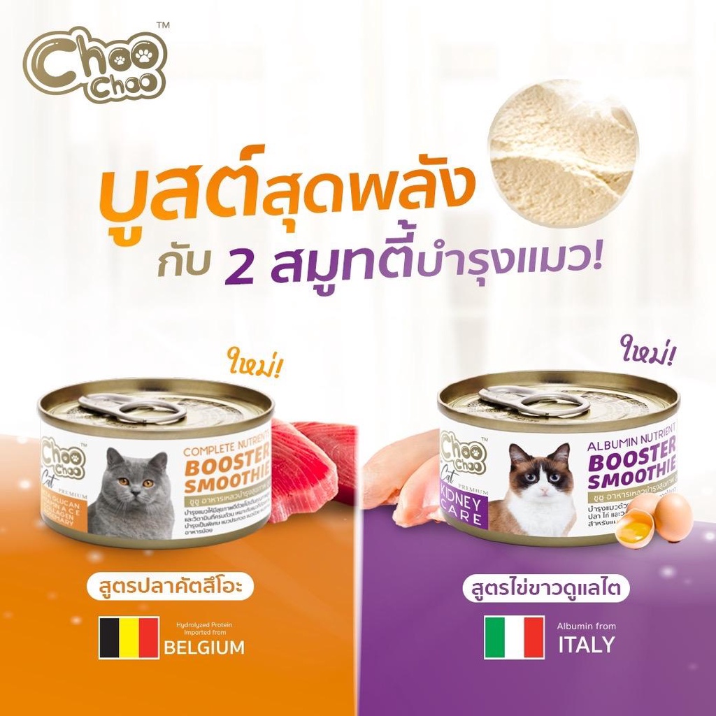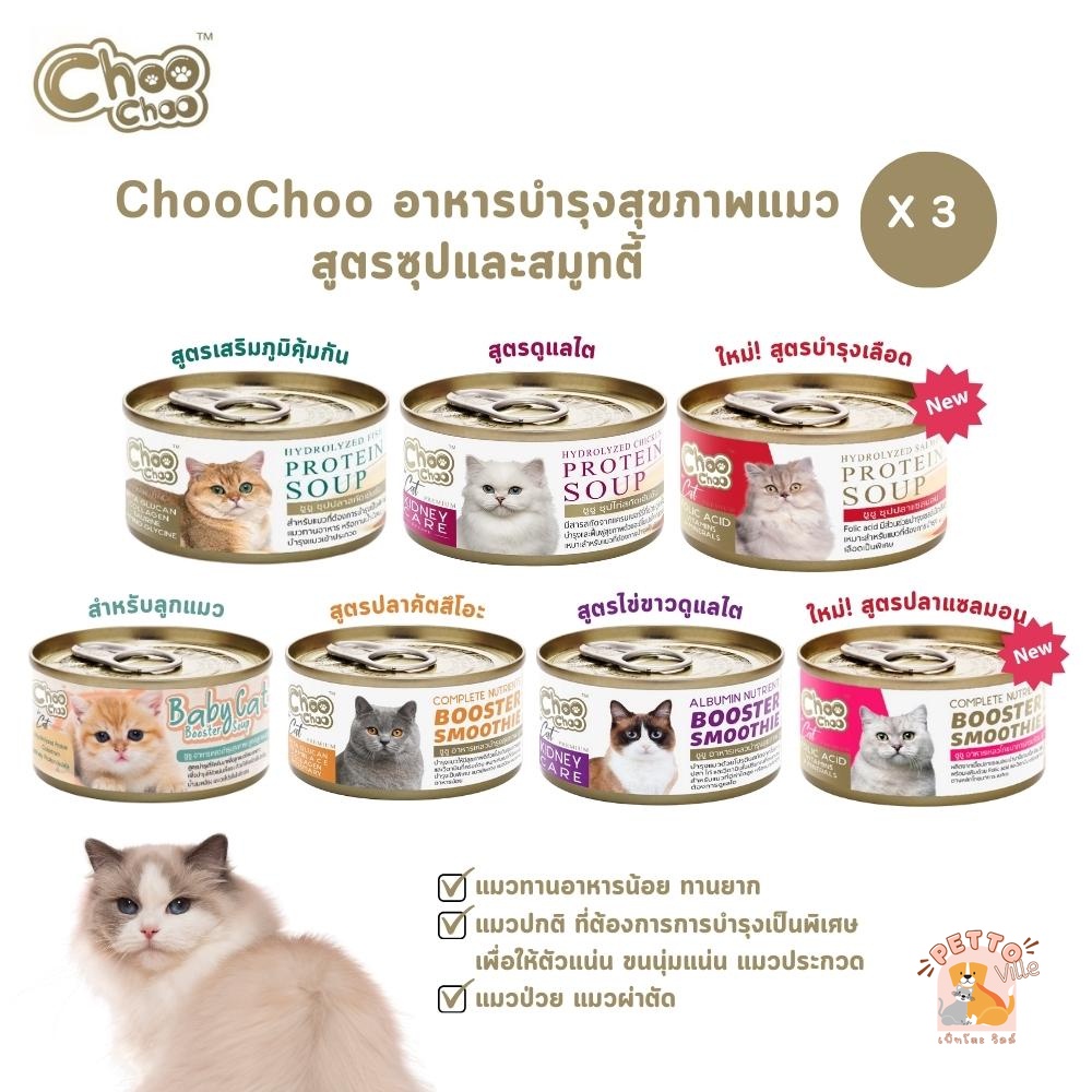 Choochoo [3 กระป๋อง] ซุปสกัดเข้มข้น บำรุงแมว ซุปปลา ซุปไก่ สมูทตี้ ชูชูเบบี้แคท สุดยอดซุปบำรุงลูกแมว ช่วยสร้างภูมิคุ้มกัน และลดโอกาสติดเชื้อในลูกแมว ด้วยสารอาหารที่จำเป็นสำหรับการเจริญเติบโตของลูกแมว ใหม่! ชูชู สมูทตี้บำรุงแมวสูตรปลาคัตสึโอะ และชูชูสมูทตี้ไข่ขาว ผลิตจากวัตถุดิบธรรมชาติ ปั่ น เ
