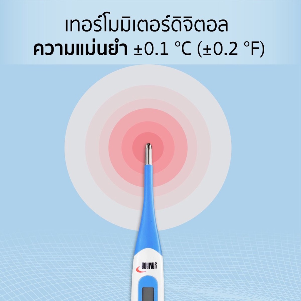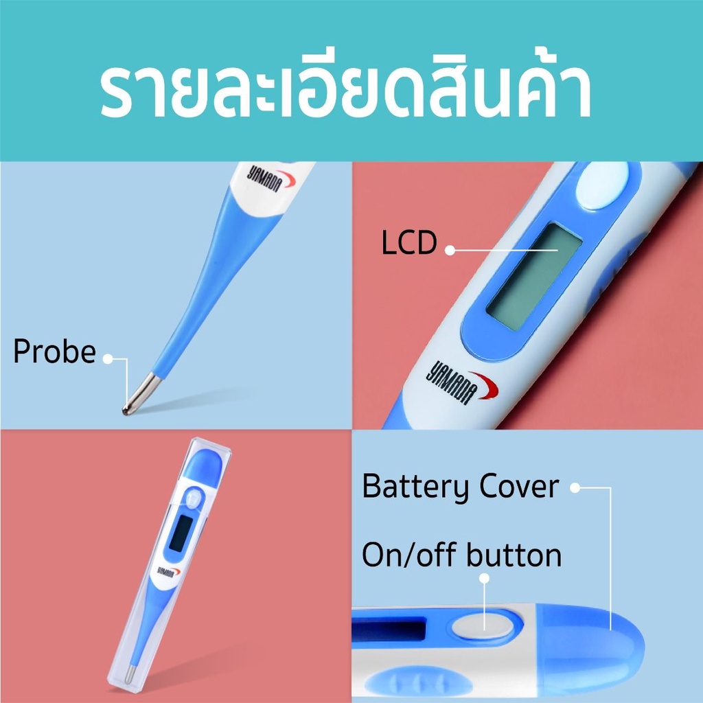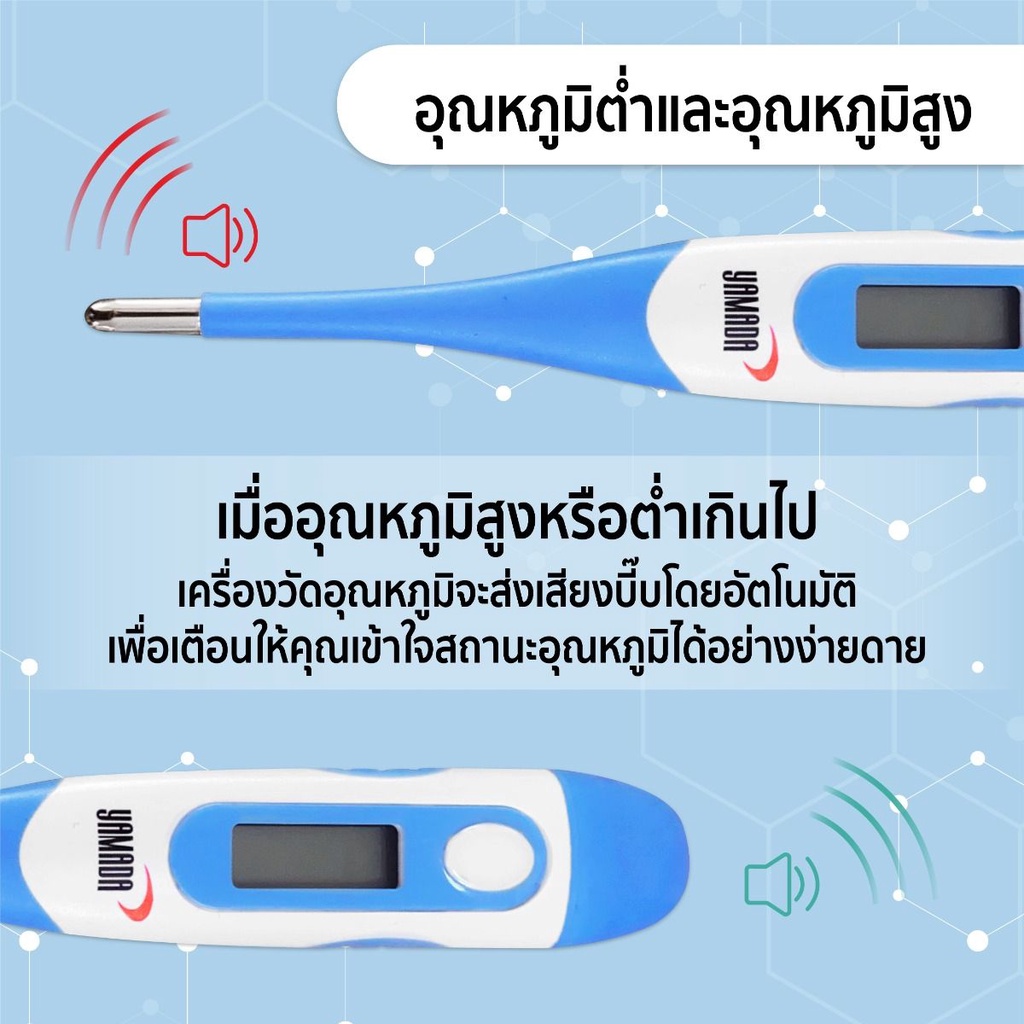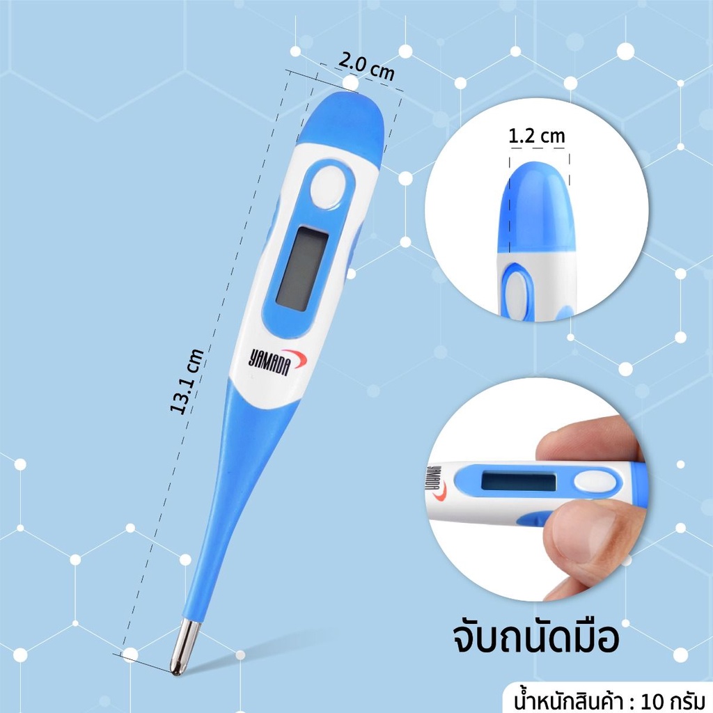 เทอร์โมมิเตอร์ ดิจิตอล ที่วัดไข้ วัดอุณหภูมิ รุ่น DMT-4336 YAMADA เทอร์โมมิเตอร์ ดิจิตอล แม่นยำสูง อ่านค่าได้อย่างรวดเร็ว - ความแม่นยำ ±0.1℃ (±0.2℉) - ปลายหัวยืดหยุ่น งอได้ - การอ่านค่าอุณหภูมิได้รวดเร็ว - สามารถกันน้ำได้ - หน่วยความจำผลทดสอบครั้งล่าสุด - หน่วยวัดผล 2 แบบ °C (องศาเซลซีย