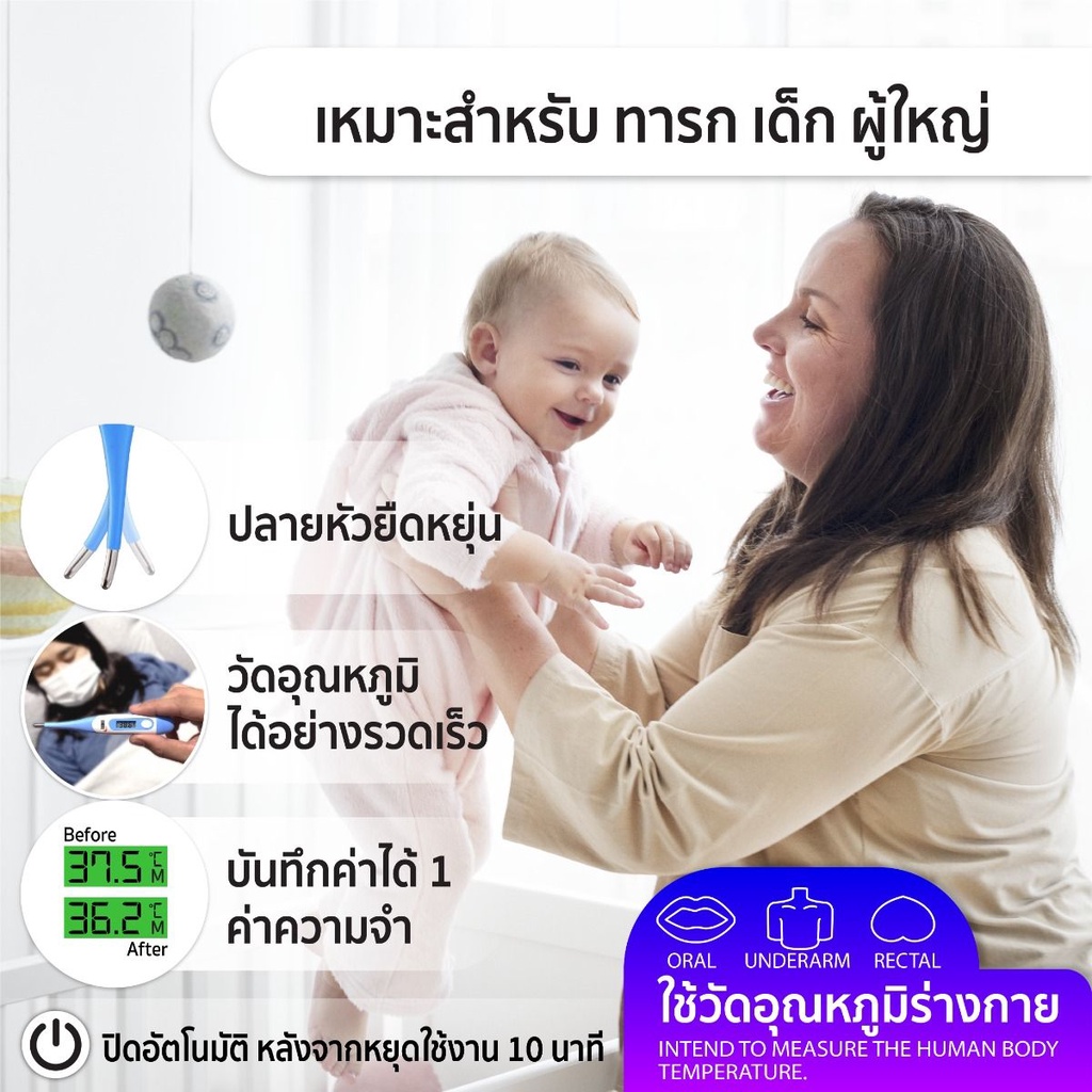 ... ส) / °F (องศาฟาเรนไฮต์) - แจ้งเตือนเมื่ออุณหภูมิสูง หรือมีไข้ - Auto-off ระบบปิดเครื่องอัตโนมัติ - มาตรฐาน ISO13485 CE0197 - มีรับประกัน 1 ปี เหมาะสำหรับ - ใช้เทอร์โมมิเตอร์ดิจิตอล วัดอุณหภูมิร่างกายผู้ป่วยได้ทั้งช่องปาก รักแร้ และทวารหนัก วิธีการใช้ 1. กดปุ่มเปิด/ปิด เทอร์โมมิเตอร์ ดิจิตอล 2. วางปลายหัววัดไว้ตำแหน่งที่ต้องการวัด รอเสียงแจ้งเตือน 3. อ่านค่าวัดอุณหภูมิที่วัดได้ 4. กดปุ่มเปิด/ปิด เทอร์โมมิเตอร์ อีกครั้งเพื่อปิดเครื่อง