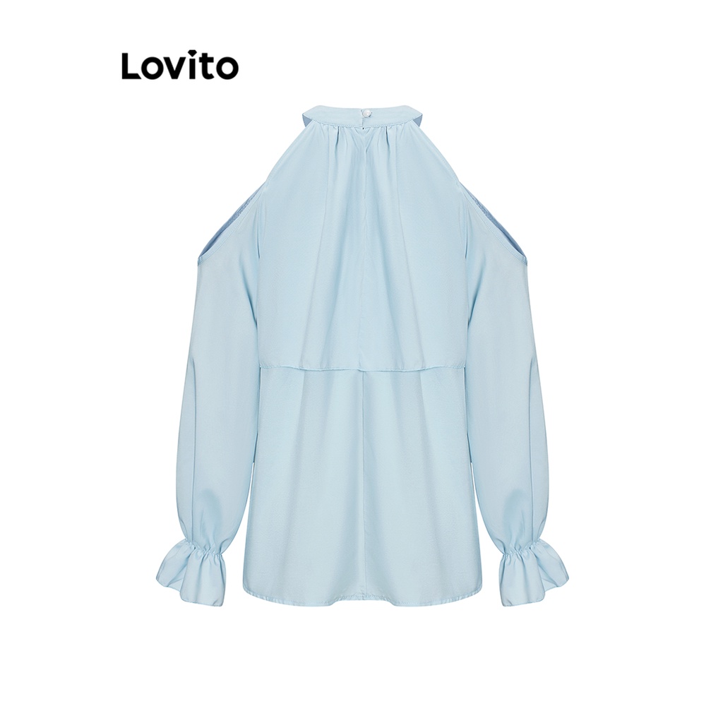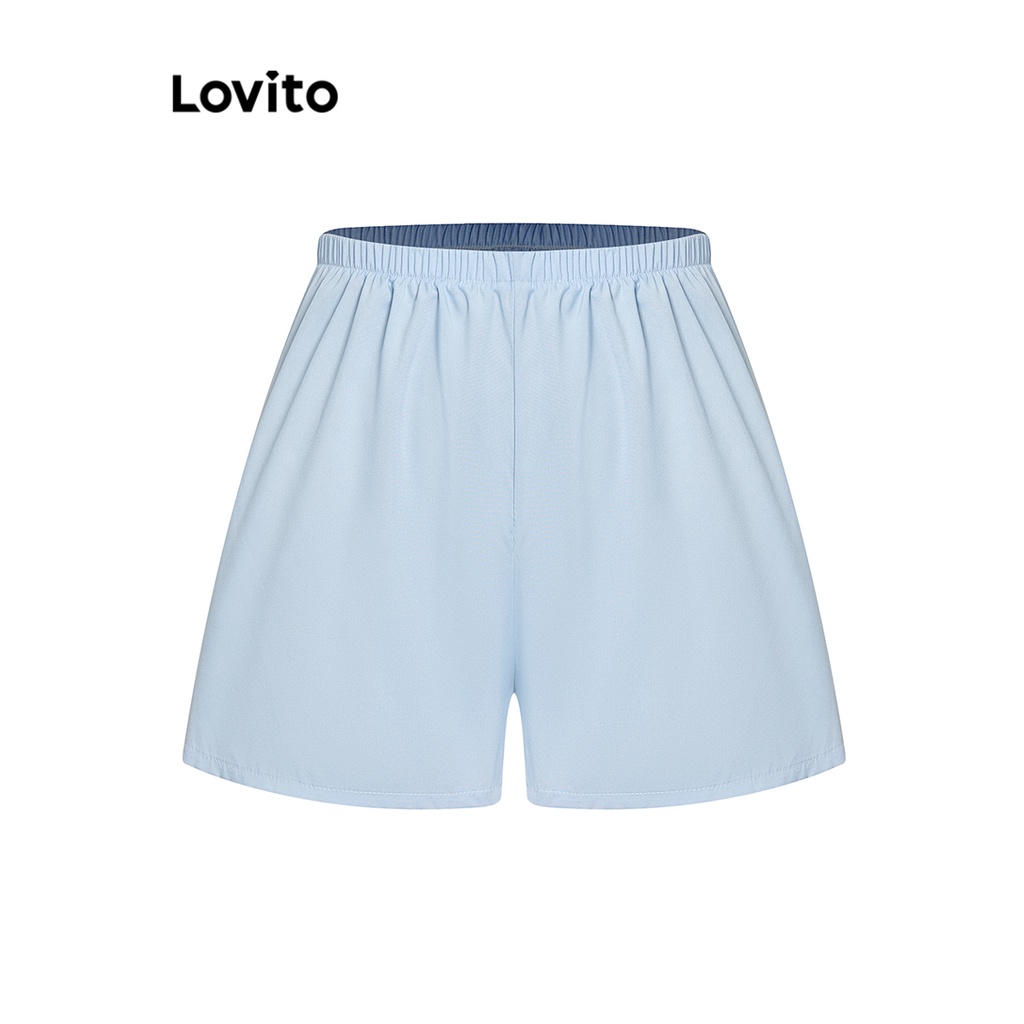 Lovito ชุดกางเกงขาสั้นผู้หญิง แต่งระบาย เปิดไหล่ ระบายหลายชั้น สีพื้น สไตล์ลำลอง L68ED134 (ชุด/กางเกงขาสั้น/เสื้อเชิ้ต)