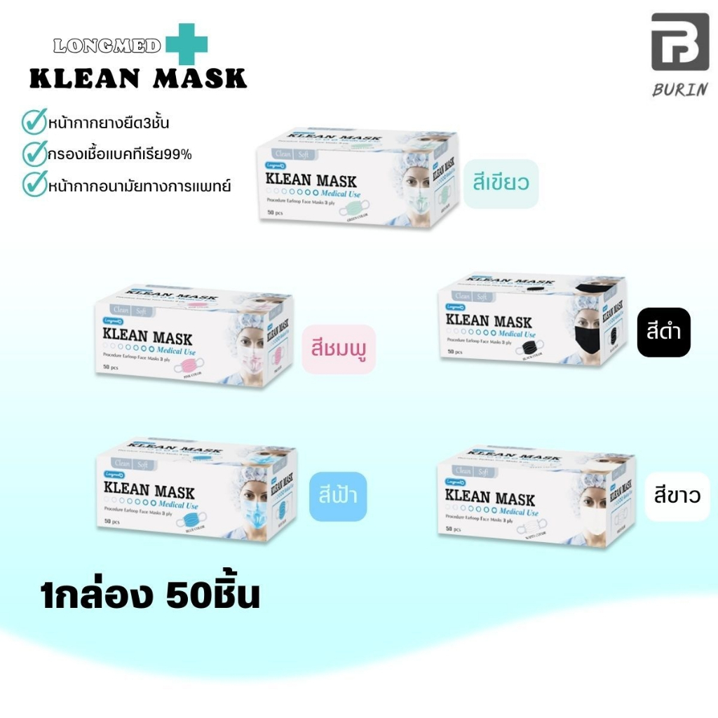 หน้ากากอนามัยทางการแพทย์ 50 ชิ้น/กล่อง ยี่ห้อ LONGMED Klean Mask หน้ากากอนามัย 3 ชั้น มีปั๊ม Longmed ทุกแผ่น มีประสิทธิภาพในการกรองป้องกันเชื้อโรคได้มากกว่า 97% สินค้าเป็นของแท้ทุกกล่อง สั่งตรงจากโรงงาน