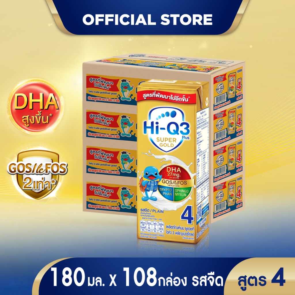 ไฮคิว 3 พลัส ซูเปอร์โกลด์ พรีไบโอ โพรเทก (สูตร4) ยูเอชที 180 มล. (108 กล่อง) สำหรับเด็กและทุกคนในครอบครัว Hi-Q 3 Plus UHT for Kids ส่วนประกอบที่สําคัญ : น้้ำนมโค 51%, นมผงขาดมันเนย 2.64%, มอลโทเดกซ์ทริน 2.31%, แลคโตโอลิโกแซกคา ไรด์ไซรัป (GOS syrup) 1.62%, น้ํามันพืช (น้ํามันคาโนลา, น้ํามันดอกทานต