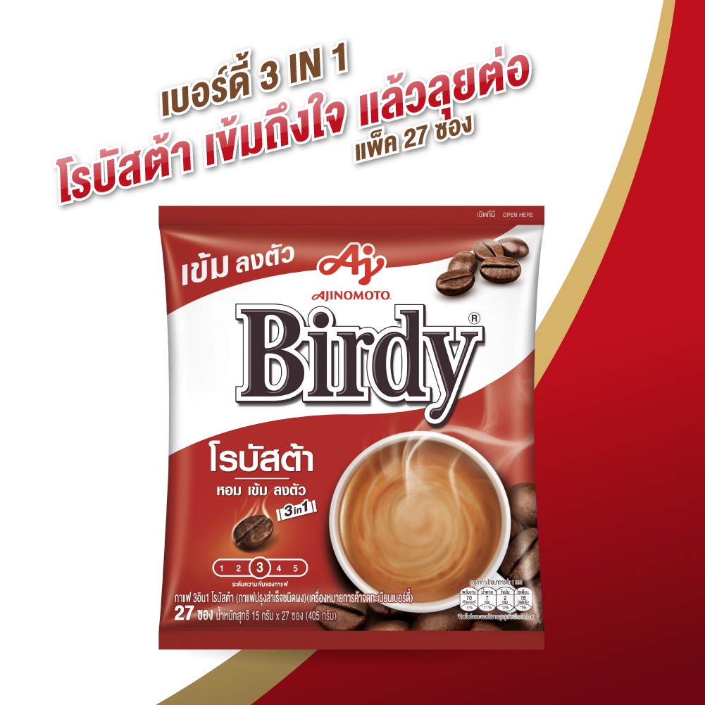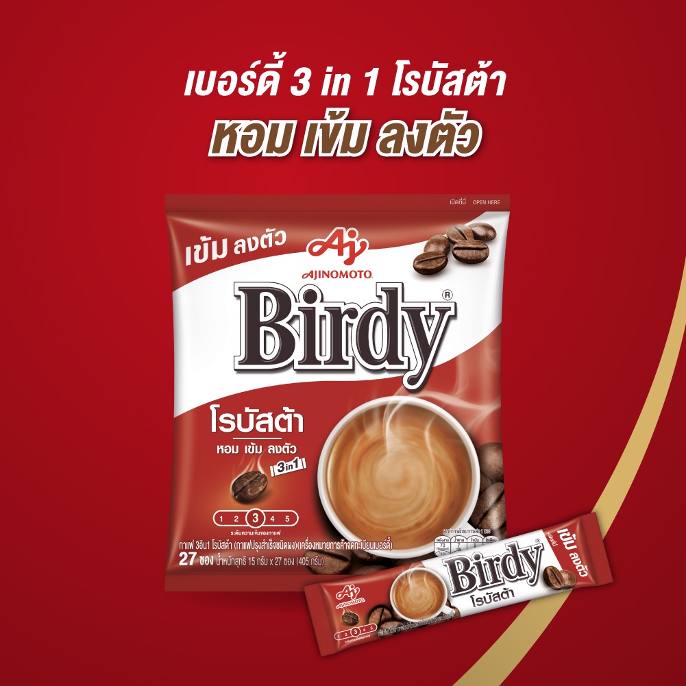 ... ักษณ์เฉพาะ จากเมล็ดกาแฟสายพันธุ์โรบัสต้าที่ให้ความเข้มข้นที่เหนือกว่ากาแฟสายพันธุ์อื่น Highlights: - กาแฟ 3 in 1 Birdy กาแฟปรุงสำเร็จชนิดผง Birdy - ผลิตจากเมล็ดกาแฟสายพันธุ์โรบัสต้าคัดสรรมาอย่างดี - เข้มข้น กลมกล่อม พร้อมกลิ่นหอมของกาแฟคั่วบด - รสชาติเข้มข้นและกลมกล่อม - ซองรูปแบบใหม่ Easy cut ฉีกสะดวก เทง่าย Description: กาแฟเบอร์ดี้ 3 อิน 1 โรบัสต้า: Birdy coffee robusta กาแฟซองเบอร์ดี้ ปรุงสำเร็จชนิดผง "Birdy®" 3in1 เข้มข้นเต็มรสชาติหอมกาแฟคั่วบด ผลิตจากเมล็ดกาแฟสายพันธุ์โรบัสต้า เพื่อให้คุณสัมผัสรสชาติและกลิ่นของกาแฟได้มากยิ่งขึ้น ให้คุณเริ่มต้นวันดีดี ได้อย่างมั่นใจทุกวัน วิธีใช้ เพียงฉีกซองแล้วเทลงแก้ว เติมน้ำร้อน 130 มล. (2/3 แก้ว) แล้วคนให้เข้ากัน หรือชงเย็นได้ แค่มีเบอร์ดี้ 3 in 1 น้ำร้อน 70 ml. น้ำแข็ง 100 ml. ส่วนประกอบสำคัญโดยประมาณ น้ำตาลทราย 43% ครีมเทียม 39% กาแฟผง 14% สารเพิ่มปริมาณ (มอลโทเดกซ์ทริน) สารป้องกันการจับเป็นก้อน (INS 551) สารให้ความหวาน (แอสพาร์เทม และแอซีซัลเฟมโพแทสเซียม) สารทำให้คงตัว (INS 415) แต่งกลิ่นสังเคราะห์ ข้อมูลสำหรับผู้แพ้อาหาร มีนม และอาจมีถั่วเหลือง ข้าวบาร์เลย์ Expiry Date / อายุผลิตภัณฑ์ : สินค้ามีอายุ 1 ปี 4 เดือน นับจากวันผลิต (วันผลิตระบุบนผลิตภัณฑ์) Birdy 3in1 ROBUSTA 15 grams 60 sachets Highlight: - 3-in-1 Instant Coffee - Made of Robusta coffee bean - Aromatic Intensity like a roasted coffee bean - Nice coffee aroma and well-blended taste - Easy-cut packaging Description: Freshen up every time With this instant coffee from Birdy 3in1 that made of real Robusta roots, it gives you the intensive taste and aromatic feeling from roasted coffee. The new “Easy Cut” packaging technology made possible the way you carry this product anywhere and anytime. Your favorite cup of coffee You can experience the richness of a deliciously great coffee and enjoy the unmistakable taste of 100% pure coffee from our well-selected high-quality Robusta coffee beans. Whether it’s a weekday or weekend, stay home or on vacation, grab your favorite Birdy 3in1 to freshen up anytime. Specification: Size: 15 g. Contain: 60 Sachets/Pack
