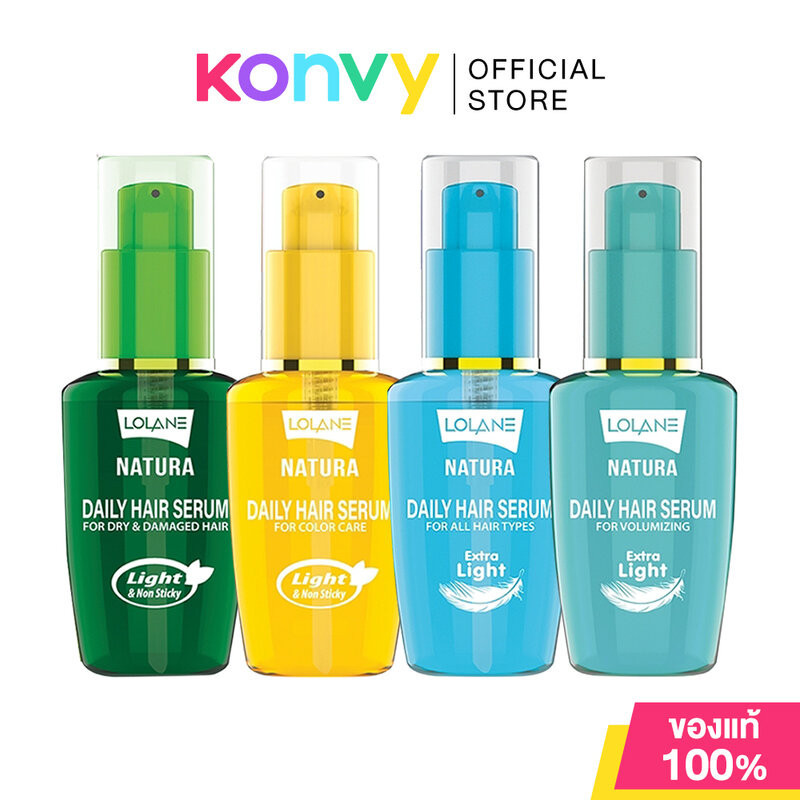 ... Hair Serum For Color Care 50ml เซรั่มบำรุงผมเข้มข้นชนิดไม่ต้องล้างออก สูตรสำหรับผมทำสี เนื้อเซรั่มซึมซาบเร็ว ไม่เหนียวเหนอะหนะ เพื่อให้สีผมสวย ชุ่มชื้น เป็นประกายเงางาม เคล็ดลับผมสวยสุชภาพดี •Lolane Natura Daily Hair Serum For All Hair Types 50ml ออยล์เซรั่มบำรุงเส้นผม เนื้อบางเบาพิเศษ ซึมซาบเร็ว ไม่เหนียวเหนอะหนะ ให้ความชุ่มชื้นยาวนาน เคลือบปกป้องเส้นผมแห้งเสียแตกปลาย พร้อมปกป้องจากมลภาวะ และบำรุงเส้นผมให้เรียบลื่น มีวอลลุ่ม สุขภาพดี ใช้ได้บ่อยตามต้องการ •Lolane Natura Daily Hair Serum For Volumizing 50ml เซรั่มน้ำนมบำรุงเส้นผม เนื้อบางเบาพิเศษ ซึมซาบเร็ว ไม่เหนียวเหนอะหนะ พร้อมปกป้องมลภาวะ และบำรุงเส้นผมให้เรียบลื่น มีวอลลุ่ม สุขภาพดี ใช้ได้บ่อยตามที่ต้องการ ผมไม่มันไว ไม่ลีบแบน วิธีใช้: หยดเซรั่มลงบนปลายนิ้ว ลูบไล้ให้ทั่วเส้นผม โดยเน้นเป็นพิเศษบริเวณปลายผม 5 ซม. ใช้ได้บ่อยเท่าที่ต้องการ