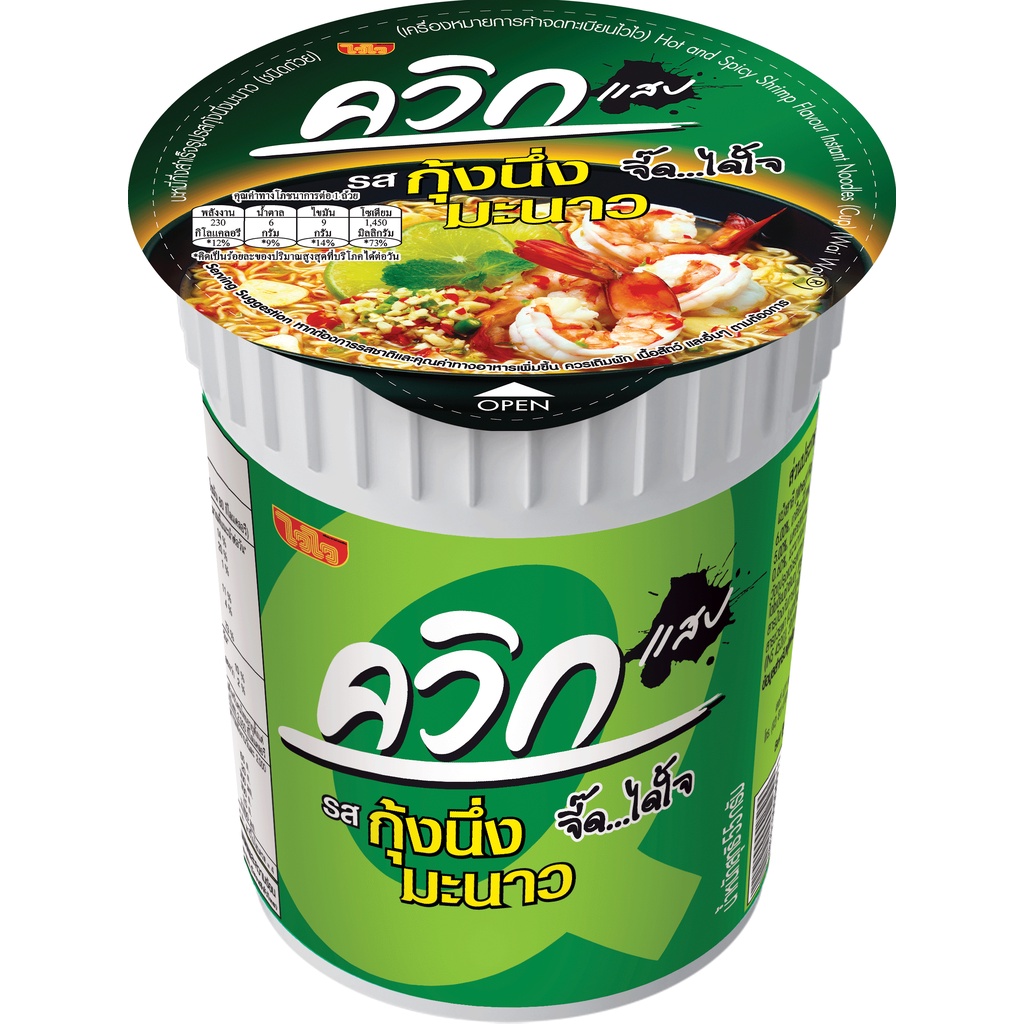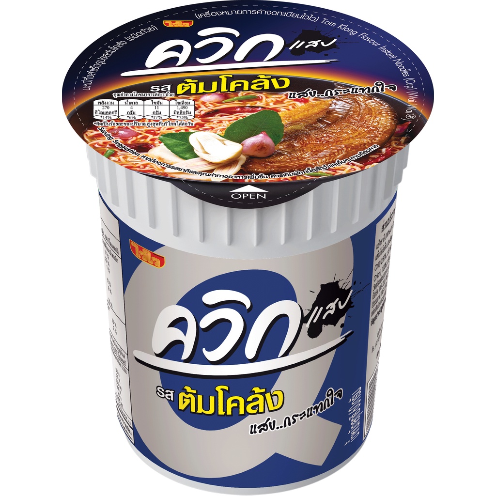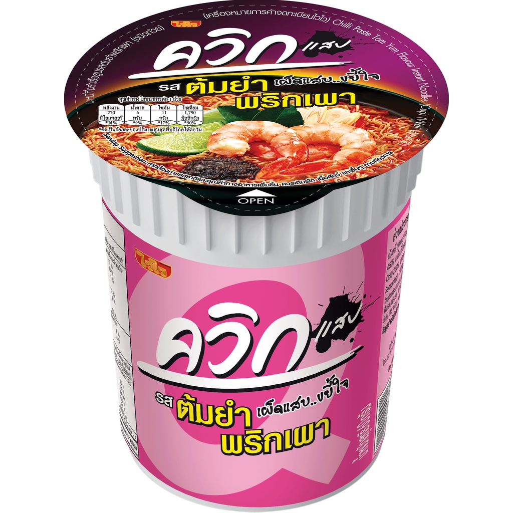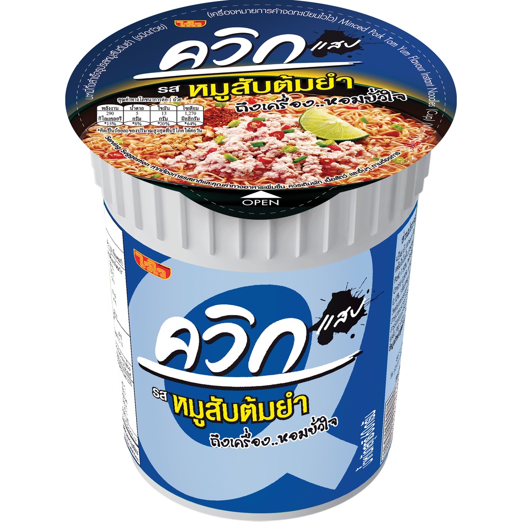 ... : ด้วยความเข้มข้นของน้ำซุปหอม กลิ่นมะนาวและเครื่องต้มยำ รสชาติตามสไตล์การผสมพริกป่น ถั่วลิสงคั่ว น้ำตาลทราย และหมูสับคุณภาพดี - ควิกคัพ #รสต้มยำพริกเผา : ด้วยความเข้มข้นของน้ำซุปหอมหอมถึงเครื่องต้มยำแท้ๆ รสชาติแสบด้วยน้ำพริกเผา สูตรพิเศษที่ไม่เหมือนใคร เผ็ดแสบ...ขยี้ใจ - ควิกคัพ #รสต้มยำมันกุ้ง : ด้วยกลิ่นหอมของมันกุ้งแท้ๆ พร้อมด้วย เนื้อกุ้งแท้ คุณภาพดี เครื่องต้มยำสดๆ ทำให้ได้รสชาติที่ เข้มมัน...สะใจ - ควิกคัพ #รสต้มโคล้ง : ด้วยความหอมของปลาย่างคุณภาพดี พร้อมกับเครื่องต้มโคล้งที่ผสานกันอย่างลงตัว รสชาติเผ็ดที่ แสบ...กระแทกใจ - ควิกคัพ #รสต้มยำกุ้ง : ด้วยความเข้มข้นของน้ำซุปหอมถึงเครื่องต้มยำแท้ๆ พร้อมด้วยกุ้งคุณภาพดี รสชาติแสบด้วยน้ำมันเจียวพริก สูตรพิเศษที่ จัดจ้าน...ถึงใจ - ควิกคัพ #รสกุ้งนึ่งมะนาว : ด้วยการผสมมะนาว กระเทียม พริกสดแท้ อย่างลงตัวของสมุนไพร ที่ดีต่อสุขภาพ จี๊ด...ได้ใจ