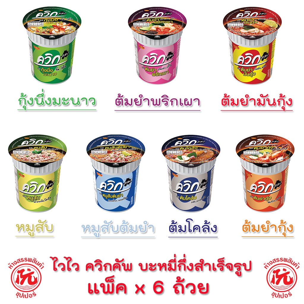 ไวไว ควิกคัพ บะหมี่กึ่งสำเร็จรูป ชนิดถ้วย แพ็ค 6ถ้วย รสชาติ[หมูสับต้มยำ ต้มยำพริกเผา ต้มยำมันกุ้ง ต้มโคล้ง กุ้งนึ่งมะนาว