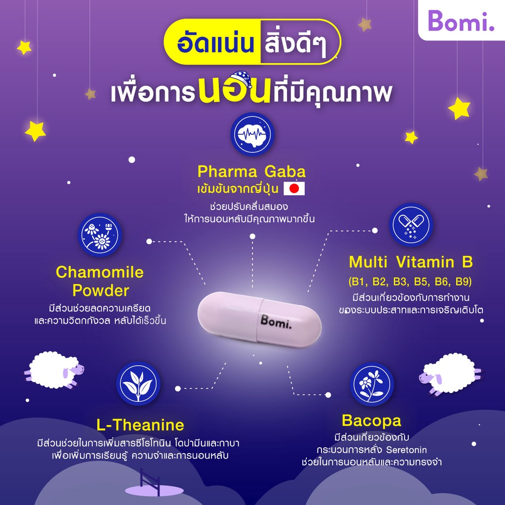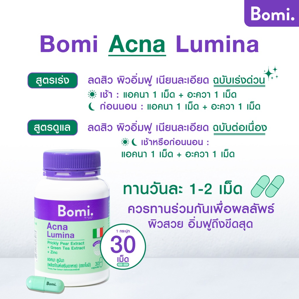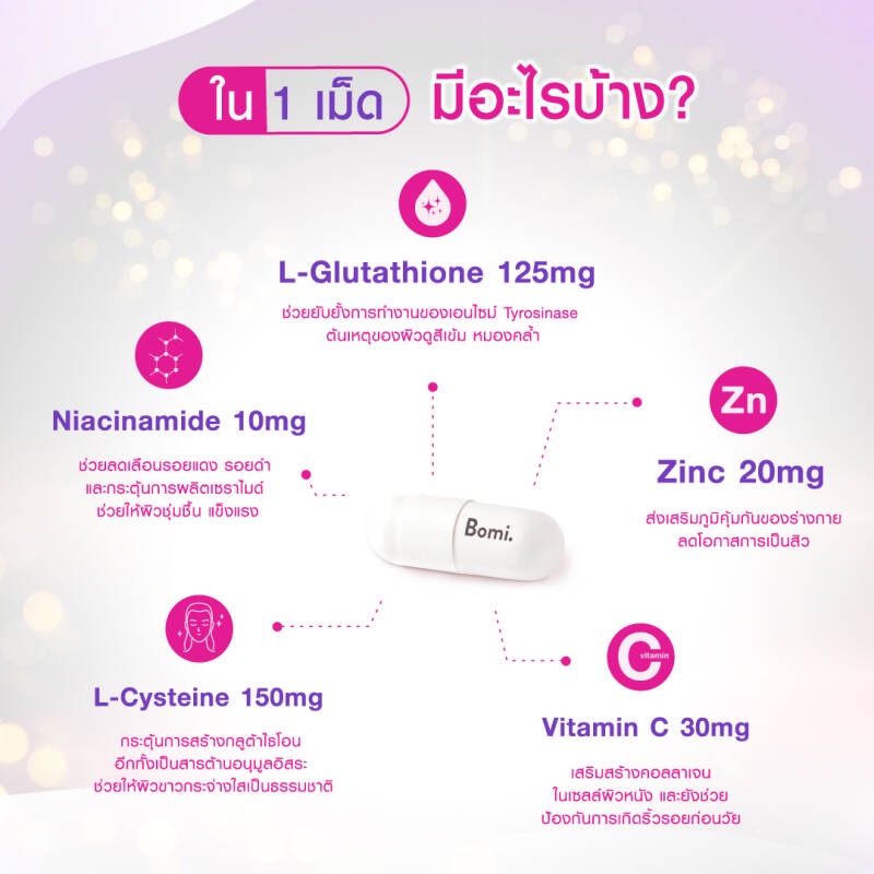 ... ารสกัดทับทิมสเปน ✔️ลดรอยแดง รอยสิว ผิวดูสว่างใสสุขภาพดีดุจประกายแก้ว ✔️ เน้นสารต้านอนุมูลอิสระ ช่วยให้ผิวดูอ่อนเยาว์ ต้านริ้วรอย ทนทานต่อแดด 1 กระปุก ประกอบด้วย •สารสกัดทับทิมสเปน 130 mg มีสารต้านอนุมูลอิสระ Punicalagin มากกว่าทับทิมทั่วไป 3 เท่า กระตุ้นการสังเคราะห์กลูต้ามากถึง 40% ใน 30 วัน (การันตีด้วยรางวัล Finalist Nutra Ingredients Award) •สารสกัดมะนาว 140mg อุดมไปด้วยสารต้านอนุมูลอิสระและวิตามินซี จากธรรมชาติในปริมาณสูง ช่วยลดเลือนริ้วรอย ลดจุดด่างดำ ความหมองคล้ำจากรังสี UV •สารสกัดมะเขือเทศ 100mg อุดมไปด้วย Lycopene ในปริมาณสูง ช่วยต้านอนุมูลอิสระ ชะลอความเสื่อมของเซลล์ ช่วยให้ผิวเปล่งปลั่ง ขาวกระจ่างใส และทนทานต่อแสงแดด •สารสกัดลิ้นจี่ 20mg ยับยั้งเอนไซม์ที่ทำลาย Collagen, Elastin และHyaluronic Acid จึงช่วยรักษาความเต่งตึงของผิว ให้ผิวคงความยืดหยุ่น •Vitamin C 30mg กระตุ้นการสังเคราะห์คอลลาเจน ช่วยซ่อมแซมเนื้อเยื่อต่างๆในร่างกาย ชะลอความแก่ ลดการเกิดริ้วรอยแห่งวัย และเพิ่มความกระจ่างใสให้แก่ผิว ❣️วิธีรับประทาน: 1-2 เม็ด / วัน Bomi Gluta Lumina 30 capsules โบมิ กลูต้า ลูมินา พรีเมียมกลูต้าเข้มข้น จากญี่ปุ่น เผยผิวดูขาวสว่างใส ดุจเปิดไฟให้ผิว ✔️ช่วยเรื่องผิวดูขาว ดูโกลวสว่างใส มีออร่าเปล่งประกาย ✔️ Detoxผิวจากภายใน ลดความหมองคล้ำของผิวโดยรวม 1กระปุก ประกอบด้วย •L-Glutathione 125mg ช่วยยับยั้งการทำงานของเอนไซม์ Tyrosinase ที่ควบคุมการผลิตเม็ดสีเมลานิน ต้นเหตุของผิวดูสีเข้ม หมองคล้ำ •L-Cysteine 150mg กรดอะมิโนที่เป็นตัวกระตุ้นการสร้างกลูต้าไธโอนตามธรรมชาติในร่างกาย อีกทั้งเป็นสารต้านอนุมูลอิสระ ช่วยให้ผิวขาว กระจ่างใสอย่างเป็นธรรมชาติ •Niacinamide 10mg วิตามินบี3 ช่วยลดเลือนรอยแดง รอยดำ และกระตุ้นการผลิตเซราไมด์ช่วยให้ผิวชุ่มชื้น แข็งแรง •Zinc 20mg สารต้านอนุมูลอิสระ ส่งเสริมภูมิคุ้มกันของร่างกาย ลดโอกาสการเป็นสิว •Vitamin C 30mg สารต้านอนุมูลอิสระ ป้องกันการเสื่อมของเซลล์ เสริมสร้างคอลลาเจนในเซลล์ผิวหนัง ป้องกันการเกิดริ้วรอยก่อนวัย ❣️วิธีรับประทาน: 1-2 เม็ด / วัน Bomi Asta Concentrate 6 (30 Capsules) โบมิ แอสตา คอนเซนเทรท 6 “ที่สุดของสารต้านอนุมูลอิสระจากธรรมชาติ” 💓Natural Astaxanthin 100% สารสกัดสาหร่ายสีแดงธรรมชาติจากประเทศญี่ปุ่น ✔️1 แคปซูล ประกอบด้วย 💜น้ำมันถั่วเหลือง(Soy Bean Oil) ✔️อุดมไปด้วยวิตามินอี ซึ่งเป็นสารต้านอนุมูลอิสระที่มีคุณสมบัติช่วยชะลอความเหี่ยวย่นของผิวหนัง ✔️ กรดไขมัน Omega-3 ในน้ำมันถั่วเหลือง ช่วยสนับสนุนการทำงานและชะลอความเสื่อมของสมอง และยังช่วยป้องกันความเสื่อมของตา 💓 น้ำมันเมล็ดองุ่น (Grape Seed Oil) ✔️ ช่วยลดการเสื่อมสภาพของเซลล์จากมลภาวะภายนอก ลดกร