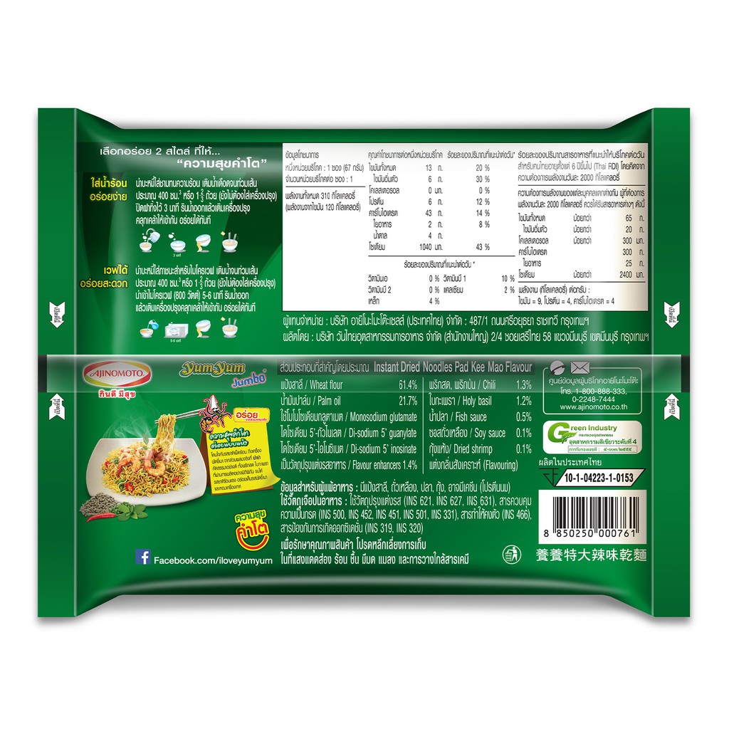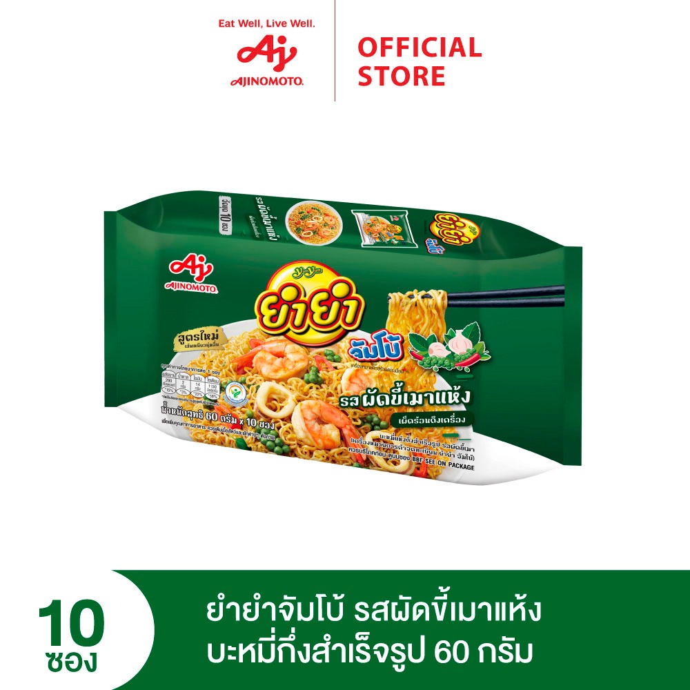 ... ากส่วนผสมจริงนานาชนิด ทั้งกระเทียม พริกสด และใบกระเพรา เผ็ดร้อน จัดจ้านเต็มรสเครื่องเทศ บะหมี่แบบแห้งสไตล์ใหม่ที่รสชาติลงตัวโดดเด่น เหมาะสำหรับคนที่ชอบความแปลกใหม่ ไม่ซ้ำใคร ผัดขี้เมารสร้อนแรง สูตรเฉพาะของยำยำ ลิ้มรสความอร่อยถึงเครื่องของผัดขี้เมารสร้อนแรง เต็มรสชาติทั้งกระเทียม พริกไทย และใบกะเพราที่นำมาผลิตอย่างพิถีพิถัน บดให้ละเอียดเป็นเนื้อเดียวกันจนได้เครื่องปรุงผัดขี้เมาที่เต็มรสเครื่องเทศ อร่อย เผ็ด จัดจ้าน จากส่วนผสมจริง ต้องลอง ข้อมูลจำเพาะ: ขนาด 60 กรัม บรรจุ 10 ซอง/แพ็ค Expiry Date / อายุผลิตภัณฑ์ : สินค้ามีอายุ 6 เดือน นับจากวันผลิต (วันผลิตระบุบนผลิตภัณฑ์) YumYum Jumbo Pad Kee Mao 60 grams 10 Sachets - Instant noodle Pad Kee Mao flavor - Made of well-selected raw ingredients - Flavorful and tangy - Serve in a jumbo pack Spoonful of flavors YumYum Jumbo Dried Pad Kee Mao selects the fresh and clean ingredient such as garlic, hot spices, and basil to make your dish tastes as real as Pad Kee Mao we like from a local restaurant. The elaborate process to mix these ingredients together to make dried Pad Kee Mao from the real ingredient. Unique at its flavor, suitable for those who want to try new things. YumYum specialty in your favorite menu Try out your new favorite YumYum Jumbo Dried Pad Kee Mao. It consists of a mixture of authentic spices and seasonings to bring out the real local taste. Without the hassle of preparing the ingredients and seasoning, it helps you enjoy your favorite menu every day. Specification: Size: 60g. Contain: 10 Sachets/Pack