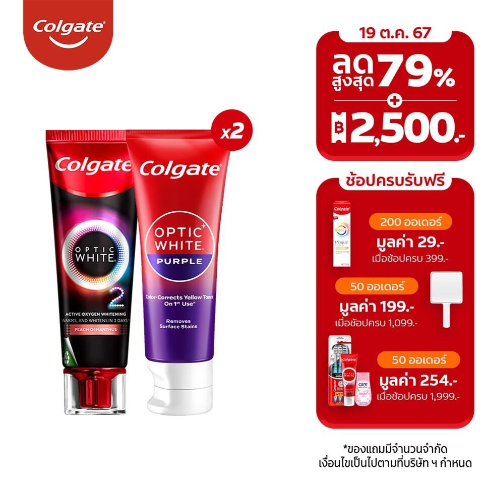 เซตบอกลาฟันเหลือง (ยาสีฟัน คอลเกต อ๊อพติค ไวท์ เพอร์เพิล x2 + ยาสีฟัน คอลเกต อ๊อพติค ไวท์ โอทู พีช x1)