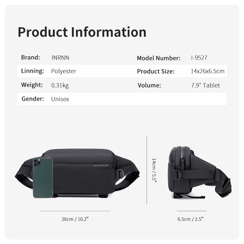 รุ่น: 9527 วัสดุหลัก: Oxford วัสดุซับ: โพลีเอสเตอร์ สี: ดำ ขนาด: 26x6.5x14 ซม. (10.2x2.5x5.5 นิ้ว) น้ำหนัก: 310g / 0.68lb เพศ: Unisex ภายใน: กระเป๋าสล็อตภายใน, กระเป๋าโทรศัพท์มือถือ, กระเป๋าซิปภายใน, ช่องภายใน, แท็บเล็ต Interlayer คุณสมบัติ: * วัสดุ Oxford ที่ทนทานและกันน้ำ * น้ำหนักเบ