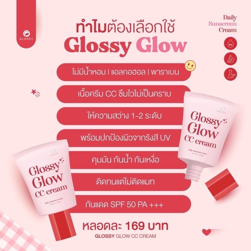 กลอสซี่ โกลว์ ซีซี ครีม Glossy glow cc cream ครีมกันแดดผสมรองพื้น ให้สีทีกลมกลืนกับผิวหน้า ทำให้ผิวหน้าดูนวลเนียน กันนํ้า กันเหงื่อ สามารถทาแทนรองพื้นก่อนแต่งหน้า พร้อมป้องกันรังสี UVB และ UVB ด้วยค่า SPF 50 PA+++ วิธีใช้ : ทาบริเวณใบหน้าก่อนแต่งหน้าหรือก่อนออกแดด 15-30 นาที