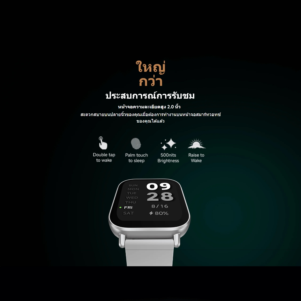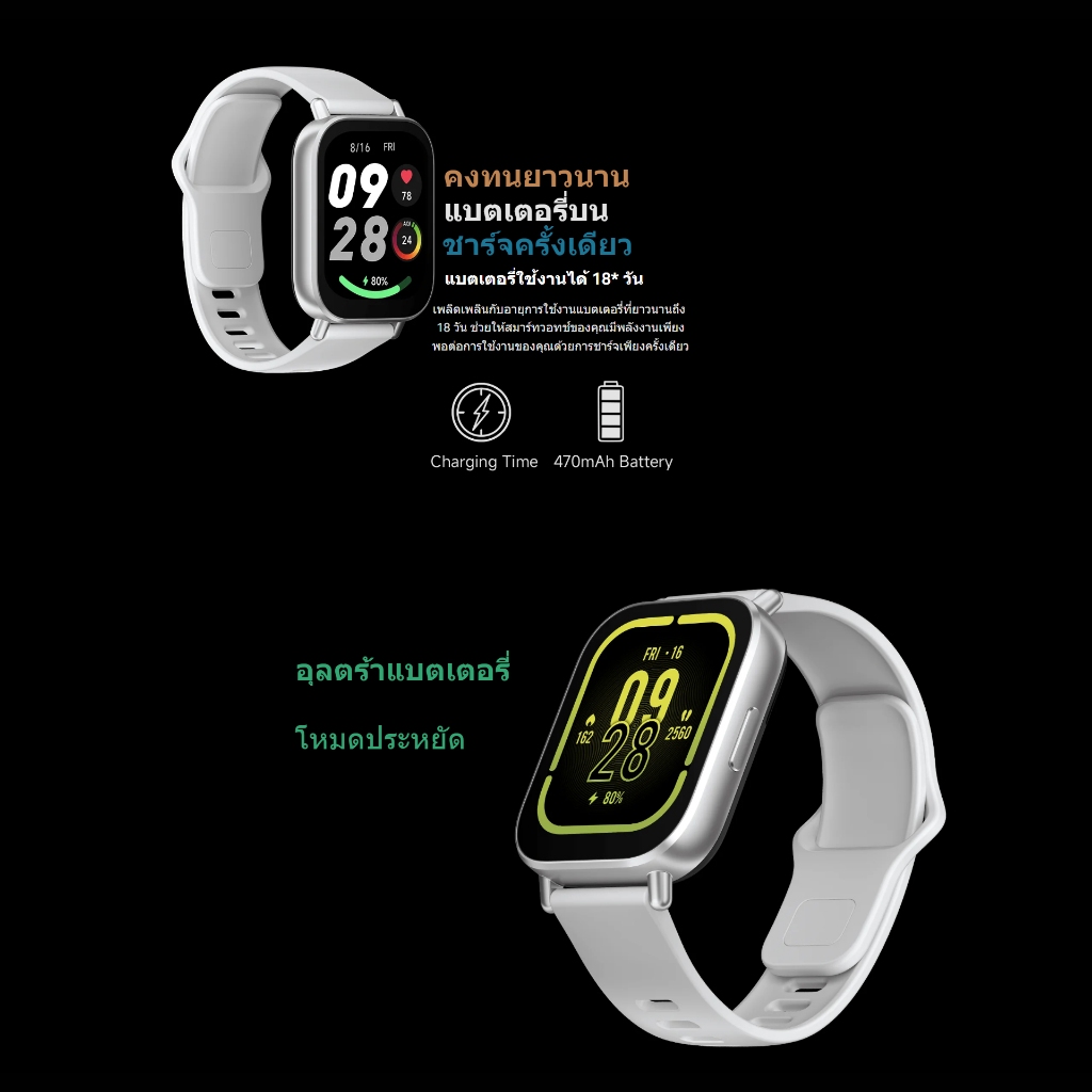 ... ผลสูงสุด 450 nits ช่วยให้อ่านได้ง่ายแม้อยู่ในแสงแดด ตรวจวัดค่าอัตราการเต้นหัวใจได้ ตรวจวัดค่าออกซิเจนในเลือดได้ ตรวจวัดค่าความเครียดได้ ตรวจวัดคุณภาพการนอนหลับได้ แบตอึดอยู่ได้นาน 18 วัน ใช้งานร่วมกับแอปฯ Mi Fitness ข้อมูลเชิงเทคนิค ขนาดและดีไซน์ ขนาด: 49.1×40.4×11.4 มิลลิเมตร (ไม่รวมสาย) น้ำหนัก: 41.67 กรัม วัสดุของตัวเครื่อง: กรอบโลหะ / ปุ่มกดพลาสติก ปุ่มกด: 1 ปุ่ม มาตรฐานกันน้ำ: 5 ATM วัสดุตัวสาย: ซิลิโคน / TPU ความยาวสาย: 135~200 มิลลิเมตร หน้าจอ หน้าจอแบบ LCD ขนาด 2 นิ้ว Resolution: 320*385 ความสว่าง: สูงสุด 450 nits แบตเตอรี่ ความจุแบตเตอรี่: 289 mAh วิธีการชาร์จ: ชาร์จแบบแม่เหล็ก ระยะเวลาการชาร์จ: 2 ชั่วโมง การใช้งานทั่วไปอายุการใช้งานแบตเตอรี่สูงสุด 18 วัน โหมดใช้งานหนักอายุการใช้งานแบตเตอรี่สูงสุด 8 วัน เซ็นเซอร์ สุขภาพ: วัดอัตราการเต้นของหัวใจ / ความอิ่มตัวของออกซิเจนในเลือด / ระดับความเครียด แบบเรียลไทม์ 24 ชั่วโมง การเชื่อมต่อ: Bluetooth ® 5.3 แอปพลิเคชัน: Mi Fitness App ------------------------------------------------------------ Redmi Watch 3 Active สมาร์ทวอทช์ราคาประหยัดแบรนด์ลูกของ Xiaomi หน้าจอ LCD 1.83 นิ้ว สวยคมชัด มาตรฐาน 5 ATM กันน้ำลึกถึง 50 เมตร มีโหมดกีฬาให้ใช้ถึง 100+ โหมด หน้าปัดหลากสไตล์ 200+ รูปแบบ มีไมค์และลำโพงในตัว โทรด้วยเสียงผ่านบลูทูธ ®️ สามารถรับสายได้เพียงแค่ยกมือขึ้น ความสว่างของจอแสดงผลสูงสุด 450 nits ช่วยให้อ่านได้ง่ายแม้อยู่ในแสงแดด ตรวจวัดค่าอัตราการเต้นหัวใจได้ ตรวจวัดค่าออกซิเจนในเลือดได้ ตรวจวัดค่าความเครียดได้ ตรวจวัดคุณภาพการนอนหลับได้ แบตอึดอยู่ได้นาน 12 วัน ใช้งานร่วมกับแอปฯ Mi Fitness ข้อมูลเชิงเทคนิค ขนาดและดีไซน์ ขนาด: 46.94×38.88×10.94 มิลลิเมตร (ไม่รวมสาย) น้ำหนัก: 41.67 กรัม วัสดุของตัวเครื่อง: กรอบโลหะ / ปุ่มกดพลาสติก ปุ่มกด: 1 ปุ่ม มาตรฐานกันน้ำ: 5 ATM วัสดุตัวสาย: ซิลิโคน / TPU ความยาวสาย: 135~200 มิลลิเมตร หน้าจอ หน้าจอแบบ LCD ขนาด 1.83 นิ้ว Resolution: 240×280 ความสว่าง: สูงสุด 450 nits แบตเตอรี่ ความจุแบตเตอรี่: 289 mAh วิธีการชาร์จ: ชาร์จแบบแม่เหล็ก ระยะเวลาการชาร์จ: 2 ชั่วโมง การใช้งานทั่วไปอายุการใช้งานแบตเตอรี่สูงสุด 12 วัน โหมดใช้งานหนักอายุการใช้งานแบตเตอรี่สูงสุด 8 วัน เซ็นเซอร์ สุขภาพ: วัดอัตราการเต้นของหัวใจ / ความอิ่มตัวของออกซิเจนในเลือด / ระดับความเครียด แบบเรียลไทม์ 24 ชั่วโมง การเชื่อมต่อ: Bluetooth ® 5.3 แอปพลิเคชัน: Mi Fitness App อุปกรณ์ภายในกล่อง 1× นาฬิกาอัจฉริยะ Redmi Watch 3 Active 1× สายชาร์จแม่เหล็ก 1× คู่มือการใช้งาน -️ เงื่อนไขการรับประกัน 1.สินค้าของแท้ 100% รับประกันศูนย์ไทย1ปี เงื่อนไขการรับประกันบางกรณีอาจมีค่าใช้จ่ายเพิ่มเติมค่ะ 2.กรณีสั่งสินค้าผิดรุ่น ผิดสี ทางร้านขอสงวนสิทธิ์ไม่รับเปลี่
