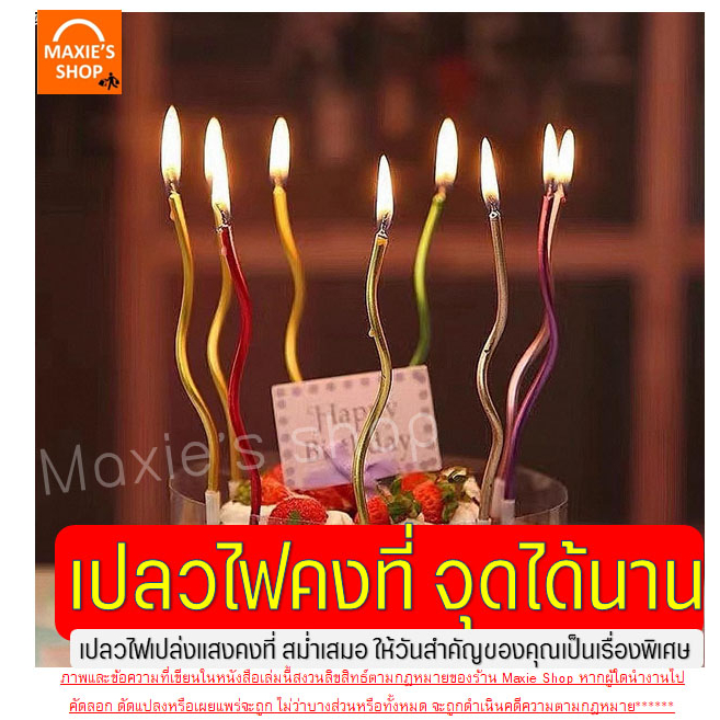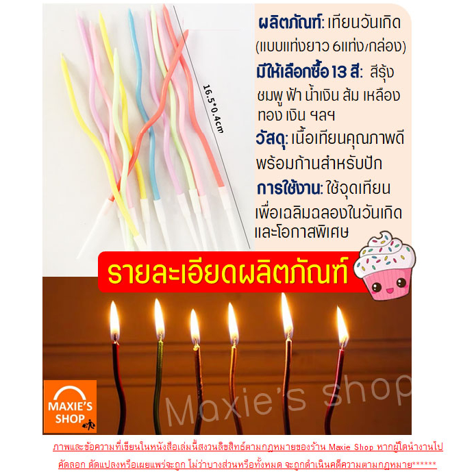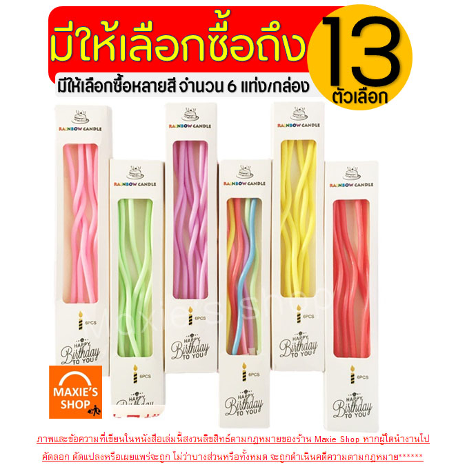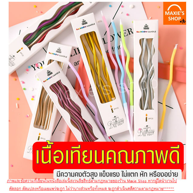 เทียนวันเกิดแฟนซี แท่งยาว เกลียว แบบเป่าดับ บรรจุ 6 แท่ง/กล่อง MAXIE (มีให้เลือกซื้อมากถึง 10 สี ได้แก่ รุ้ง ชมพู น้ำเงิน ส้ม เขียว ฟ้า ทอง ม่วง แดง) รายละเอียดสินค้า ผลิตจากเนื้อเทียน คุณภาพดี มีความคงตัวสูง ไม่แตก หัก หรืององ่าย ให้เปลวคงที่ ส่องสว่างได้ยาวนาน มอบประสบการณ์ที่ดีให้กับโอกาสพิเศษ