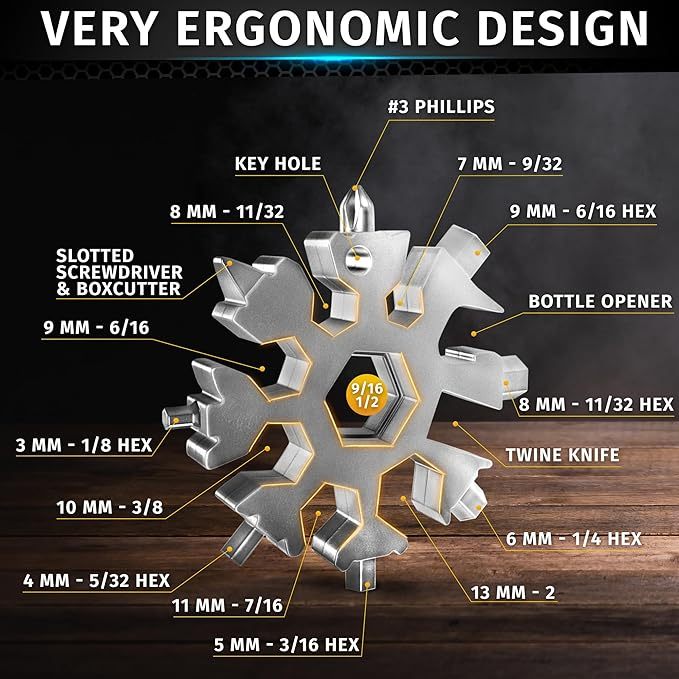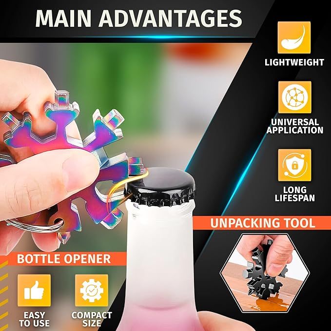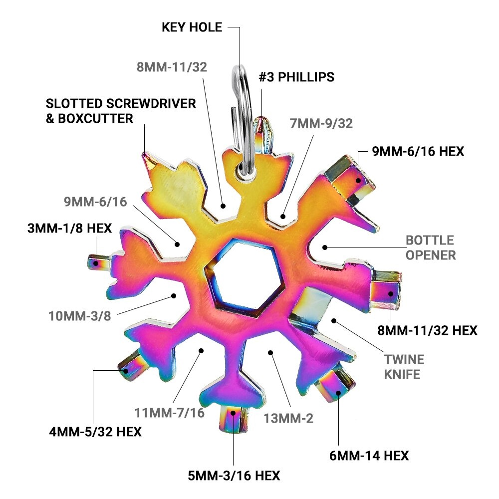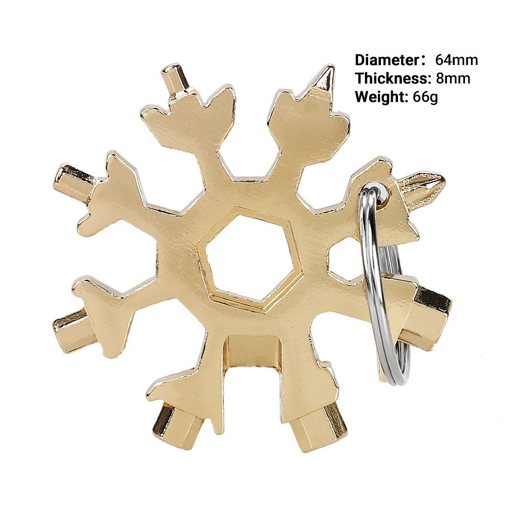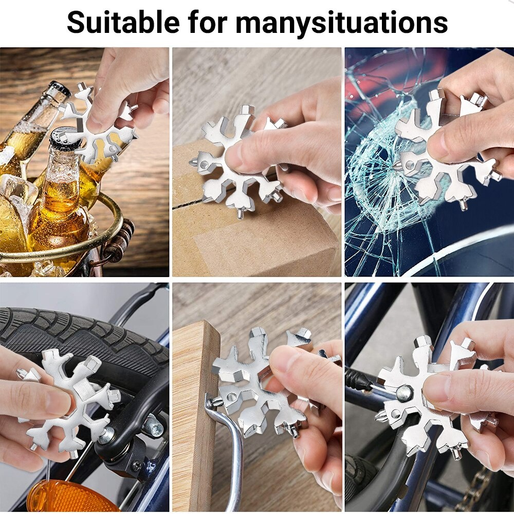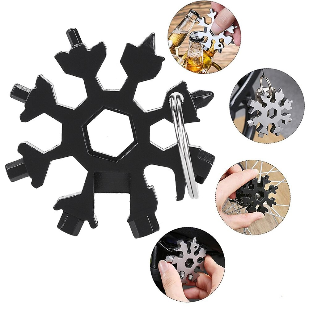 คุณสมบัติ: 1. ประแจเกล็ดหิมะมัลติฟังก์ชั่น 18-in-1 คุณสามารถใช้เพื่อขันสกรู ซ่อมจักรยาน สโนว์บอร์ด เปิดกล่อง ฯลฯ. มันยังสามารถใช้เป็นที่เปิดขวด. 2. ประแจทำจากโลหะผสมซึ่งแข็ง ทนต่อการสึกหรอ และทนทาน. 3. สามารถแก้ไขได้บนพวงกุญแจเป็นพวงกุญแจ และสะดวกมากที่จะใส่ในกระเป๋าเป้ กระเป๋าเดินทาง และกางเกง
