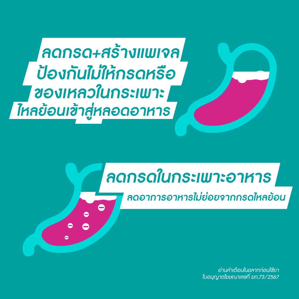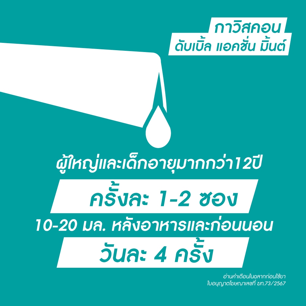 กาวิสคอน ดับเบิ้ล แอคชั่น รสมิ้นต์ • รักษาหลากหลายอาการจากกรดไหลย้อน • ยาบรรเทาอาการแสบร้อนกลางอก อาหารไม่ย่อยจากกรดไหลย้อน • ยาสามัญประจำบ้าน อ่านคำเตือนในฉลากก่อนใช้ยา • ลดกรด+สร้างแพเจล ป้องกันไม่ให้กรดหรือของเหลวในกระเพาะไหลย้อนเข้าสู่หลอดอาหาร • ลดกรดในกระเพาะอาหาร ลดอาการอาหารไม่ย่อย