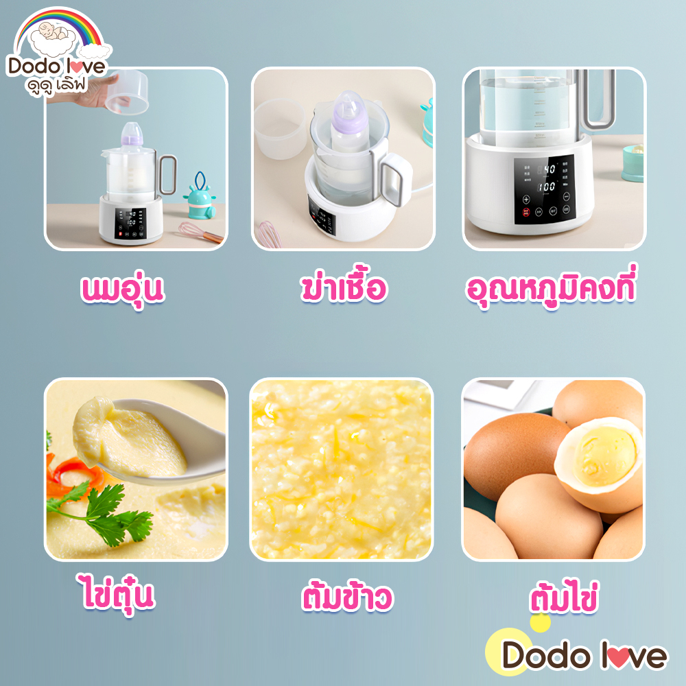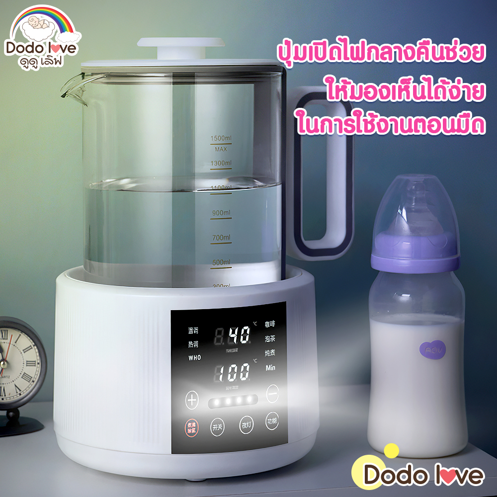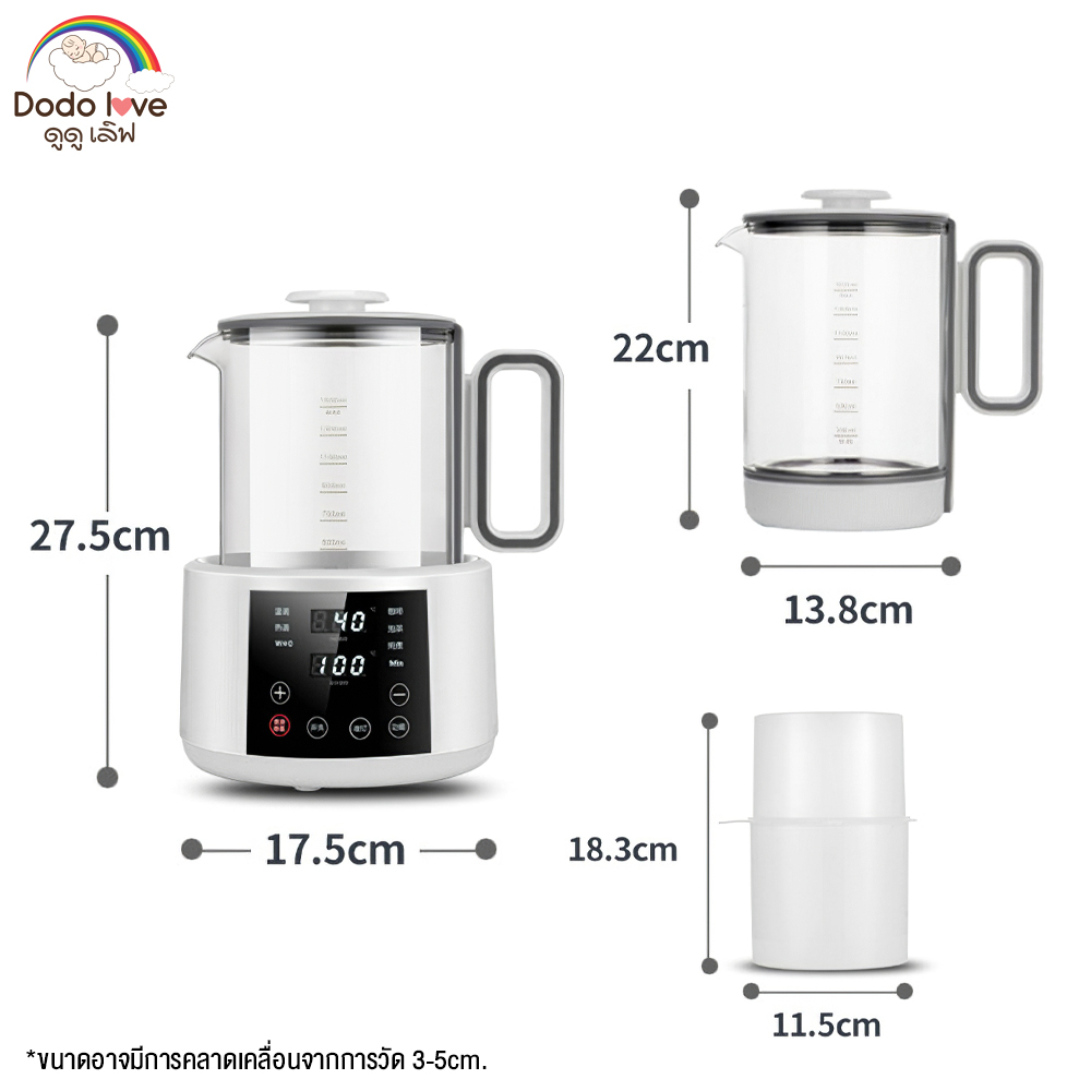 ... นชงนม อุ่นขวดนม ทำชา กาแฟ ➦มีหน้าจอดิจิตอลแสดง อุณหภูมิปัจจุบัน / กับอุณหภูมิที่กำหนดของเครื่อง ➦มีฟังก์ชั่น ต้มกำจัดคลอรีน ลดปริมาณคลอรีนในน้ำ ทำให้ดื่มได้อย่างปลอดภัยดีต่อสุขภาพ ➦ปริมาณความจุ 1500 ml. / มาพร้อมกับ ตะแกรงพลาสติกสำหรับใช้วางขวดนม ➦ปุ่มเปิดไฟกลางคืนช่วยให้มองเห็นได้ง่าย ในการใช้งานตอนมืด ➦แรงดันไฟฟ้า 220 โวลต์ / ความถี่ 50 Hz. /กำลังไฟ 800 วัตต์ ฟังก์ชั่นบนจอเครื่อง - (ปรับความอุ่น) อุณหภูมิอัตโนมัติที่ 45 องศา ปรับอุณหภูมิได้สูงสุด 50 องศา (เหมาะสำหรับชงนมผง หรือ น้ำอุ่น) - (เพิ่มความร้อน) อุณหภูมิอัตโนมัติที่ 55 องศา ปรับอุณหภูมิได้สูงสุด 65 องศา (เหมาะสำหรับชงนมผง หรือ ละลายน้ำผึ้ง หรือน้ำหวาน) - (WHO) (โหมดความร้อนสูง) อุณหภูมิอัตโนมัติที่ 70 องศา ปรับอุณหภูมิได้สูงสุด 80 องศา (เหมาะสำหรับละลายข้าว หรือ อาหารเสริม) - (กาแฟ) อุณหภูมิอัตโนมัติที่ 85 องศา ปรับอุณหภูมิได้สูงสุด 90 องศา (เหมาะสำหรับชงกาแฟผงสำเร็จรูป) - (ชงชา) อุณหภูมิอัตโนมัติที่ 90 องศา ปรับอุณหภูมิได้สูงสุด 95 องศา (เหมาะสำหรับชงชา หรือ ใบชา) - (ตุ๋น) อุณหภูมิอัตโนมัติที่ 100 องศา กำหนดเวลา 120นาที สามารถตั้งเวลาได้ถึง 150 นาที (เหมาะสำหรับฆ่าเชื้อขวดนม) - (กำจัดคลอรีน) เพื่อต้มกำจัดคลอลีนในน้ำ หลังจากนั้นอุณหภูมิจะค่อยๆสูงจนถึง 100 องศา (เมื่อถึง 100 องศาแล้วแนะนำให้กดออก) - (ไฟกลางคืน) จะมีแสงไฟส่องตอนกลางคืนช่วยให้มองเห็นในที่มืด วิธีการใช้งาน - เทน้ำใส่เหยือก ไม่ควรให้เกินขีด 1500 ml. - กดโหมด กำจัดคลอรีน (จะกดใช้หรือไม่ใช้ก็ได้) เพื่อต้มกำจัดคลอลีนในน้ำ อุณหภูมิจะค่อยๆสูงจนถึง 100 องศา - เมื่ออุณหภูมิถึง 100 องศา กดยกเลิก โหมด (กำจัดคลอรีน) - มีฟังก์ชั้นให้เลือกตามความต้องการ (สามารถอ่านได้ในรายละเอียดสินค้า) - อุณหภูมิของน้ำในเหยือกจะค่อยๆเพิ่ม/ลด เพื่อให้เท่ากับอุณหภูมิของฟังก์ชั่นที่ตั้งไว้และจะคงที่ตลอดเวลา จนกว่าจะปรับเปลี่ยน ฟังก์ชั่นหรือปรับอุณหภูมิ - ถอดปลั๊กทุกครั้งเมื่อไม่ใช้งาน ข้อแนะนำ - โปรดอ่านคู่มือก่อนการใช้งาน - อุปกรณ์ทำความร้อน โปรดใช้ความระมัดระวังในการใช้งาน - ห้ามวางผลิตภัณฑ์ใกล้มือเด็ก ขนาดและน้ำหนักสินค้า ➦ขนาดสินค้า (กว้างxยาวxสูง) cm. ➦น้ำหนักของสินค้า kg. (ขนาดอาจมีการคลาดเคลื่อนจากการวัด 3-5 cm.)