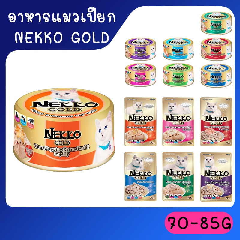 Nekko Gold อาหารเปียกแมวแบบกระป๋อง ขนาด 85g ส้ม(แพคเกจเดิมชมพู) = ปลาทูน่าหน้าคัตทสึโอะบูชิในเยลลี่ ชมพู(แพคเกจเดิมน้ำเงิน) = ปลาทูน่าและไก่หน้ากุ้งและหอยเชลล์ในเยลลี่ แดง(แพคเกจเดิมส้ม) = ปลาทูน่าหน้าปลาแซลมอนในน้ำเกรวี่ เขียวเข้ม(แพคเกจเดิมแดง) = ปลาทูน่าและเนื้อไก่ในน้ำเกรวี่ น้ำเงิน(รสใหม่)