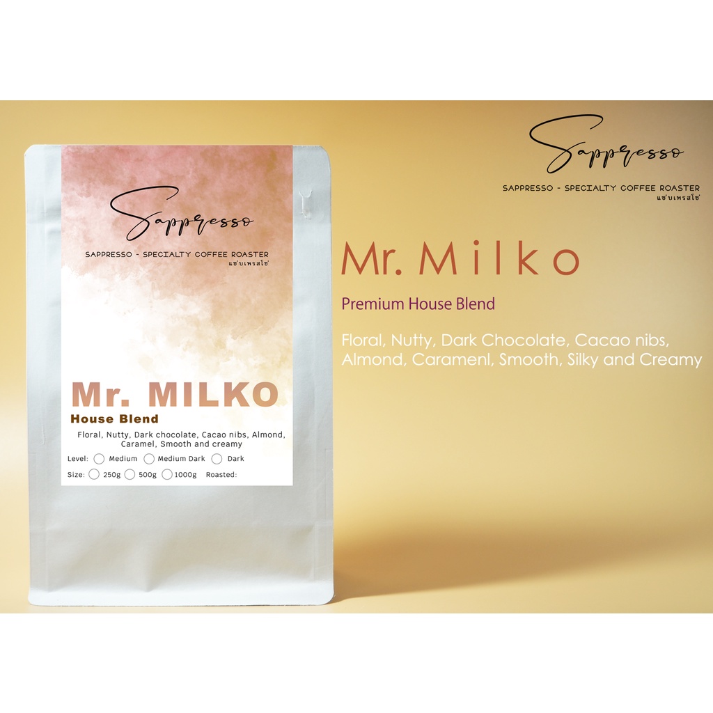 ... ามก็ไม่บอกด้วยแหละ) House Blend ตัวนี้จะเป็นการผสมกันระหว่าง Laos และ Brazil(ไม่บอกว่าตัวไหน) ด้วยสัดส่วนที่บอกได้เลยว่า อร่อยแน่นอน ร้อนดี เย็นแจ่ม ที่ได้ชื่อว่า Mr.Milko ก็เพราะทำออกมาเพื่อให้คู่กับนมโดยเฉพาะ รับประกันความอร่อยแน่นอน รวมความโดดเด่นของแต่ละตัวมารวมกัน ช็อคโกแล็ตอร่อยๆ รสถั่วเน้นๆ มีความสูมท เนียนๆนัวๆ บอดี้ที่กำลังดี ไม่หนักจนเกินไป มีความดอกไม้ๆ ด้วย. ด้วยสไตล์การคั่วของ Sappresso ที่สะสมประสบการณ์คั่วกาแฟที่ปัจจุบันมากกว่า 5000+ Batch และคิดค้นโปรไฟล์การคั่สกาแฟตัวนี้ออกมาเป็นอย่างดี เพื่อให้มีเอกลักษณ์ของกาแฟที่ดึงไปทางหวาน ทำให้สามารถสกัดกาแฟออกมาได้รสชาตดีลงตัว ทางร้านเราใส่ใจในทุกๆกระบวนการ ทั้งการเก็บรักษาเมล็ดกาแฟดิบ(สารกาแฟ หรือ Green bean) การคัดเมล็ดทั้งก่อนคั่วและหลังคั่ว โดยทางร้านได้เลือกใช้เครื่องมือในการคัดเศษหิน สิ่งแปลกปลอมที่ปะปนมากับกาแฟที่มีมาตรฐานที่เป็นที่ยอมรับ อีกทั้งหลังจบกระบวนการนี้ยังส่งต่อให้เจ้าหน้าที่คัดเมล็ดด้วยมืออีกต่อ ด้วยประสบการณ์คัดเมล็ดที่มีมากกว่า 4 ปี โดยจะคัดเมล็ดที่เป็น Defects ออกทั้งหมด ไม่ว่าจะเป็นพวก หูช้าง สีด่าง Baked และอีกหลายๆจำพวกที่ไม่ผ่านเกณฑ์ของทางร้าน เพื่อให้ได้คุณภาพที่ดีรวมไปถึงความคุ้มค่าที่ลูกค้าได้จ่ายเงิน อีกทั้งในกระบวนการคั่วทางร้านได้ใช้เครื่องคั่วที่มีมาตรฐานและระบบที่ดี รวมไปถึงการเลือกใช้เครื่องกำจัดควันและกลิ่น(ESP) แถมยังต่อพ่วงระบบ Wet Scrubber(การบำบัดด้วยน้ำ) ที่มีหัวฉีดกระจายน้ำแรงดันสูง และระบบหมุนเวียนน้ำ เพื่อลดการก่อมลภาวะต่อลิ่งแวดล้อมอย่างสูงสุด หรือเรียกง่ายๆว่า ควัน 100%. กลิ่น 99.99% แทบจะไม่รู้เลยว่ามีการคั่วกาแฟ Process: Washed and Natural Country: Brazil, Laos Taste: Floral, Nutty, Dark Chocolate, Cacao nibs, Almond, Caramel, Smooth, Silky and Creamy Net weight: 250g, 500g, 1000g