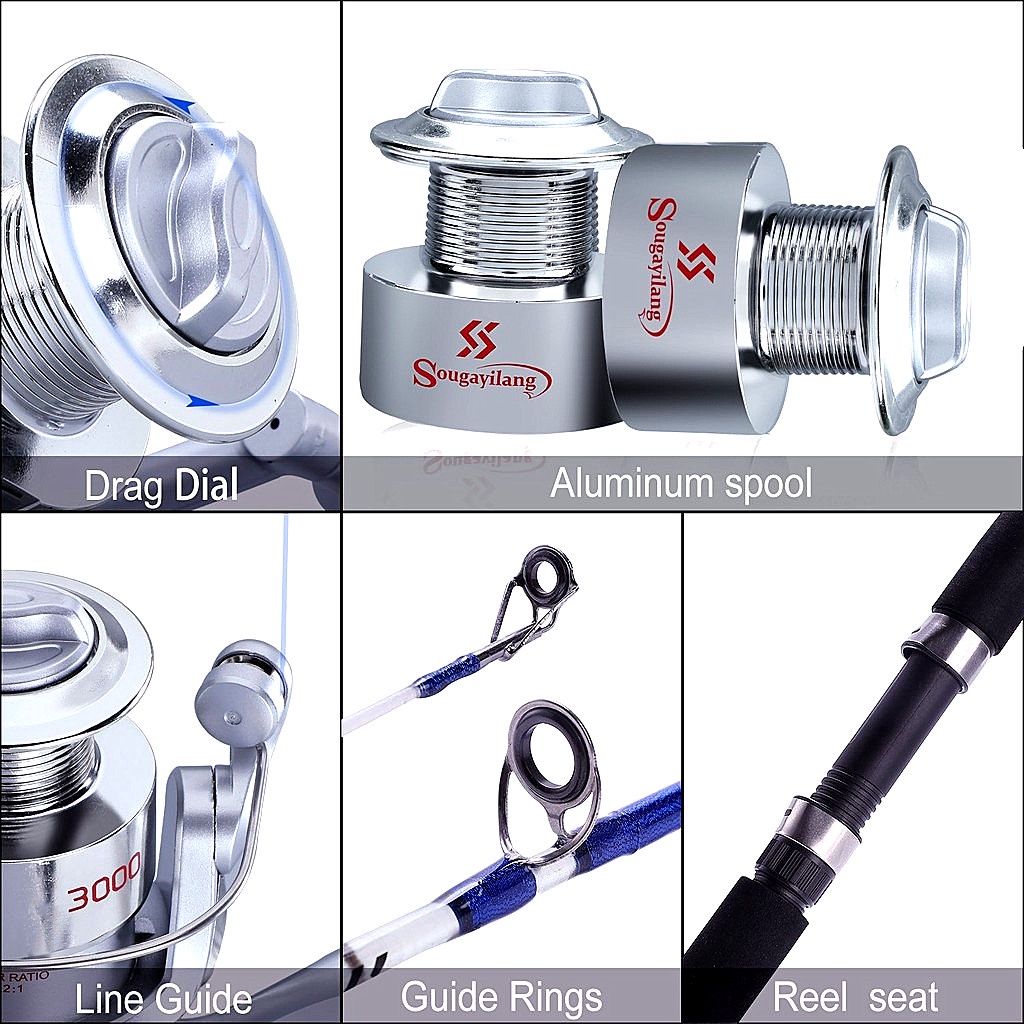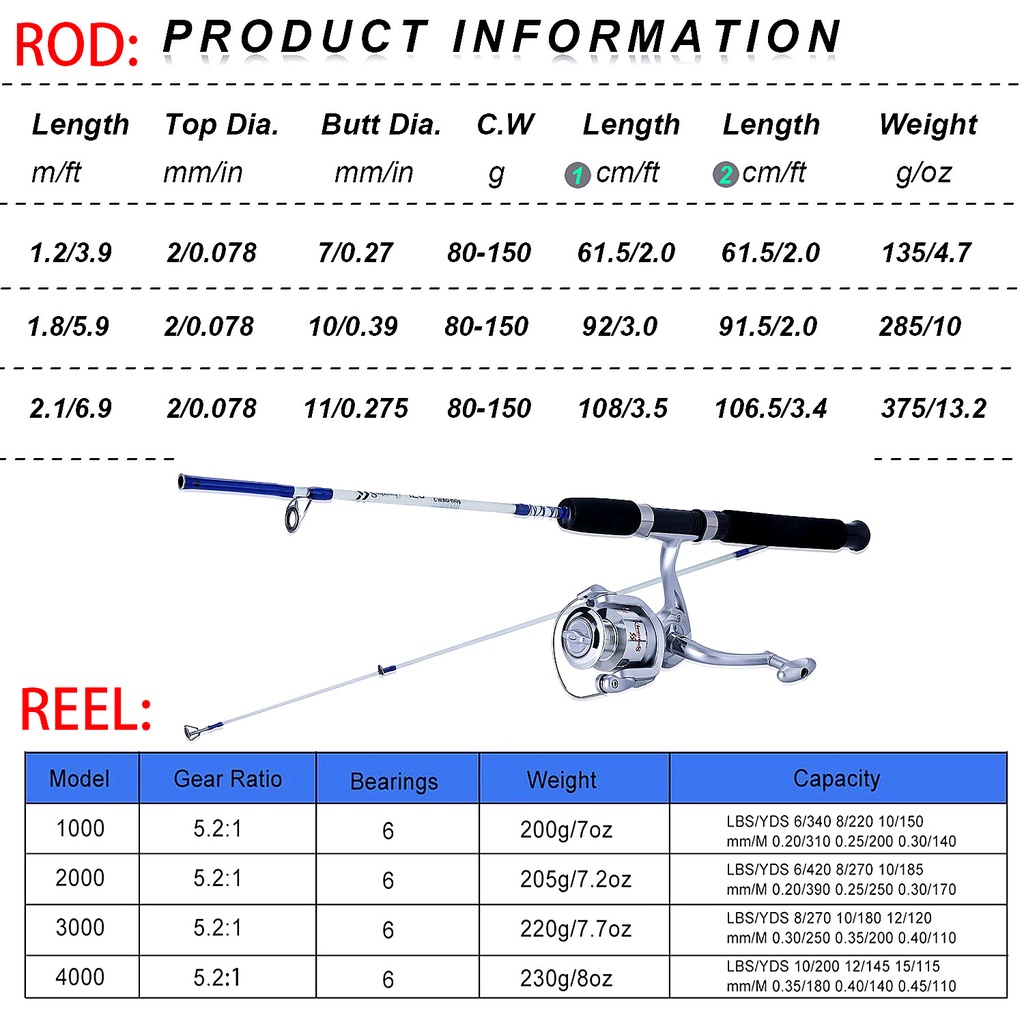 ... /200 12/145 15/115 MM/M: 0.35/180 0.40/140 0.45/110 2.อัตราทดเกียร์: 5.2:1 3.แบริ่ง: 6bb 4.Wight(g/oz): 200/7; 1/205/7; 1/220/7 5.ประเภทรอกตกปลา: รอกหมุน คันเบท คุณสมบัติ 1.ประเภท: ปั่นคัน,คันเรือ 2.ความยาวส่วนขยาย: 1.2M 1.8M 2.1M 3.ส่วน: 2 ส่วน (ส่วนล่าง + ส่วนบนM & MH) 4.น้ำหนักก้าน: 135g/4.76oz 285/10oz 375/ 3.2oz 5.น้ำหนักสูงสุด: 10 กิโลกรัม 6.กำลังไฟ: M & MH 7.น้ำหนักเหยื่อล่อ: 10-28 กรัม 8.น้ำหนักสาย: 8-16lb 9.สี: สีฟ้า 10.วัสดุ: เรซินABS 11.ความสามารถในการลากสูงสุด: 10kg หมายเหตุ 1 ส่วน = 61.5CM/2ft 2 ส่วน = 61.5CM/2ft M/MHหมายถึงความแข็งที่แตกต่างกันในตอนท้ายของคันเบ็ดMHยากกว่าM แพคเกจ 1 xประมงรีล 1 xประมงRod or 1 xประมงรีล 1 xประมงRod 1 * สายเบ็ด 1 * เบ็ด