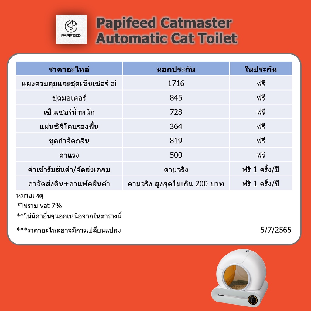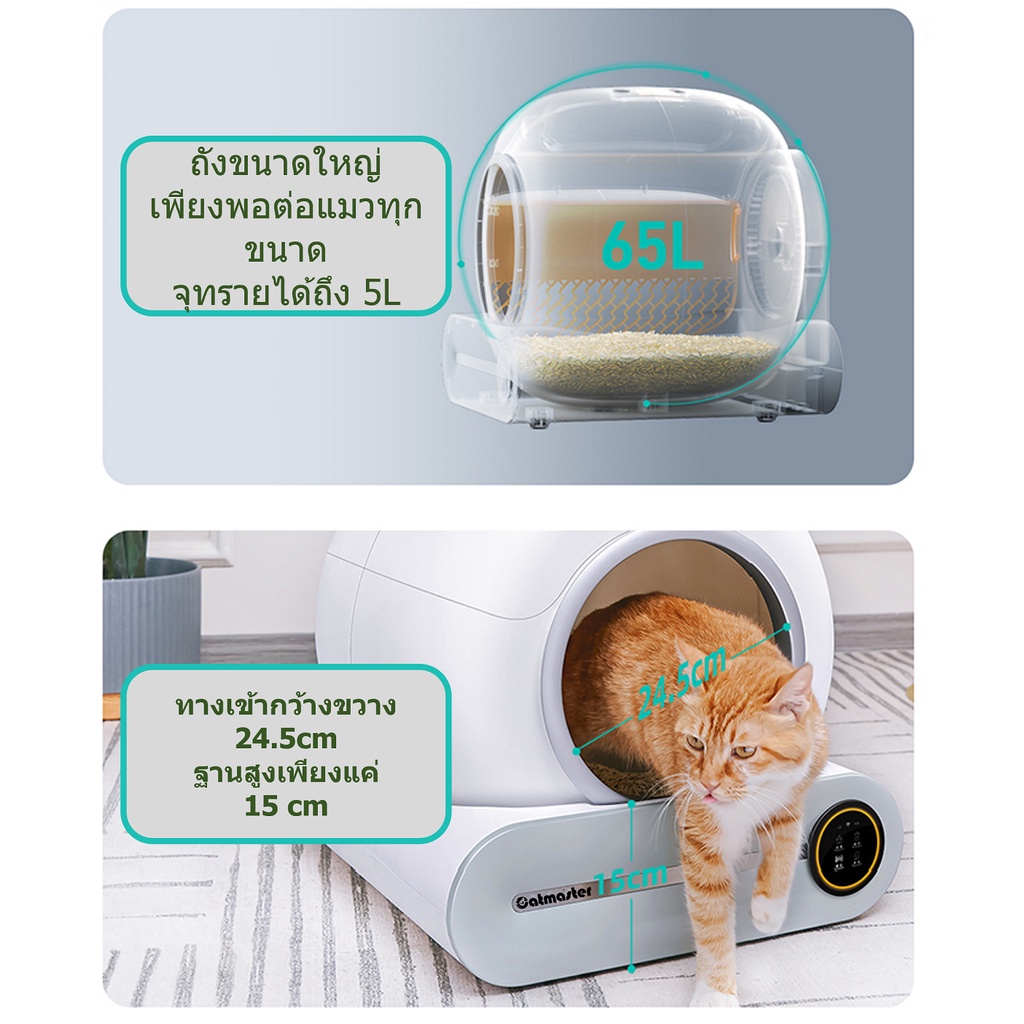 ... ้อ ]]]]]]]] ร้านโค๊ดคุ้ม ลดเพิ่มสูงสุดถึง 1000 ที่นี่ https://shope.ee/5piU9QoHsv ใช้เถอะ มันลดให้ วิธีใช้โค๊ด https://shopee.co.th/m/xtra-shops-faqs ใช้มือถือในการสั่งเพื่อใช้โค๊ด shopee ใบกำกับภาษี e-tax สามารถออกได้ สินค้ามีขนาดใหญ่ สามารถสั่งได้แค่ เครื่องเดียวต่อ 1 ออเดอร์ และไม่สามารถปนสินค้าอื่นได้ (ขนาดจะเกิน) ***กรุณาเก็บกล่องสินค้าไว้ตลอดการใช้งาน*** Papifeed Catmaster สุดยอดห้องน้ำอัตโนมัติที่สุดดังนี้ 1.ปลอดภัย 100% ไม่มีส่วนที่สามารถหนีบน้องแมวได้เลย 2.เก็บกลิ่นดีที่สุด ด้วยดีไซน์ช่องเก็บแบบมิดชิดด้านบน และระบบดำจัดกลิ่นไฟฟ้า 3.จุดีที่สุด ด้วยดีไซน์ที่ทำให้ทรายถูกเก็บได้มากกว่า 4.รูปทรงเตี้ย กระทัดรัดหมดกังวลเรื่องการปีนป่ายของแมวี 5. ชิ้นส่วนที่ถูกทรายถอดล้างทำความสะอาดได้ทั้งหมด ส่วนที่ถูกทรายได้จะมีเพียงชิ้นส่วนเดียวของทั้งเครื่อง 6. เชื่อมต่อแอพ ตรวจสอบข้อมูลสุขภาพแมว น้ำหนัก ระยะเวลาในการขับถ่าย [[[[[[คำแนะนำการใช้ทราย ]]]]]]]] ทรายแมวที่ใช้ได้ จะใช้ทรายแมวได้ทุกชนิด ยกเว้นทรายแมวทีมีแท่งยาว เช่นทรายเต้าหู้บางชนิด หรือทรายที่มีน้ำหนักเบามากเกินไป หากพบปัญหาทรายดีลงถุงทิ้งที่เกิดจากลักษณะทราย ควรเปลี่ยนทรายที่สั้นลง ทรายลักษณะเกล็ด หรือเปลี่ยนประเภททราย ไม่ฉะนั้นทรายจะไม่ผ่านตะแกรงและลงไปอยู่ในถุงทิ้งจำนวนมากได้ แนะนำทรายภูเขาไฟ ทรายเบนโทไนต์ ทรายไร้ฝุ่น [[[[[[ความปลอดภัยและการใช้งาน]]]]]]]] ความปลอดภัยขั้นสุด ไร้การหนีบ 100% + เซ็นเซอร์หยุดเครื่องเมื่อน้องเข้าไป + เซ็นเซอร์ตรวจจับความเคลื่อนไหว ถังจุของเสียได้ 15-30 วัน ป้องกันกลิ่นของเสียรั่วไหลแบบเก็บกลิ่น และกำจัดกลิ่นไฟฟ้า มีโหมดทิ้งทรายในการกดครั้งเดียว เชื่อมต่อแอพ Tuya มาตรฐาน Smartlife ใช้งานได้สะดวก ได้ทั้ง Android, IOS ,IPADOS ทำงานได้ทุกอุปกรณ์ ทางเข้าสูง 15 ซม เตี้ยสุดๆน้องแมวชอบใจ ด้านหน้าเครื่องมีร่องดักทรายแมว ช่วยลดทรายตกลงมายังพื้นได้ ความปลอดภัยขั้นสุดเพราะปลอดภัยตั้งแต่ต้น ด้วยการทำงานที่ "ไร้จุดเสี่ยง" ไม่จำเป็นต้องมีเซ็นเซอร์กันหนีบเพราะ "ไม่มีการหนีบ 100%" รุ่นอื่นๆมีเซ็นเซอร์ความปลอดภัยจำนวนมาก เพราะมีจุดเสี่ยงจำนวนมาก ห้องน้ำแมว Catmaster ของเรา ไร้จุดเสี่ยง 100% คุณจะฝากความปลอดภัยไว้กับเซ็นเซอร์ป้องกันอันตราย หรือฝากไว้กับเครื่องที่ปลอดภัยตั้งแต่ต้น การทำงานของเครื่อง 1. ทำงานเก็บอัตโนมัติ 2. เปิดระบบกำจัดกลิ่นอัตโนมัติหลังทำงานเสร็จ 3. โหมดทิ้งทราย สั่งทิ้งทรายลงถุงขยะทั้งหมดได้ในปุ่มเดียว 4. ตั้งค่าให้ทำงานตามเวลาด้วยตัวเอง และตั้งค่าต่างๆในแอพได้เช่น โหมดไม่รบกวน ตั้งไม่ให้ทำงานถี่เกินไป ตั้งให้ร