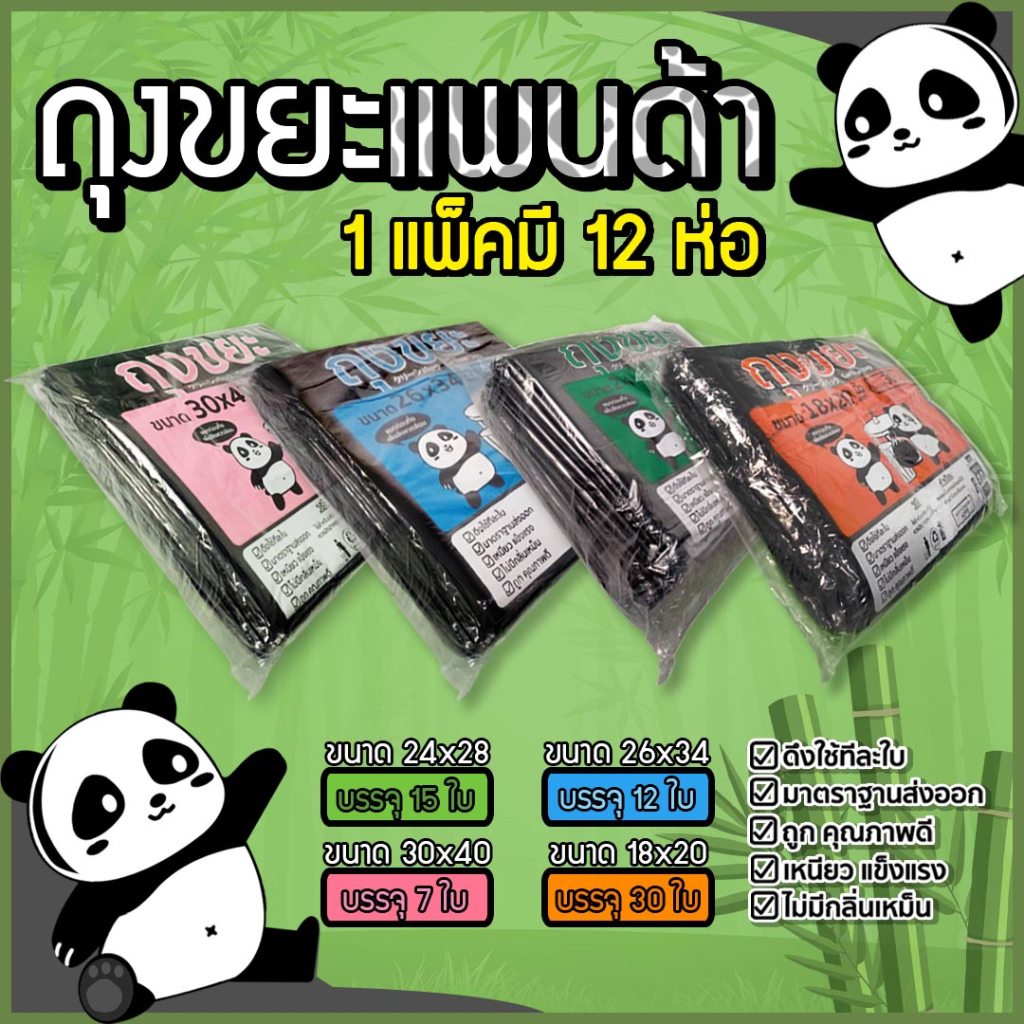 [แพ็ค 12 ห่อ] ถุงขยะแพนด้า เหนียว ทนทาน ไร้กลิ่น ไร้สารเคมีตกค้าง คุณภาพดี มี 4 ขนาด