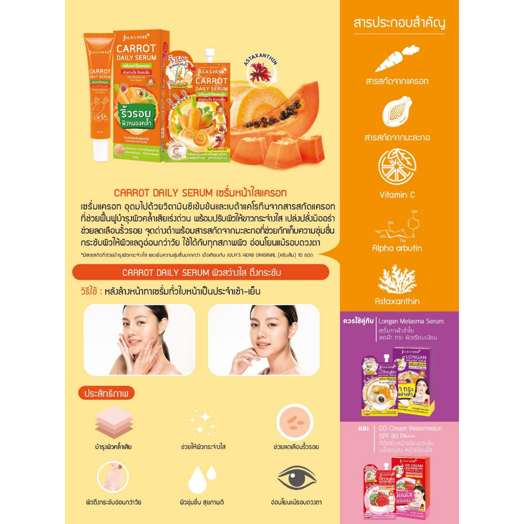 ... รอท ช่วยฟื้นฟูให้สีผิวเรียบเนียนสม่ำเสมอ เบต้าแคโรทีนในแครอทเปลี่ยนเป็นวิตามิน A ช่วยให้ผิวสุขภาพดี สารต้านอนุมูลอิสระช่วยสร้างคอลลาเจนซึ่งเป็นโปรตีนสำคัญสำหรับความยืดหยุ่นของผิว ลดริ้วรอย ชะลอการแก่ ลดความหมองคล้ำ และจุดด่างดำ สีผิวที่ไม่สม่ำเสมอ 🥭 สารสกัดจากมะละกอ ช่วยในการขจัดเซลล์ผิวที่ตายแล้วไป ช่วยให้ผิวนุ่มไม่หยาบกร้าน ลดการอุดตันในรูขุมขน ลดปัญหาของสิวเสี้ยนสิวอุดตัน มีส่วนผสมที่ช่วยต่อต้านอนุมูลอิสระ ให้ความชุ่มชื้นโดยไม่ทิ้งความมันบนผิว เผยผิวสะอาดใสไร้สิ่งตกค้าง 🍋 Vitamin C Encapsulated ช่วยให้ผิวขาวกระจ่างใสเรียบเนียน ลดจุดด่างดำ ผิวดูใสเปล่งประกายได้อย่างมีประสิทธิภาพ ☀️ Alpha arbutin มีหน้าที่ไปช่วยยับยั้ง oxidation ในร่างกายเรา ช่วยยับยั้งการสร้างเม็ดสีเมลานินโดยตรง โดยไม่ทำให้ผิวบางลง 👩🏻 Glutathione กลูต้าโธโอน ช่วยยับยั้งเอนไซม์ไทโรซิเนสที่เกี่ยวข้องกับการผลิตเม็ดสีผิว ช่วยให้ผิวขาวชมพูมากขึ้น และยังช่วยให้วิตามินซี และวิตามินอีทำงานได้ดียิ่งขึ้น >>> เหมาะกับผิวแบบไหน : เหมาะสำหรับผู้มีปัญหาสีผิวไม่สม่ำเสมอ ผิวหมองคล้ำ 🧡 วิธีใช้ : ใช้เป็นประจำเช้า-เย็น หลังทำความสะอาดผิวหน้า เพื่อให้ครีมบำรุงผิวมีประสิทธิภาพและให้ผลลัพธ์ที่ดียิ่งขึ้น แนะนำใช้ เซรั่มแครอท คู่กับดีดีครีมแตงโม และเซรั่มลำไย ตามนี้เลยจ้า 🥕บำรุงผิวด้วยเซรั่มหน้าใสแครอทจุฬาเฮิร์บ 🍇บำรุงผิวด้วยเซรั่มทาฝ้าลำไยจุฬาเฮิร์บ 🍉ทาดีดีครีมแตงโมจุฬาเฮิร์บ ก่อนออกแดด 15 นาที ⚠️ ข้อควรแนะนำ ⚠️ : ปราศจากสารอันตรายอย่างน้ำหอม และพาราเบน จึงเหมาะกับทุกสภาพสีผิว ⛔️ หมายเหตุ ⛔️ : หากเกิดอาการแพ้ควรหยุดใช้และแนะนำให้พบแพทย์ 📋 เลขที่จดแจ้ง 12-1-6200050472