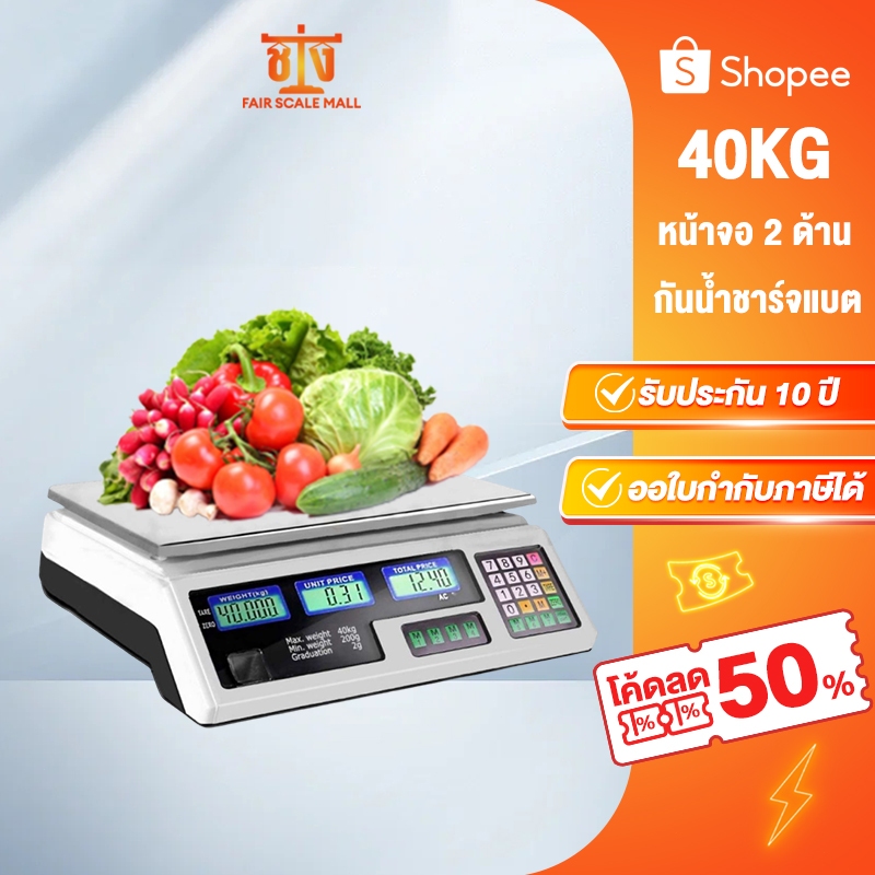 ตาชั่งดิจิตอล 40Kg คำนวนราคาได้ มีม.อ.ก. กันน้ำ แบบชาร์จแบต หน้าจอสองฝั่ง จำราคาได้ กิโลดิจิตอล