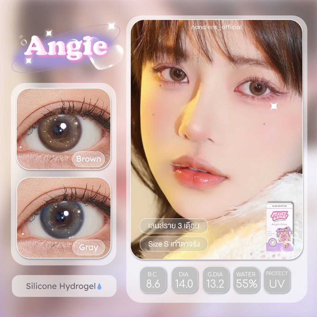 ♡ Brand : Many Lens ♡ Series : Angie ♡ Color : Brown/Gray ♡ Type : 3 months ♡ Dia : 14.0mm ♡ G.Dia : 13.2mm ♡ ค่าอมน้ำ : 55% ♡ ค่าสายตา 0.00 ถึง -8.00 ♡ เลนส์วัสดุ Silicone Hydrogel ♡ ป้องกัน UV