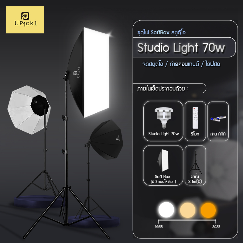 ... งไฟ Light Stand: 70-210cm (สามารถเลือกได้) (3.1) ขาตั้งไฟ Carbon Steel 2.1m (เหล็กกล้าคาร์บอน) ฟังก์ชั่นเสริม:สามารถเลือกได้ 1. (A)studioLight / Soft4(2ชุด)+ชุดขาตั้งเซลฟี่(C) 2. (B)studioLight / Soft8-ดำ(2ชุด)+ชุดขาตั้งเซลฟี่(C) 3. (C)studioLight / Soft8-ขาว(2ชุด)+ชุดขาตั้งเซลฟี่ (C) ขาตั้งเซลฟี่: 1. ขาตั้ง Carbon Steel 2.1m (คาร์บอน) 2. ข้อต่อปรับหมุน 360° 3. ที่จับมือถือหมุนล็อก (C) 4. รีโมทเซลฟี่ วิธีใช้งาน : 1. ประกอบอุปกรณ์เข้าด้วยกัน 2. จัดวางไฟในตำแหน่งที่ต้องการ 3. เปิดใช้งานอุปกรณ์ 4. เสร็จสิ้น คำเตือน: 1.ไม่ควรใช้ปลั๊กร่วมกับอุปกรณ์ไฟฟ้าเป็นจำนวนมาก 2. ไม่ควรใช้ในพื้นที่ที่อากาศร้อนสูง รายละเอียดสินค้า: UPick1 ชื่อสินค้า: ชุดไฟสตูดิโอ ขั้วหลอด: E27 กำลังไฟ:70W ความสว่าง:10-100% วัสดุหลอดไฟ : Aluminium+ PC CCT :3200-5500k / (ขาว อุ่น วอม) CRI : >93 TLCI : >93 Lumen: 2256lm Lux: 2630lx Operation Temperature : 40-50° AC Power Supply : 110-240V~ 50/60Hz ขนาดสินค้ารวม: 14*36*87cm น้ำหนักรวม:2.1kg เหมาะสำหรับ:เริ่มต้น / เพิ่มความสว่าง / จัดสตูดิโอถ่ายภาพหรือวีดีโอ *หมายเหตุ* หากต้องการให้ร้านออกใบกำกับภาษี/ใบเสร็จ/บิลเงินสด หรือสินค้ามีปัญหา รบกวนแจ้งมาที่ช่องแชทได้เลยครับ